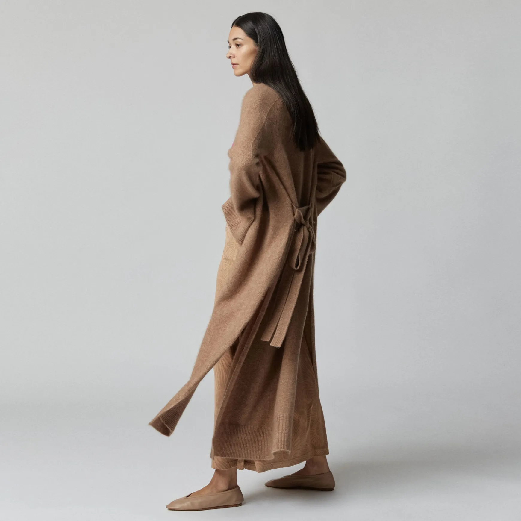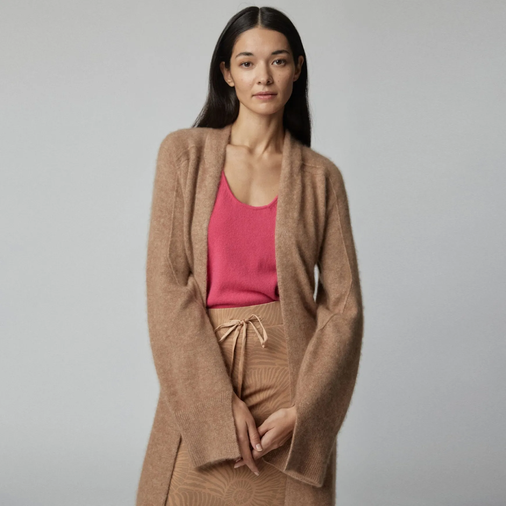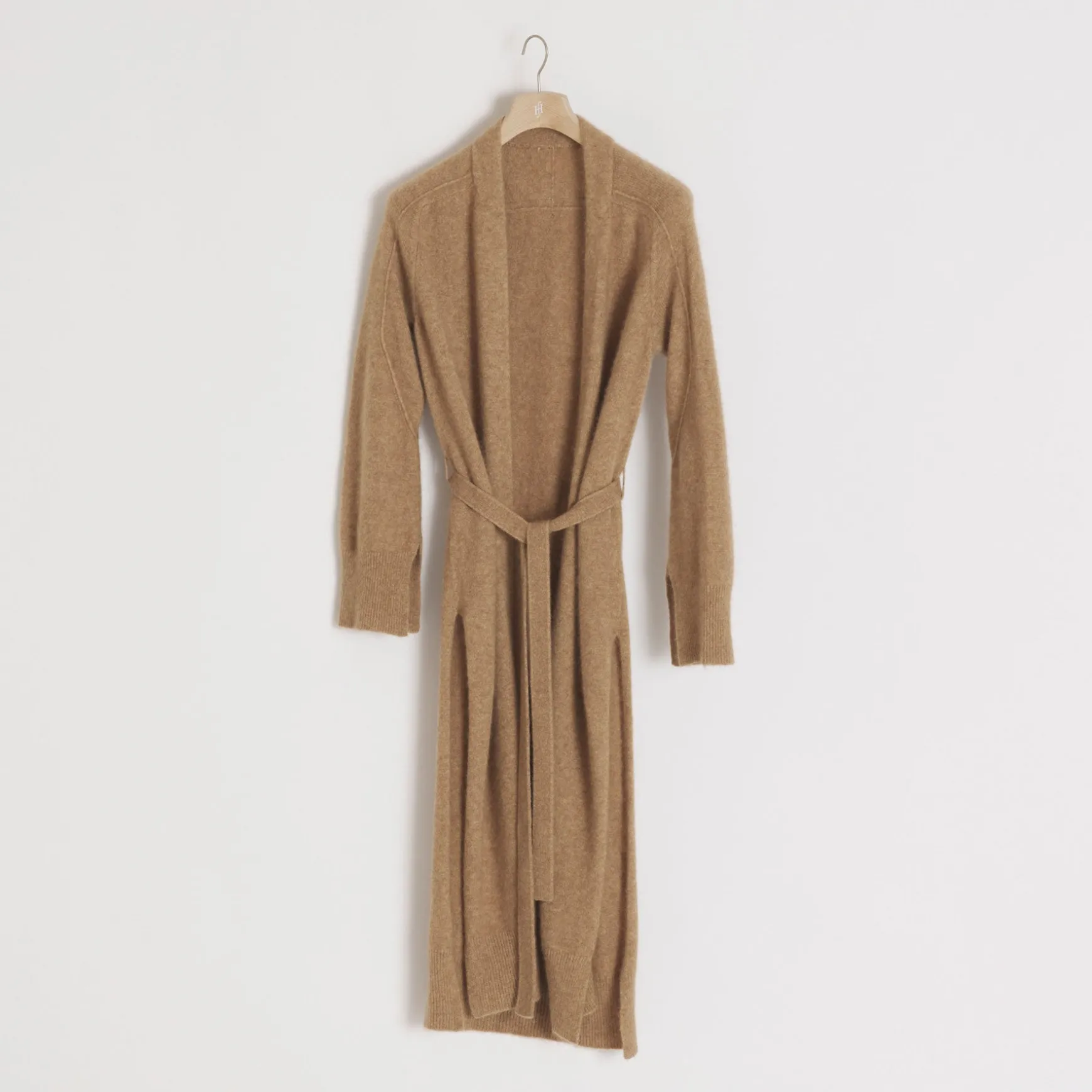 Edelste Handarbeit aus feinem Seide-Cashmere Garn. Der Cardigan überzeugt vor allem mit den seitlichen Schlitzen und dem Bindegürtel für die Taille.