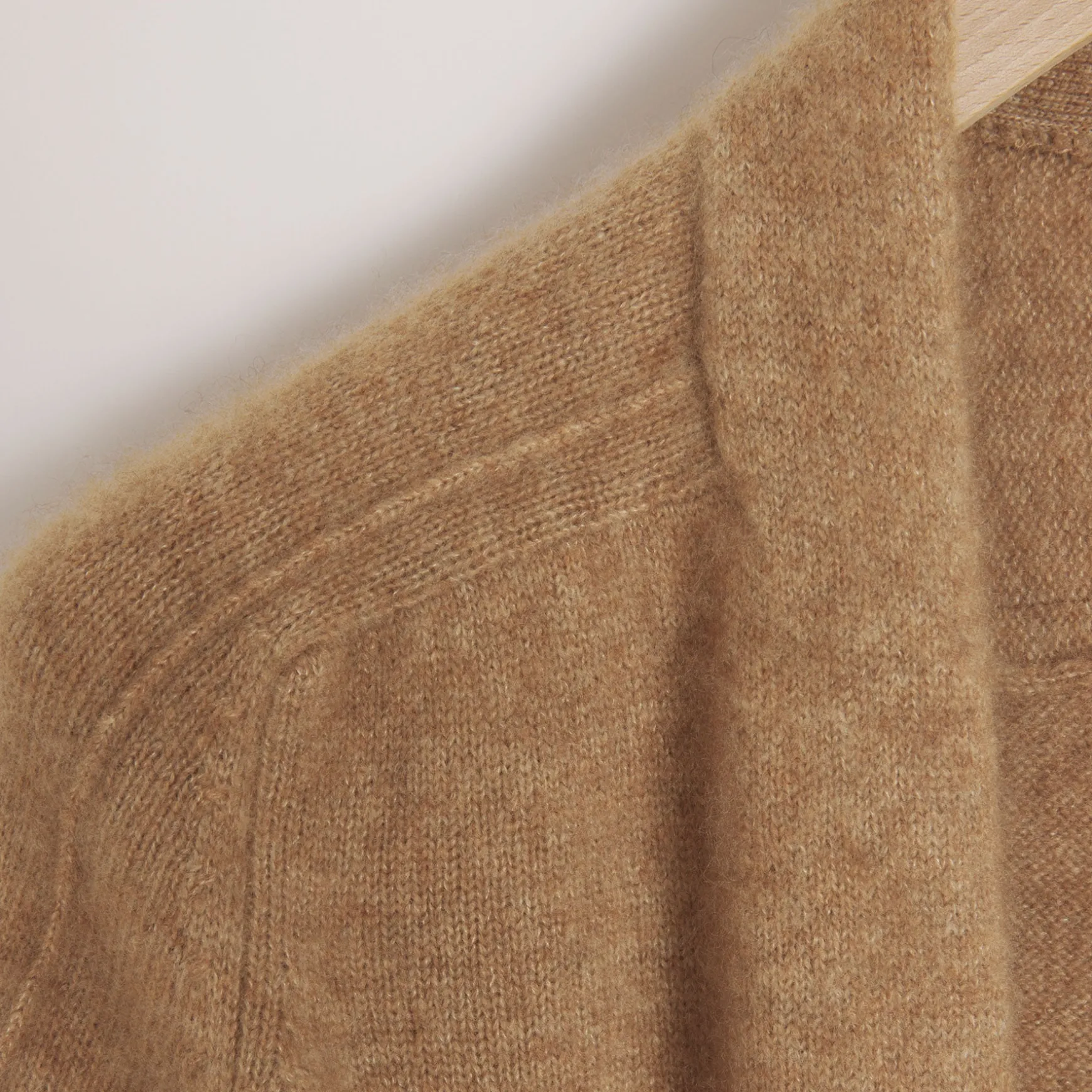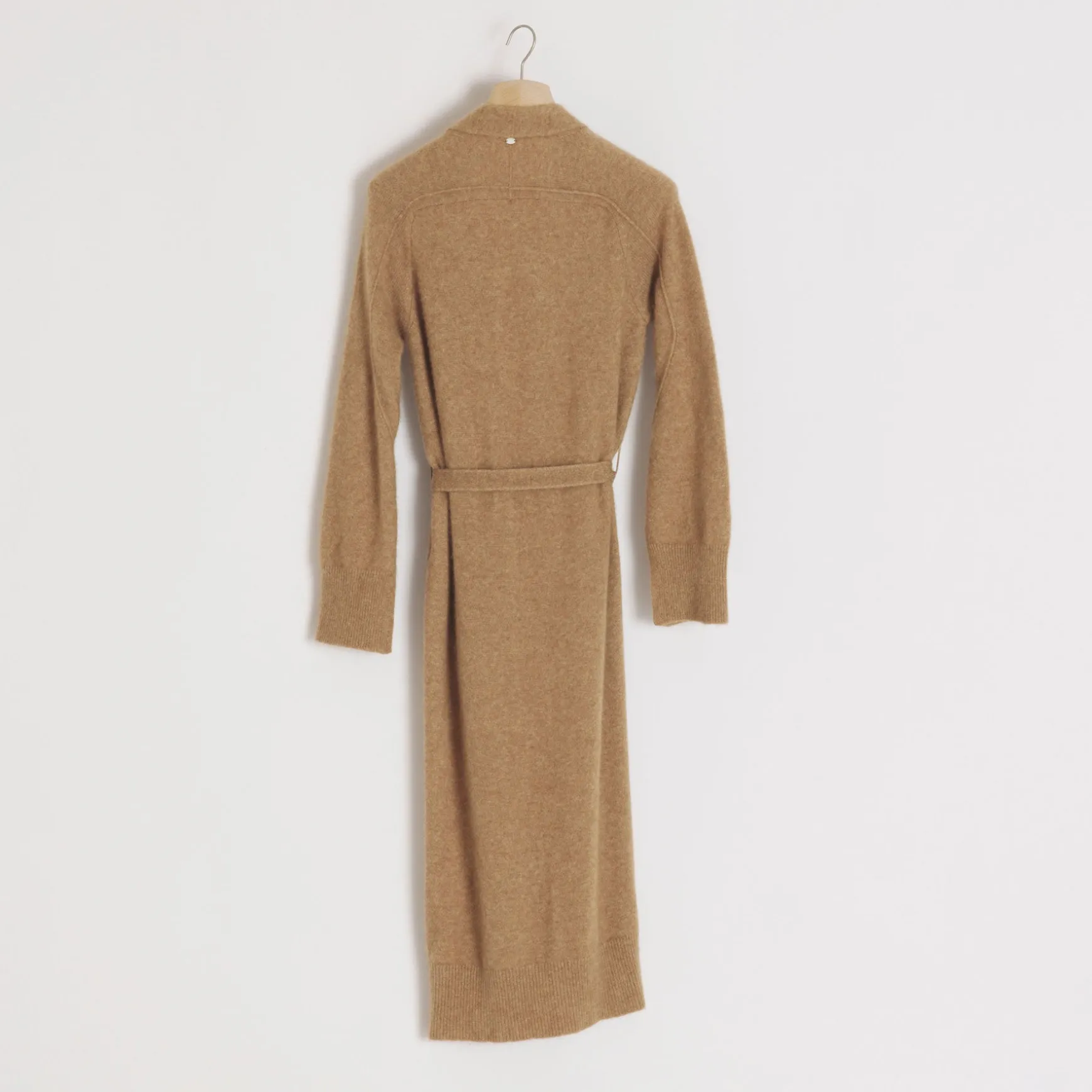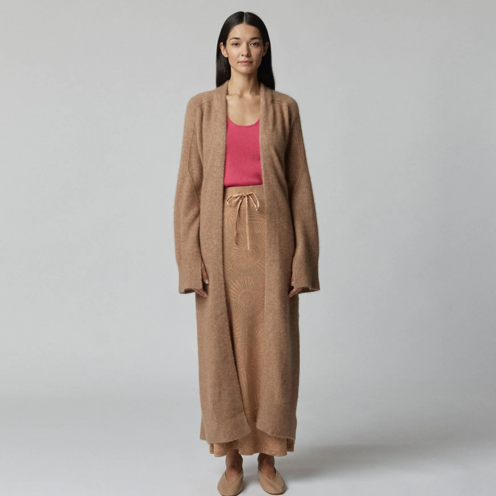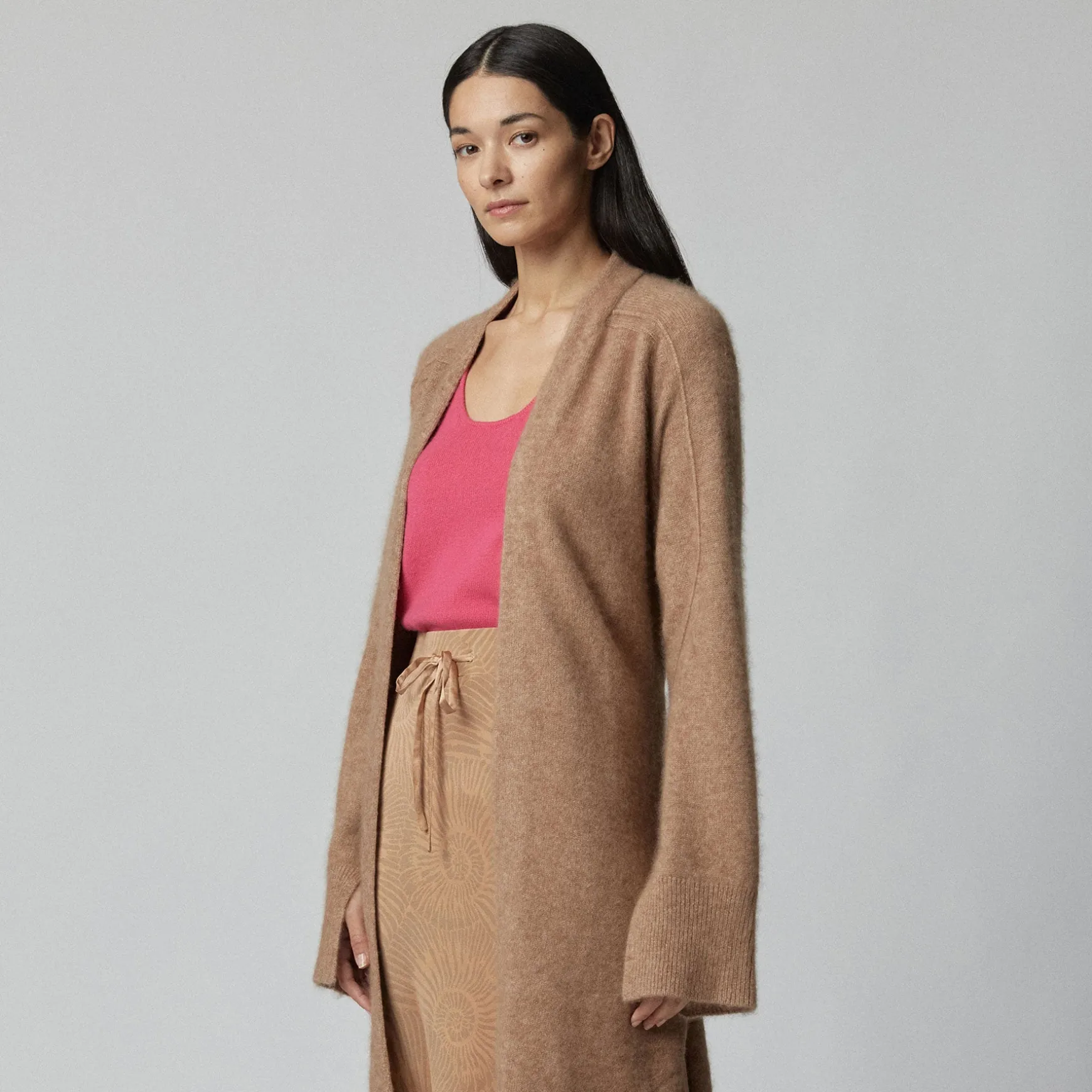 Edelste Handarbeit aus feinem Seide-Cashmere Garn. Der Cardigan überzeugt vor allem mit den seitlichen Schlitzen und dem Bindegürtel für die Taille.