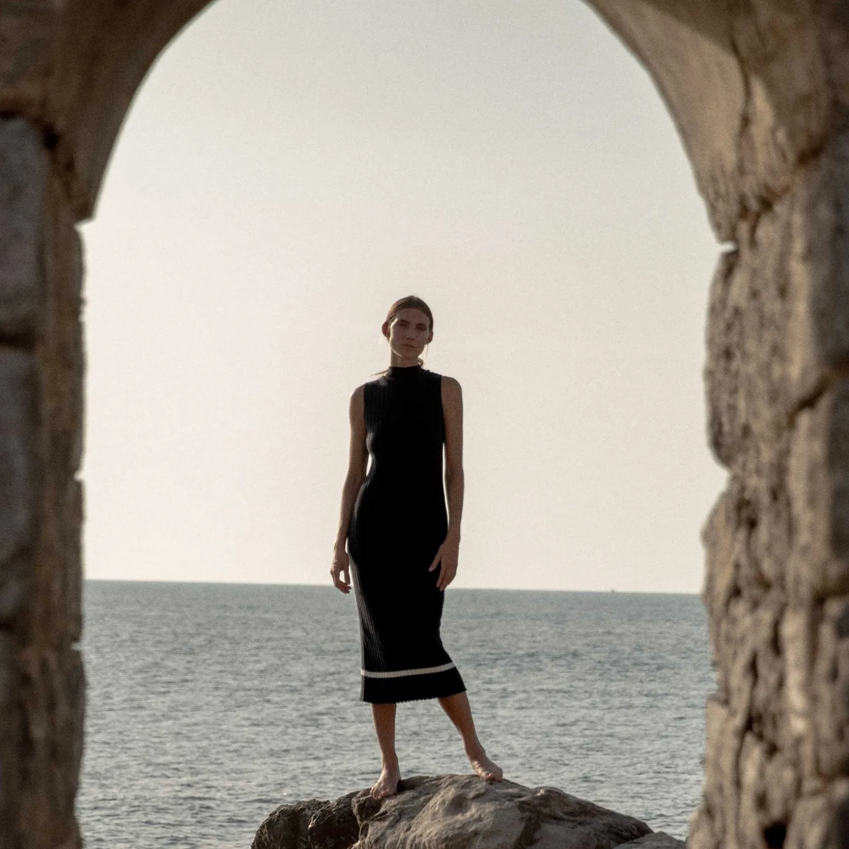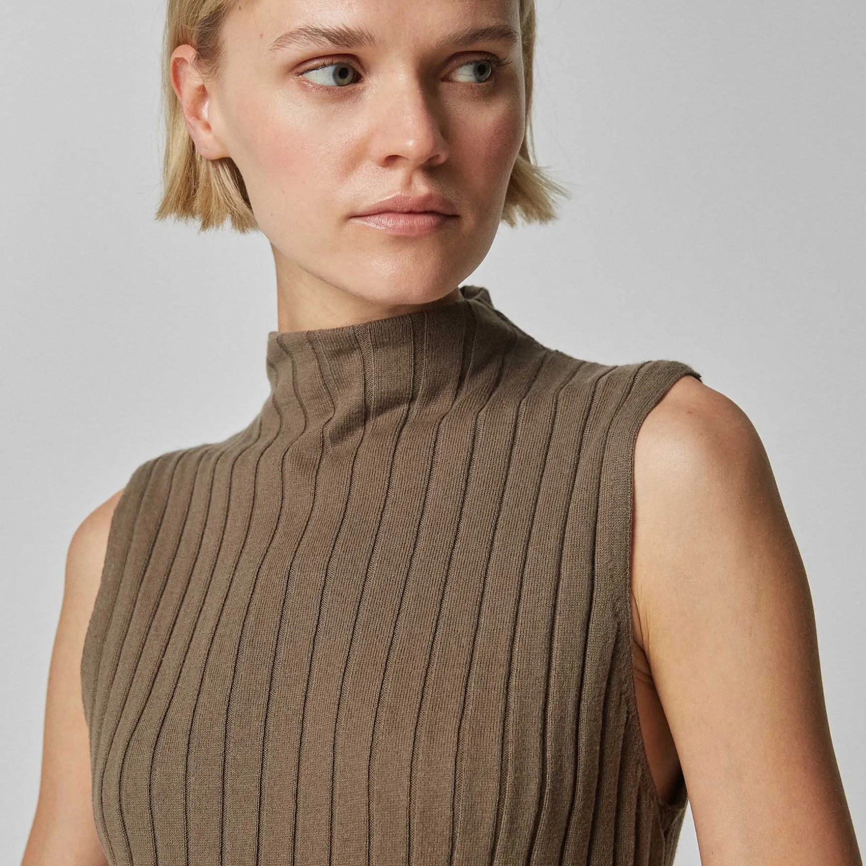 Ärmelloses Kleid mit hochgeschlossenem Kragen.