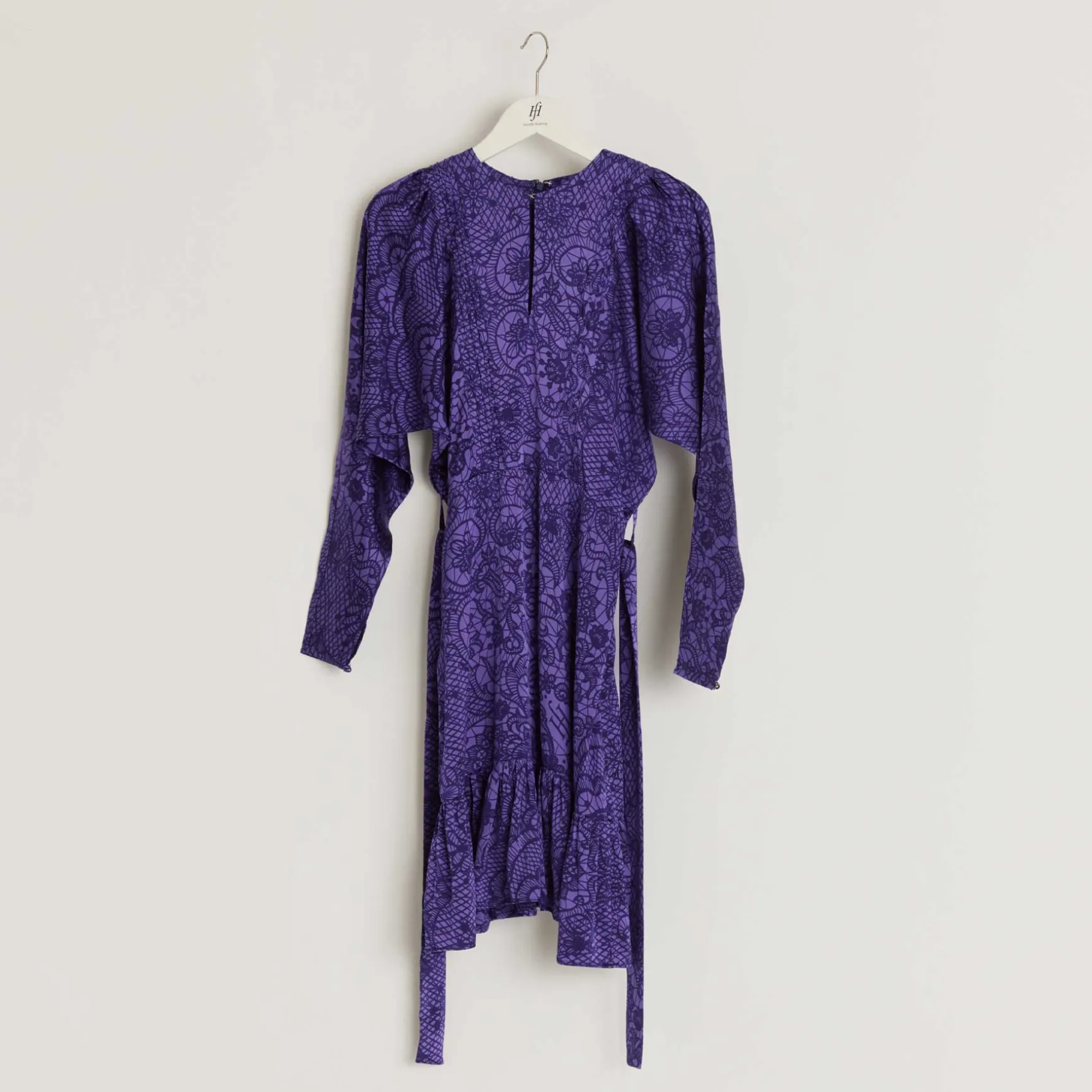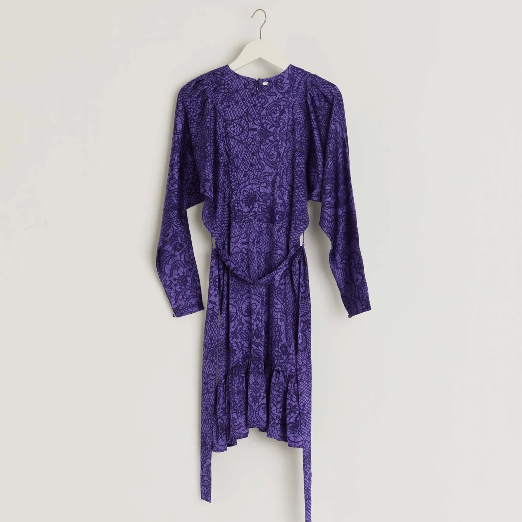 Knielanges Kleid aus fließender Seide im All Over Print New Lace mit Details an den Ärmeln und einem Bindegürtel.