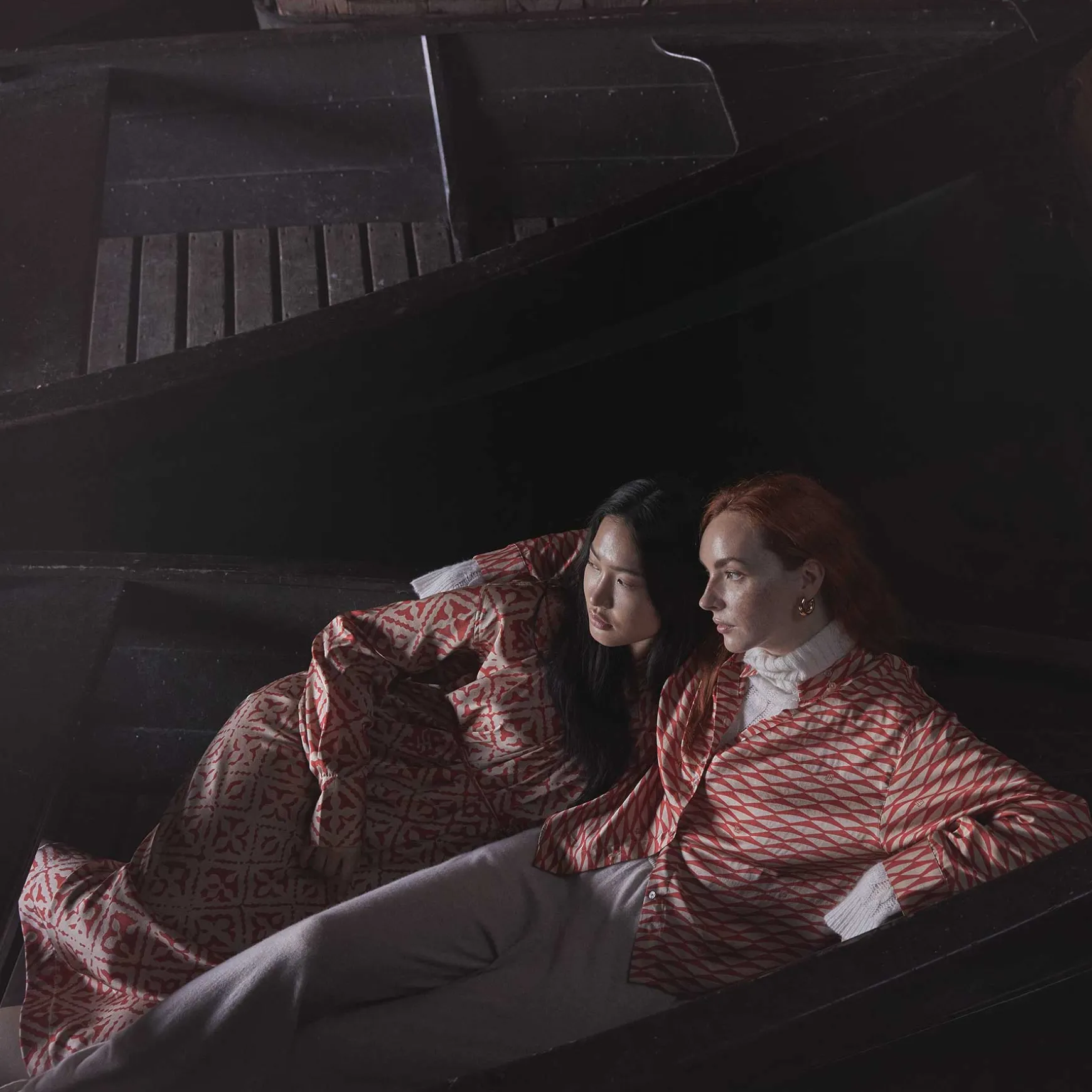 Das Material wird in der Manufaktur in Nepal per Hand aus Seidensatin gewebt. Anschließend wird der Print im Handsiebdruckverfahren auf der Seide platziert.