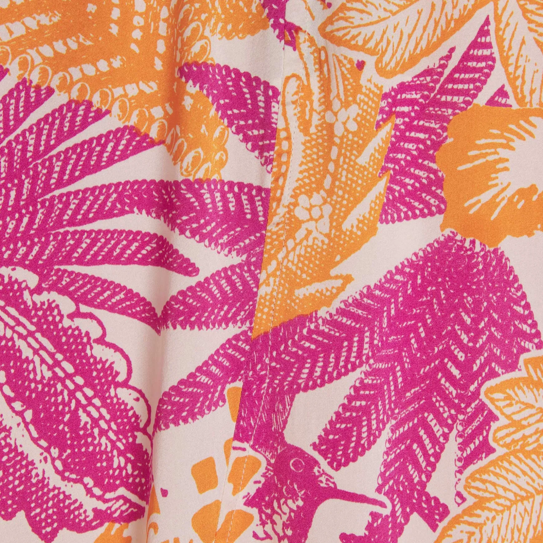 Kleid aus fließender Seide im Allover Print New Mala Mala. Das Kleid überzeugt mit einem v-neck, dass sowohl vorne, als auch am Rücken getragen werden kann und kurzen Ärmeln.