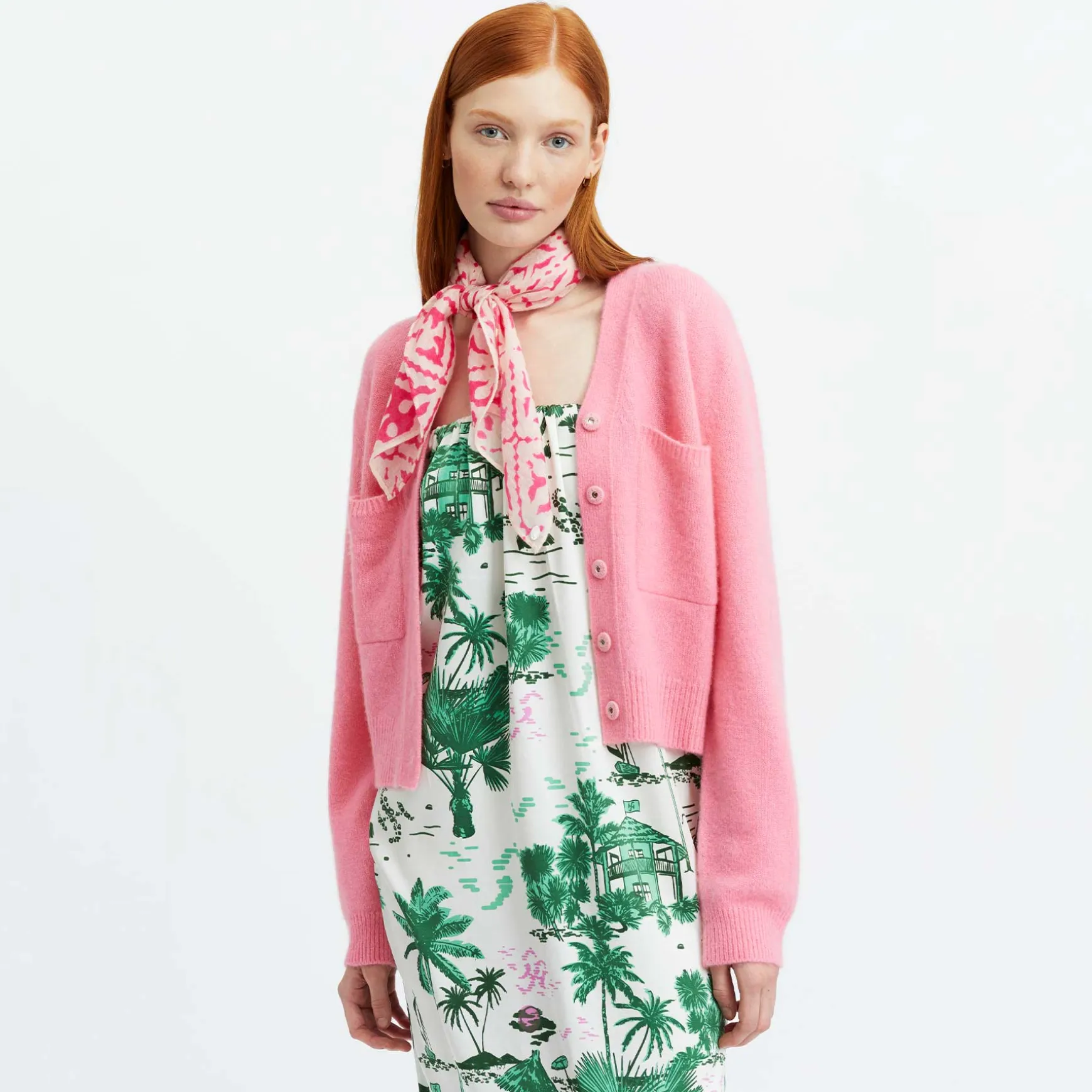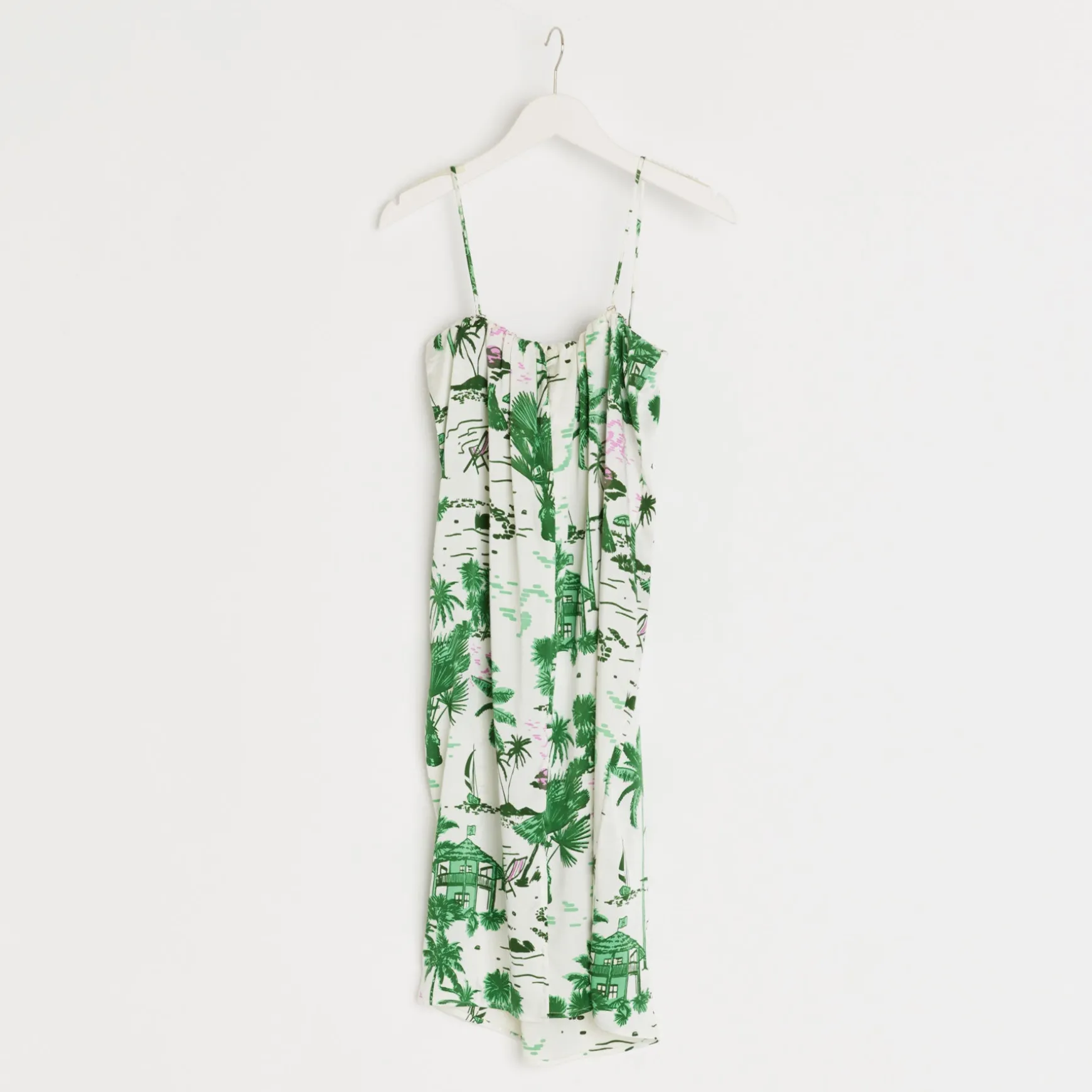 Gerade geschnittenes Kleid aus fließender Seide im All Over Print BEACH CLUB. Die dünnen Spaghettiträger können abgenommen werden, so dass sich der Artikel in ein Bandeau Kleid verwandelt.