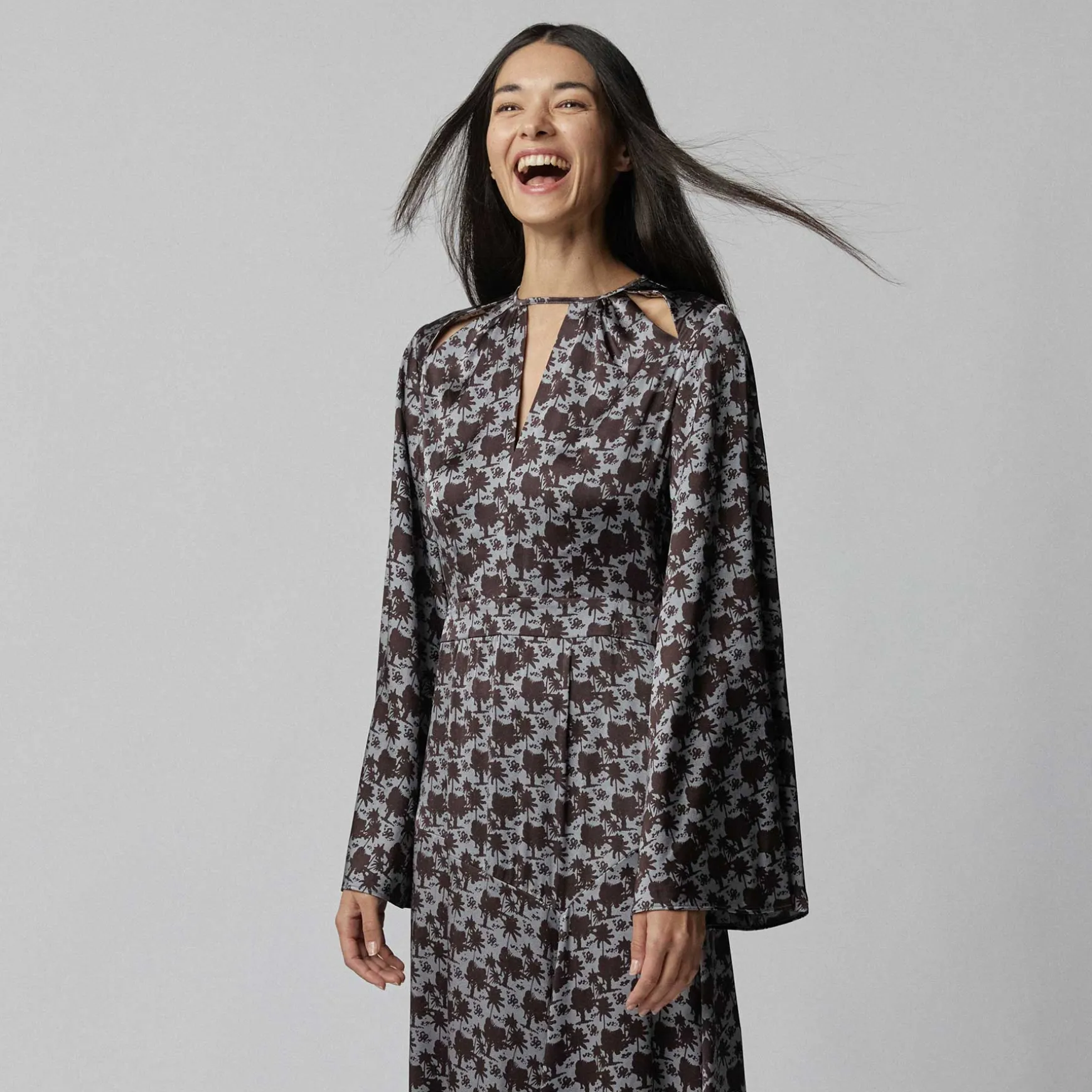 Maxikleid aus fließender Seite im All Over Print Palm Spring. Das Kleid überzeugt vor allem durch den schönen offenen Rücken, die Cut-Outs am Ausschnitt und den leichten Trompetenärmeln.