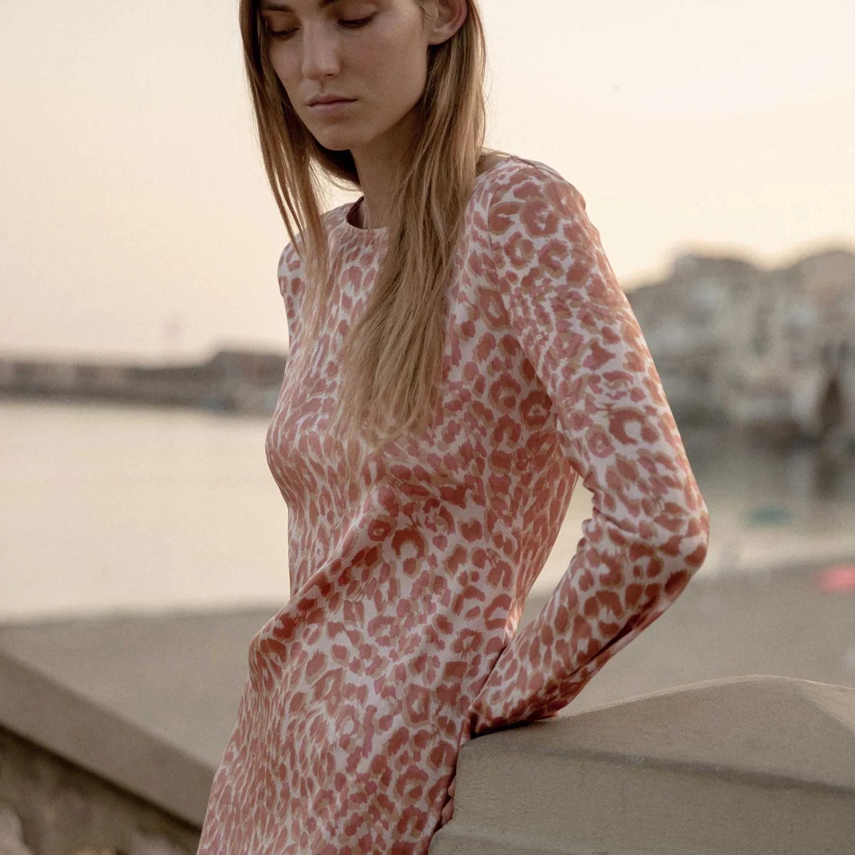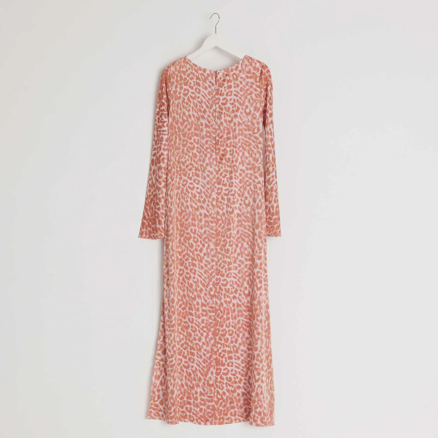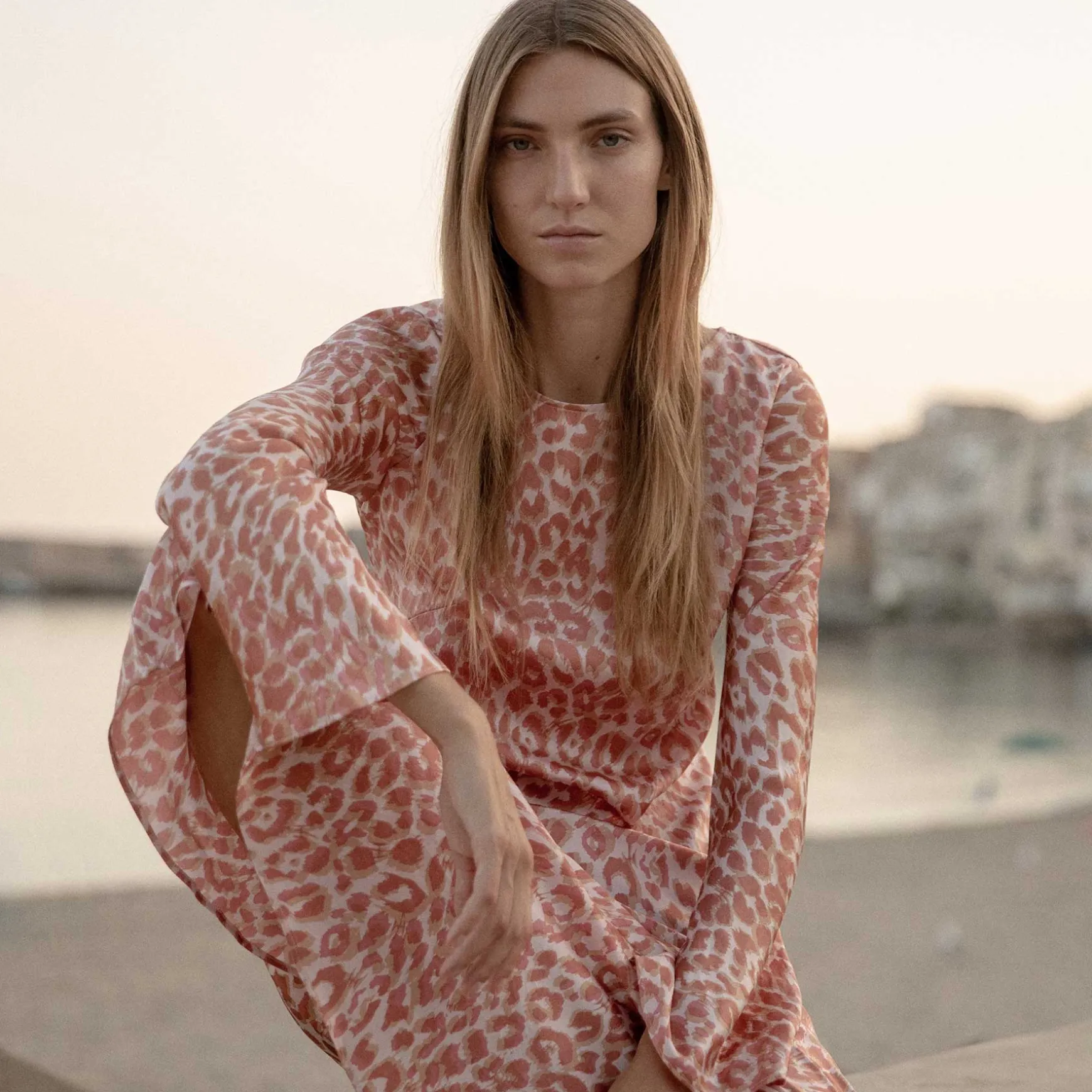 Langärmeliges Kleid aus fließender Seide im Allover Print Cheetah. Das Kleid überzeugt mit einer Knopfleiste am Rücken und leichten Trompetenärmeln.