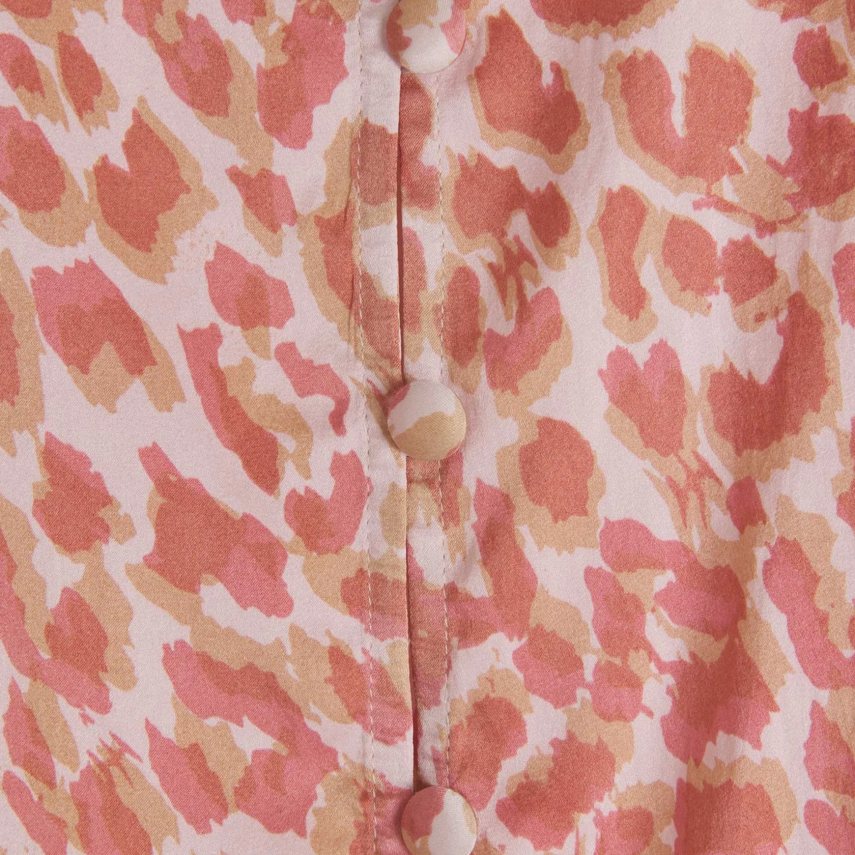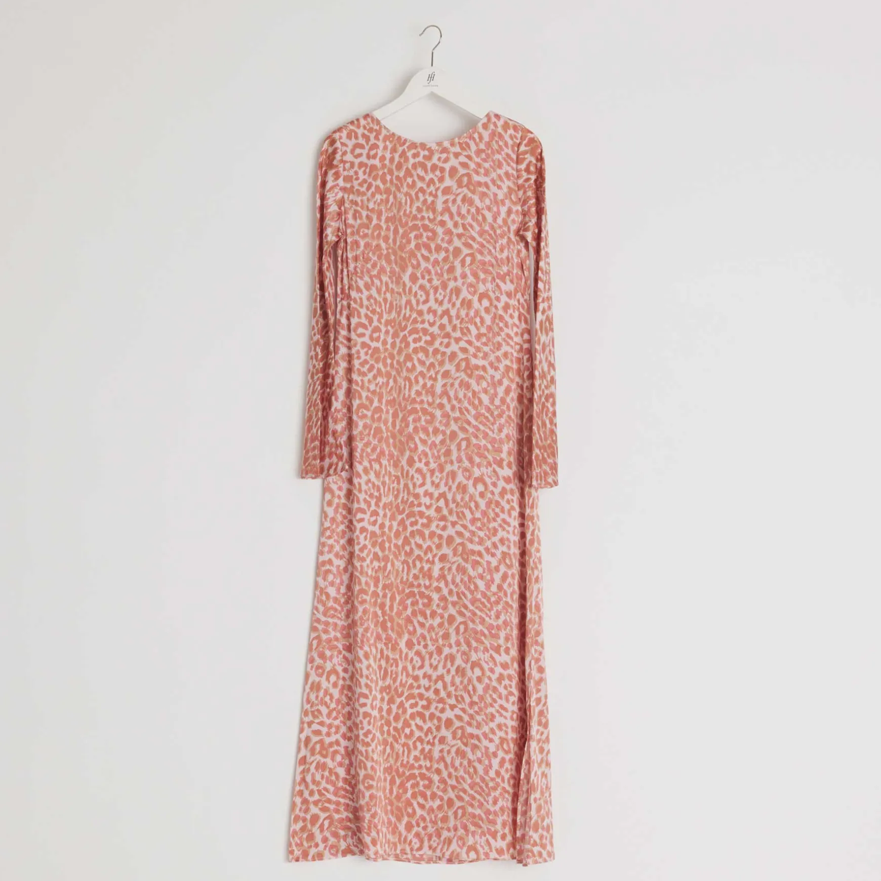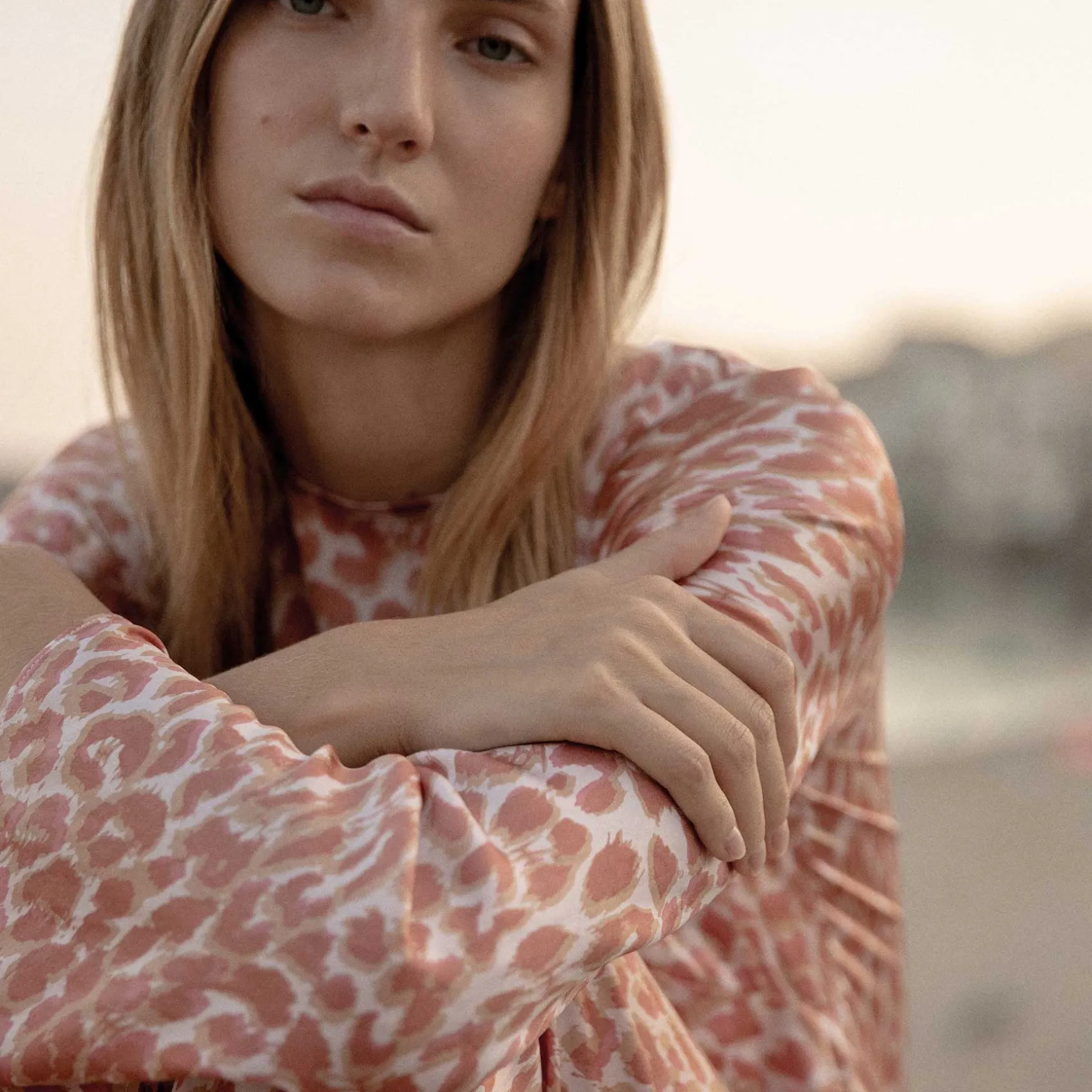 Langärmeliges Kleid aus fließender Seide im Allover Print Cheetah. Das Kleid überzeugt mit einer Knopfleiste am Rücken und leichten Trompetenärmeln.