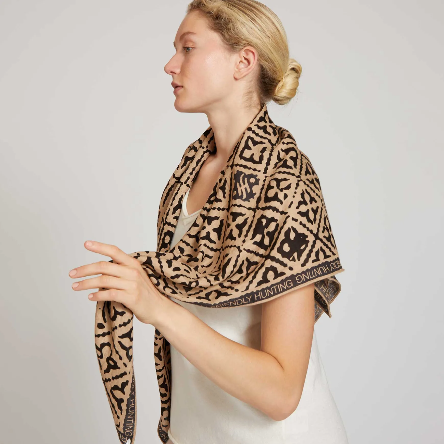 Der Explorer Cube wird in unserer Manufaktur in Nepal aus einem Seide-Cashmere Garn quadratisch handgewebt. Anschließend wird der Print mit Handsiebdruck auf dem Schal platziert.