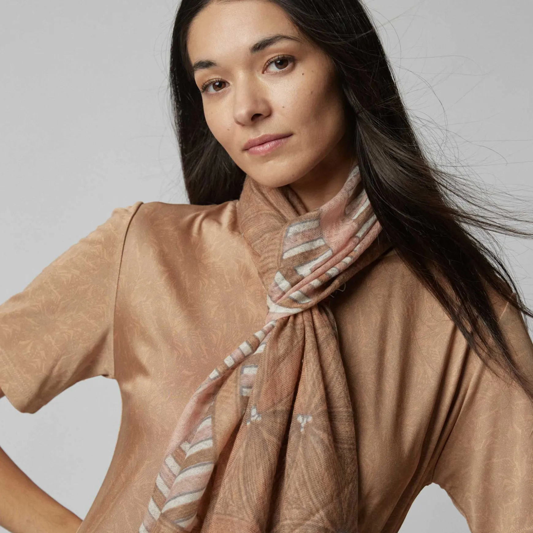 Die friendly hunting Felted Stole wird in unserer Manufaktur in Nepal aus 100% Cashmere handgewebt und anschließend gefilzt. Ihre dichte Struktur mildert die Empfindlichkeit dieses mit Hand Sieb bedruckten, fragilen Materials.