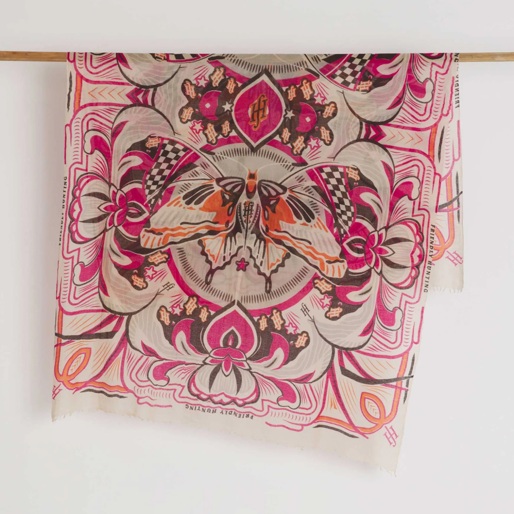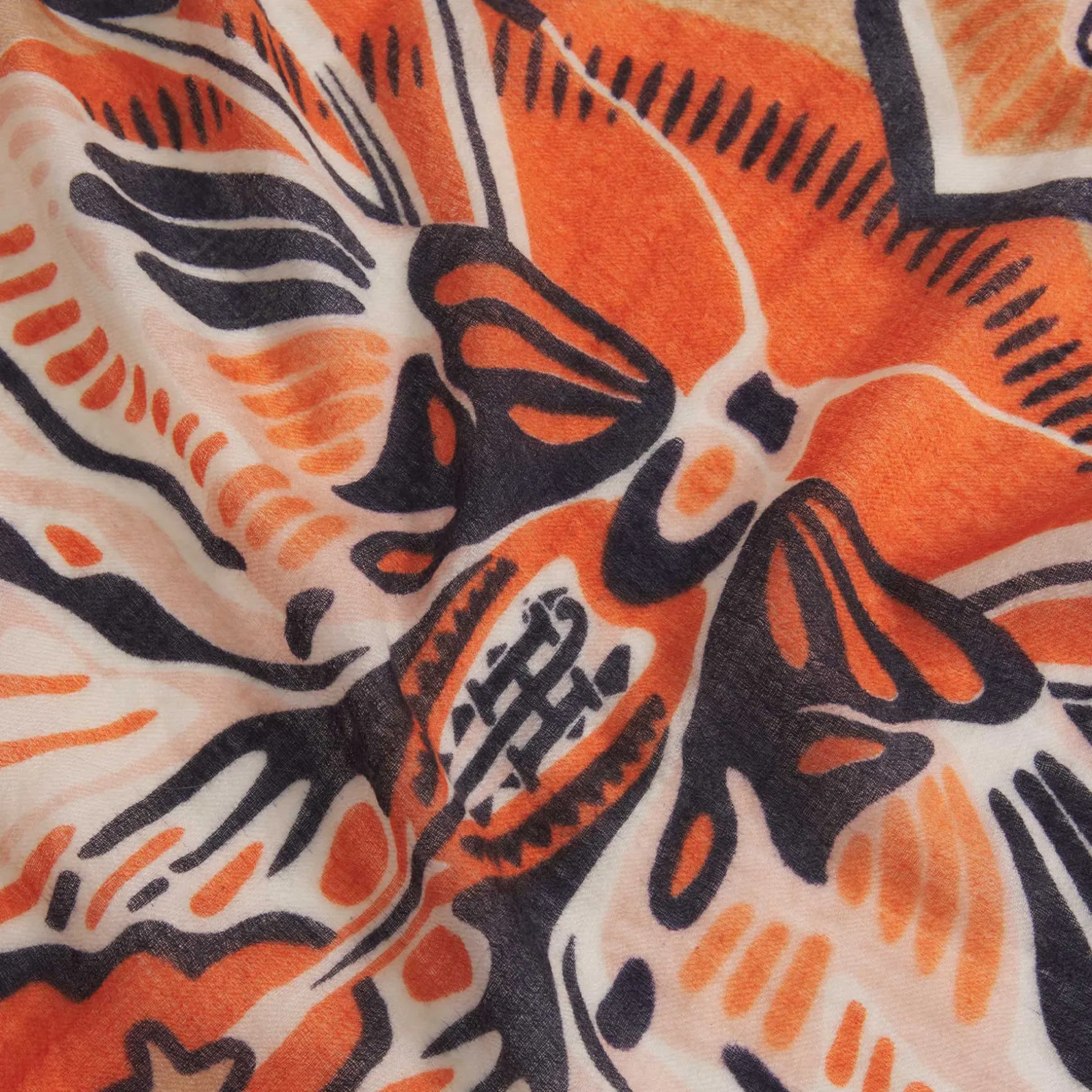 Die friendly hunting Felted Stole wird in unserer Manufaktur in Nepal aus 100% Cashmere handgewebt und anschließend gefilzt. Ihre dichte Struktur mildert die Empfindlichkeit dieses mit Hand Sieb bedruckten, fragilen Materials.