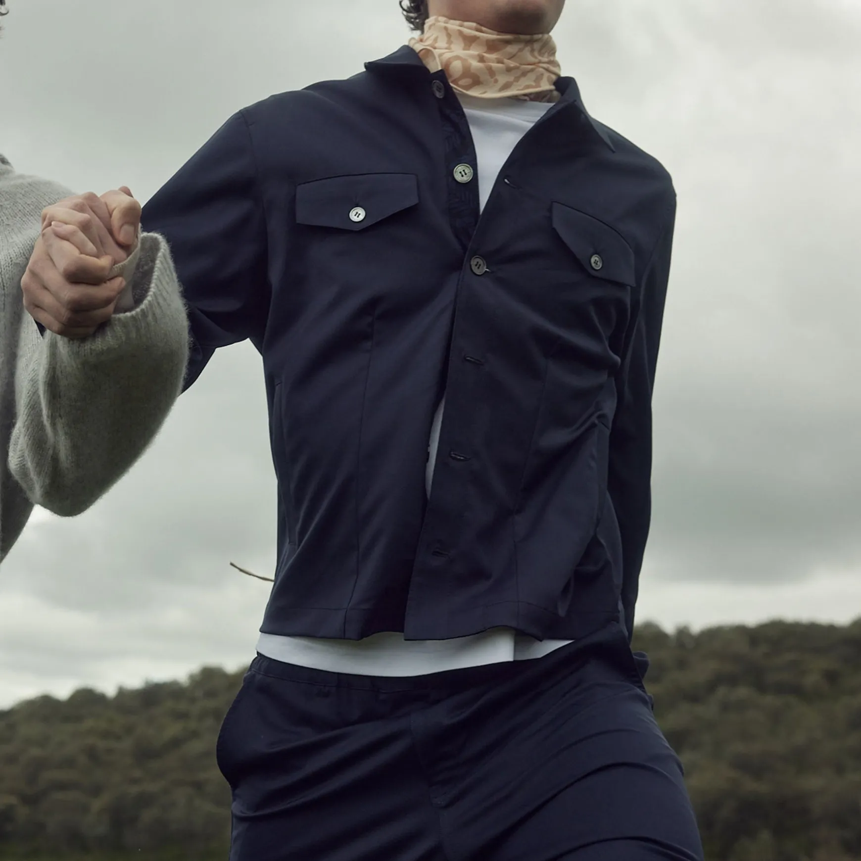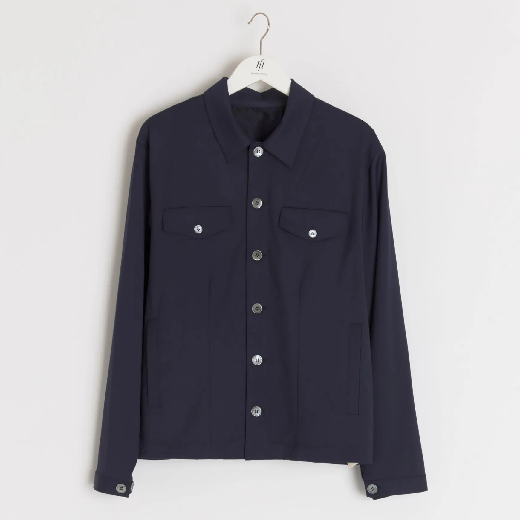 Sommerliche Jacke in dunklem Blau mit Knopfleiste aufgesetzten Taschen.