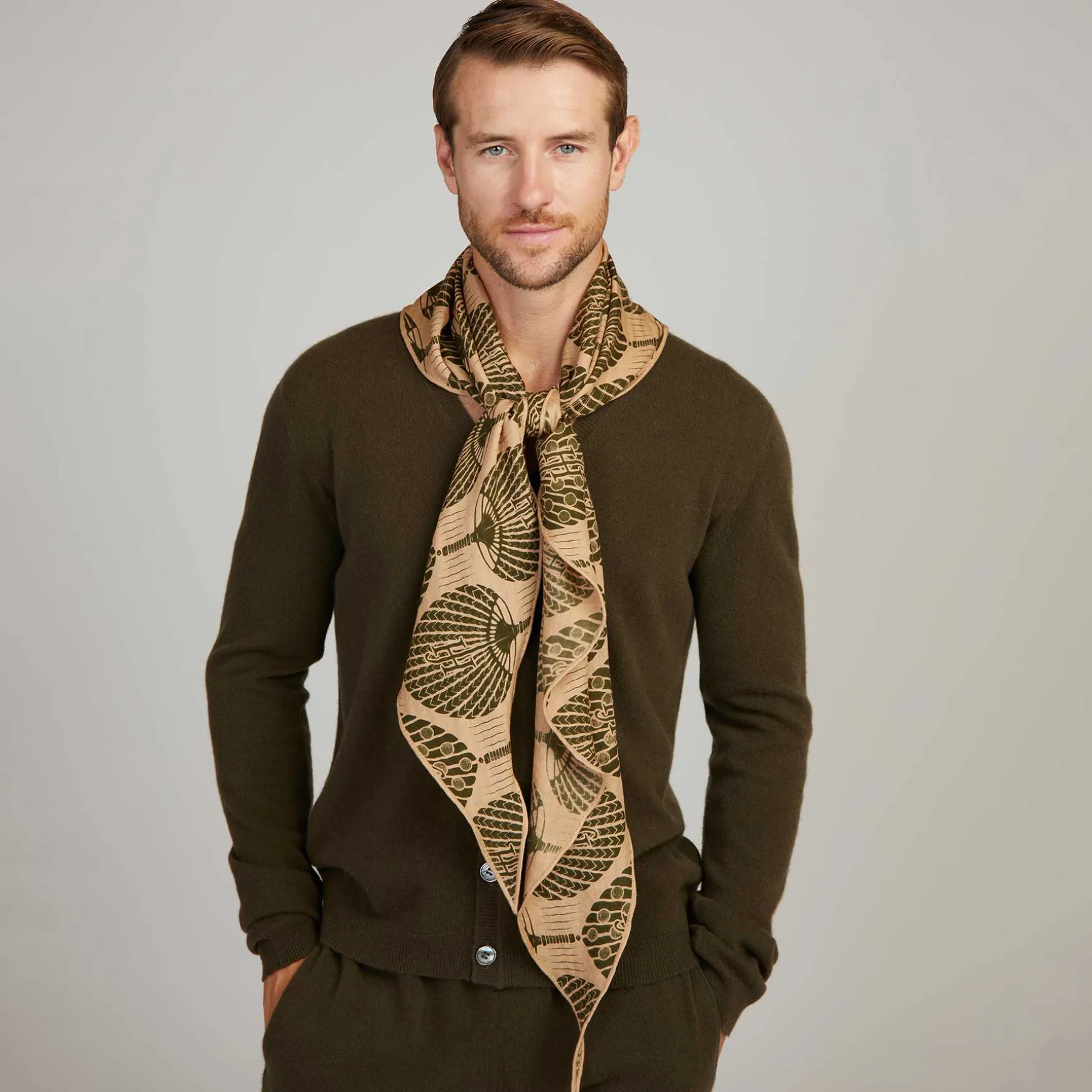 Seine Trapezform macht ihn sehr besonders und seine Mischung aus Seide und Kaschmir ist luftig und anschmiegsam. Er wird in der Manufaktur handgewebt und anschließend im Handsiebdruck bedruckt.