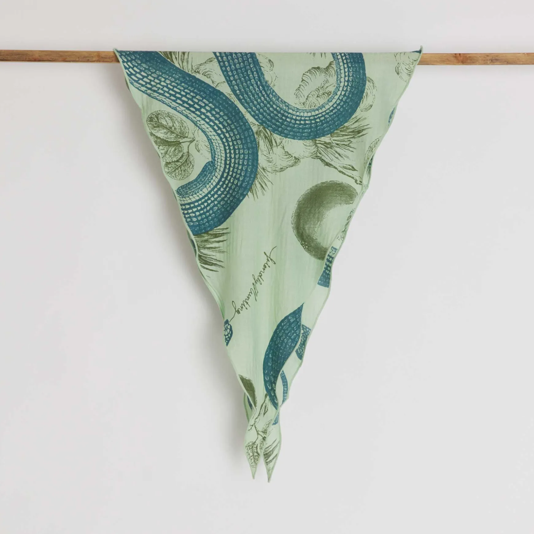 Seine Trapezform macht ihn sehr besonders und seine Mischung aus Seide und Kaschmir ist luftig und anschmiegsam. Er wird in der Manufaktur handgewebt und anschließend im Handsiebdruck bedruckt.