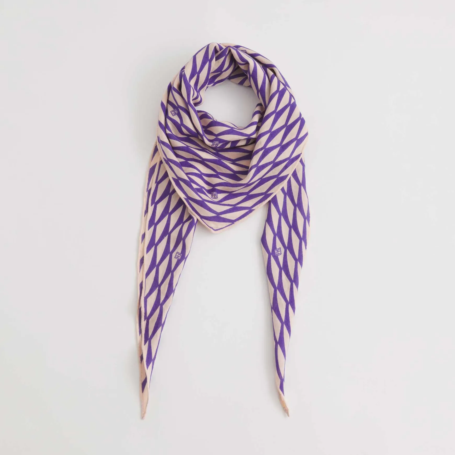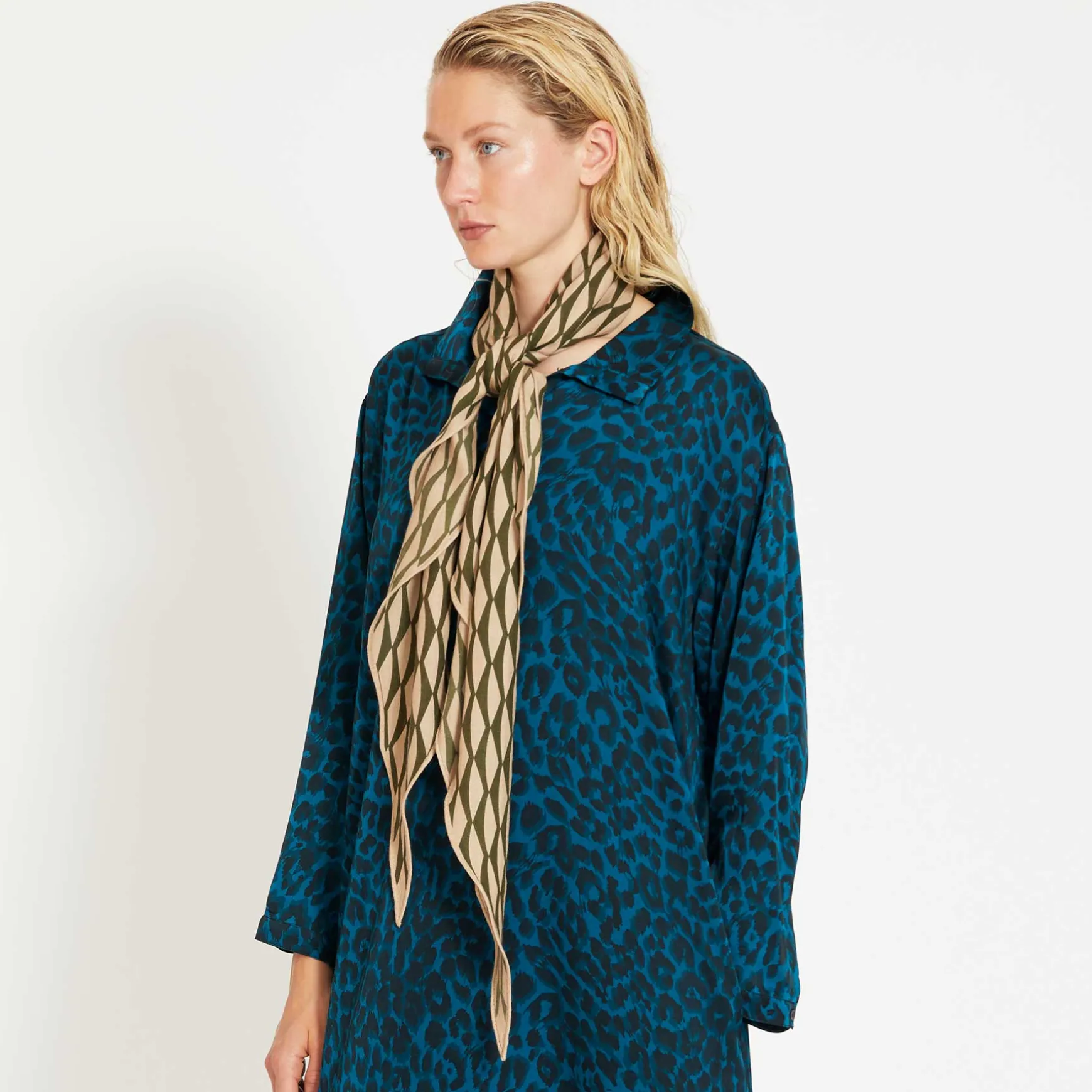 Seine Trapezform macht ihn sehr besonders und seine Mischung aus Seide und Kaschmir ist luftig und anschmiegsam. Er wird in der Manufaktur handgewebt und anschließend im Handsiebdruck bedruckt.