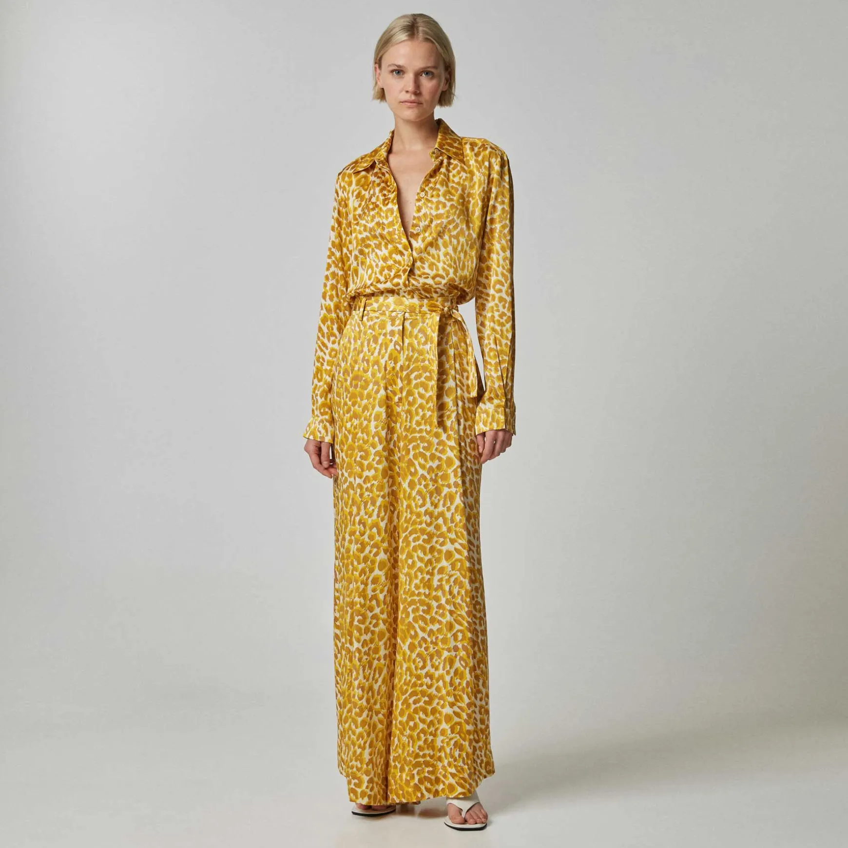 Das Material wird in der Manufaktur in Nepal per Hand aus Seidensatin gewebt. Anschließend wird der Print im Handsiebdruckverfahren auf der Seide platziert.