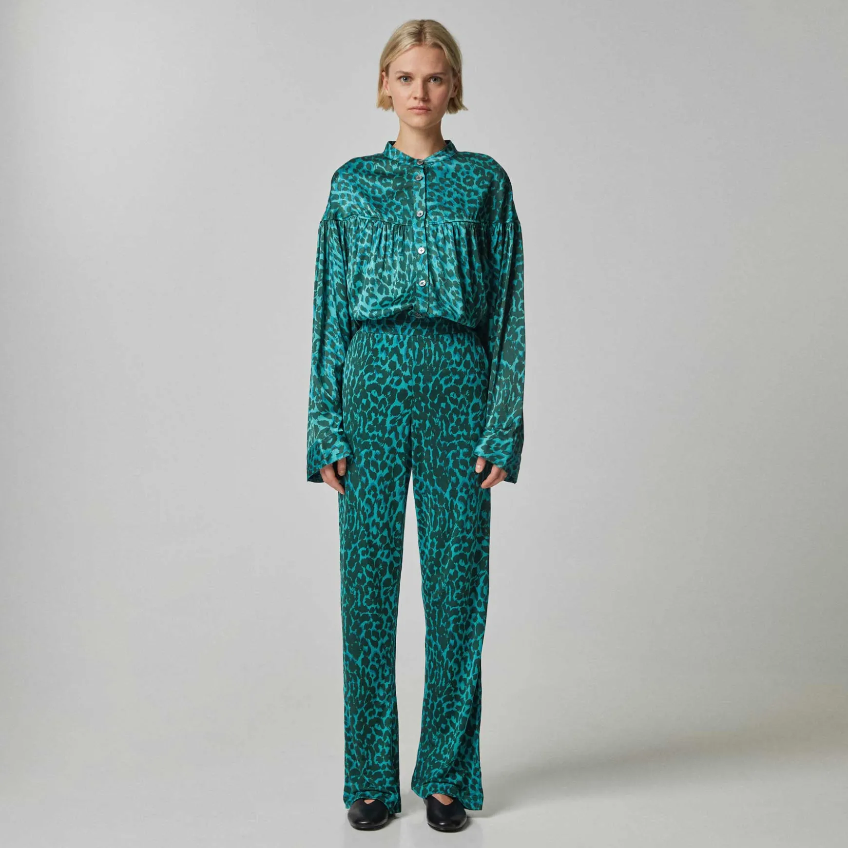 Das Material wird in der Manufaktur in Nepal aus 100% Seidenjersey gestrickt. Anschließend wird der Print im Handsiebdruckverfahren auf der Seide platziert.