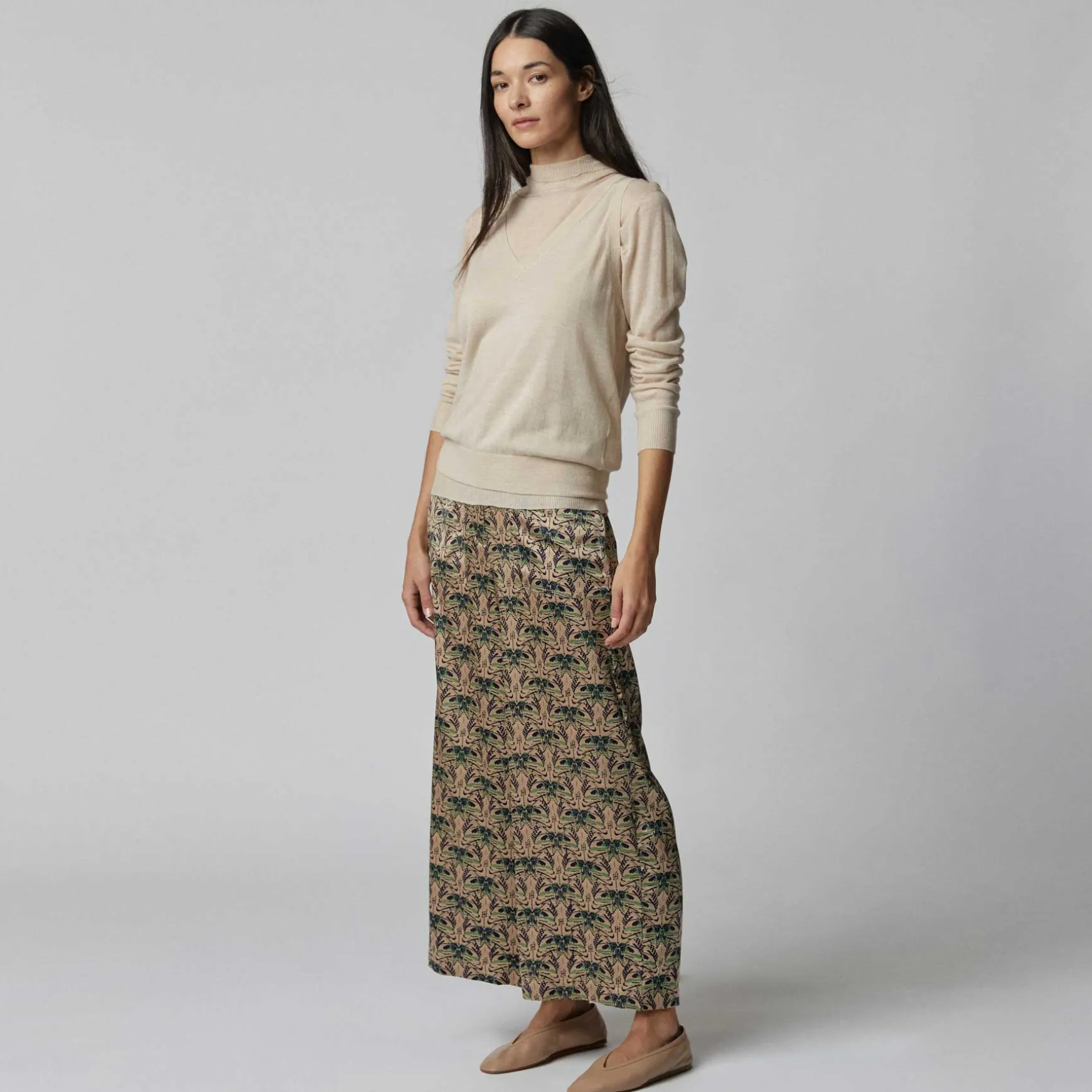 Das Material wird in der Manufaktur in Nepal per Hand aus Seidensatin gewebt. Anschließend wird der Print im Handsiebdruckverfahren auf der Seide platziert.