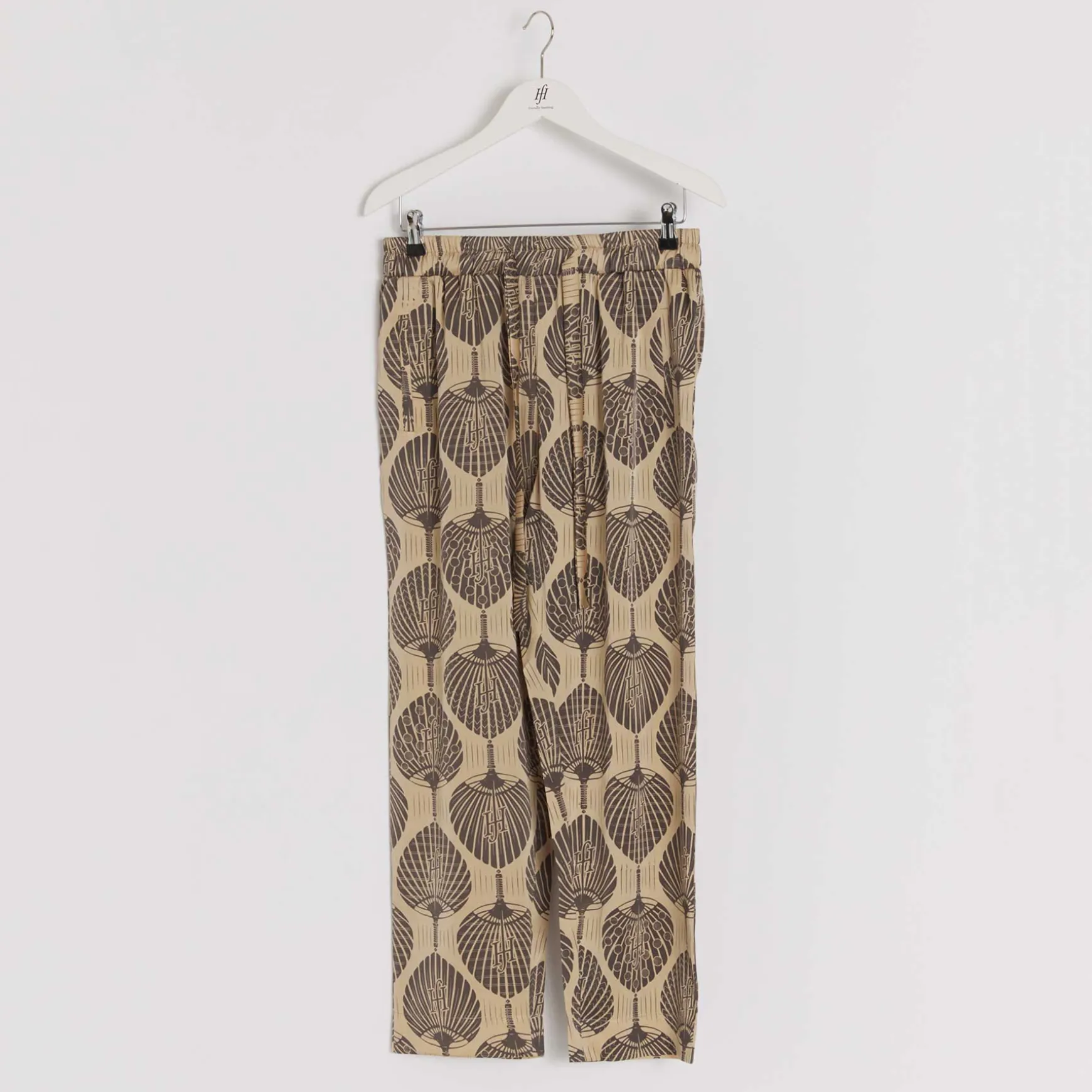 Das Material wird in der Manufaktur in Nepal per Hand aus Seidensatin gewebt. Anschließend wird der Print im Handsiebdruckverfahren auf der Seide platziert.