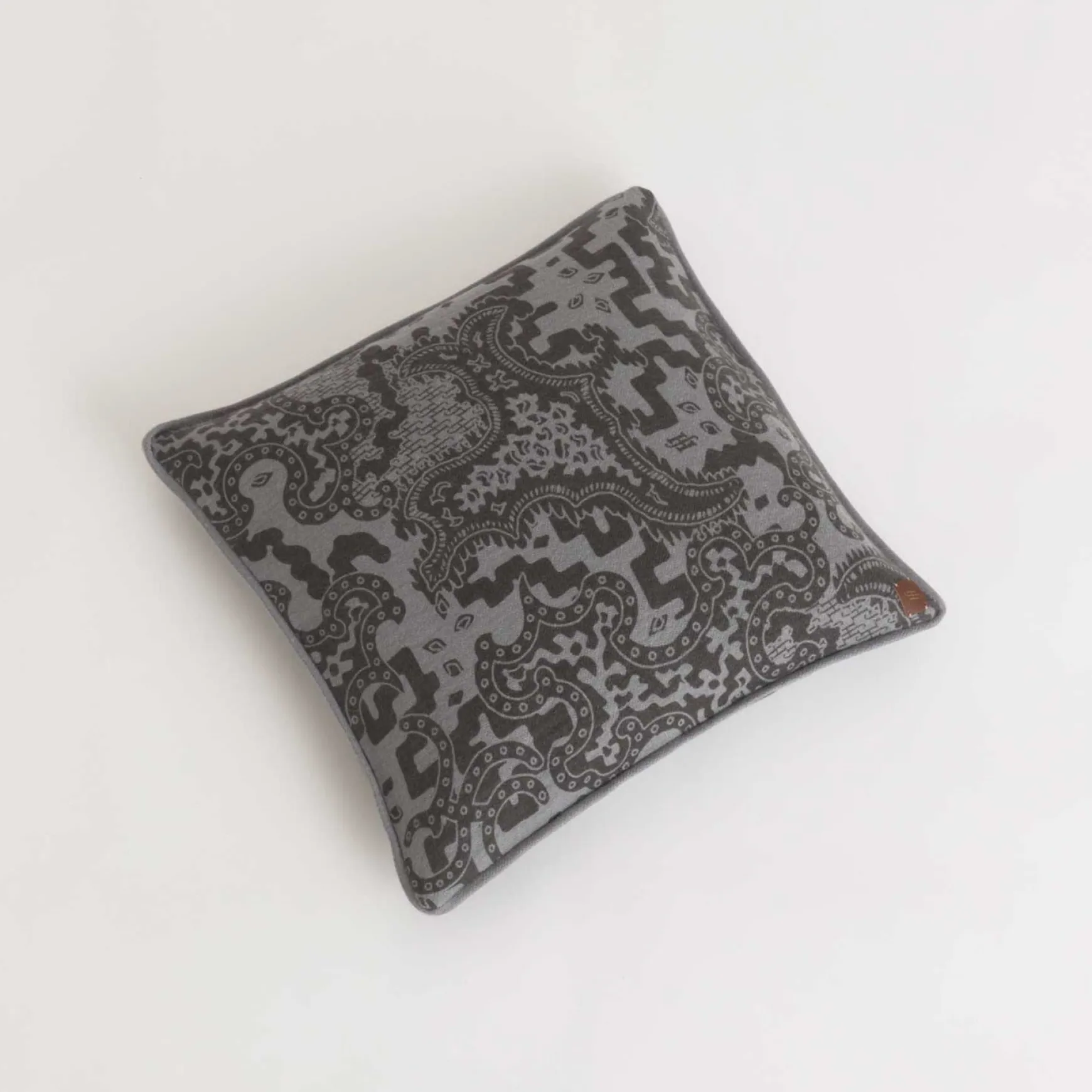 Der Kissenbezug wird in der Manufaktur in Nepal handgewebt und anschließend gefilzt. Die dichte Struktur mildert die Empfindlichkeit dieses mit Hand Sieb bedruckten, fragilen Materials