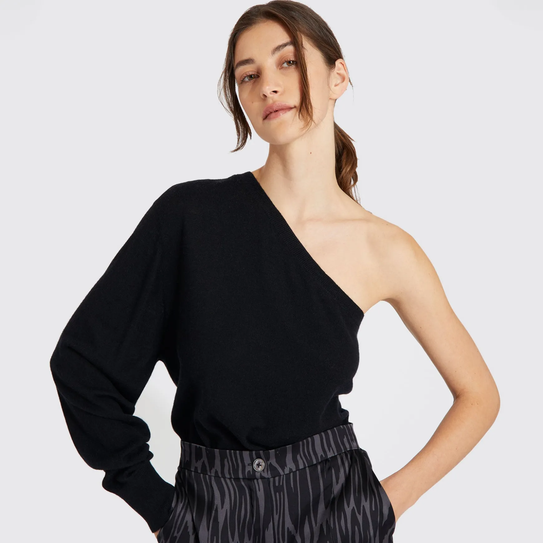 Edelste Handarbeit aus feinem Wolle-Cashmere Garn macht diesen Artikel zu einem Must-Have. Der Pullover besticht durch sein schlichtes und edles Design mit einem one-shoulder-look.