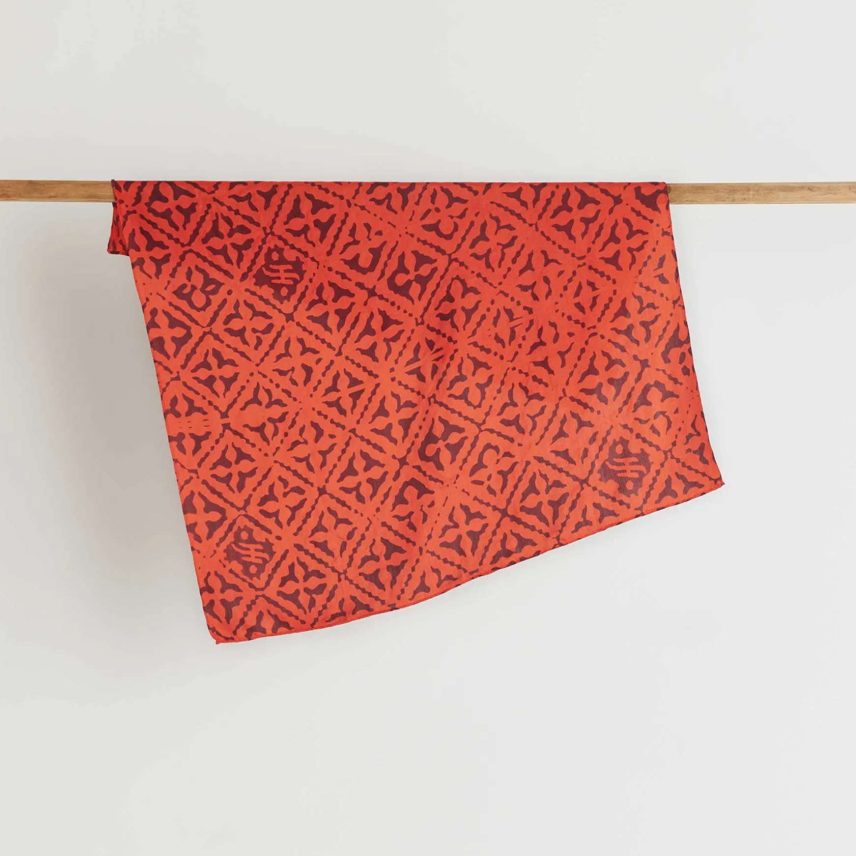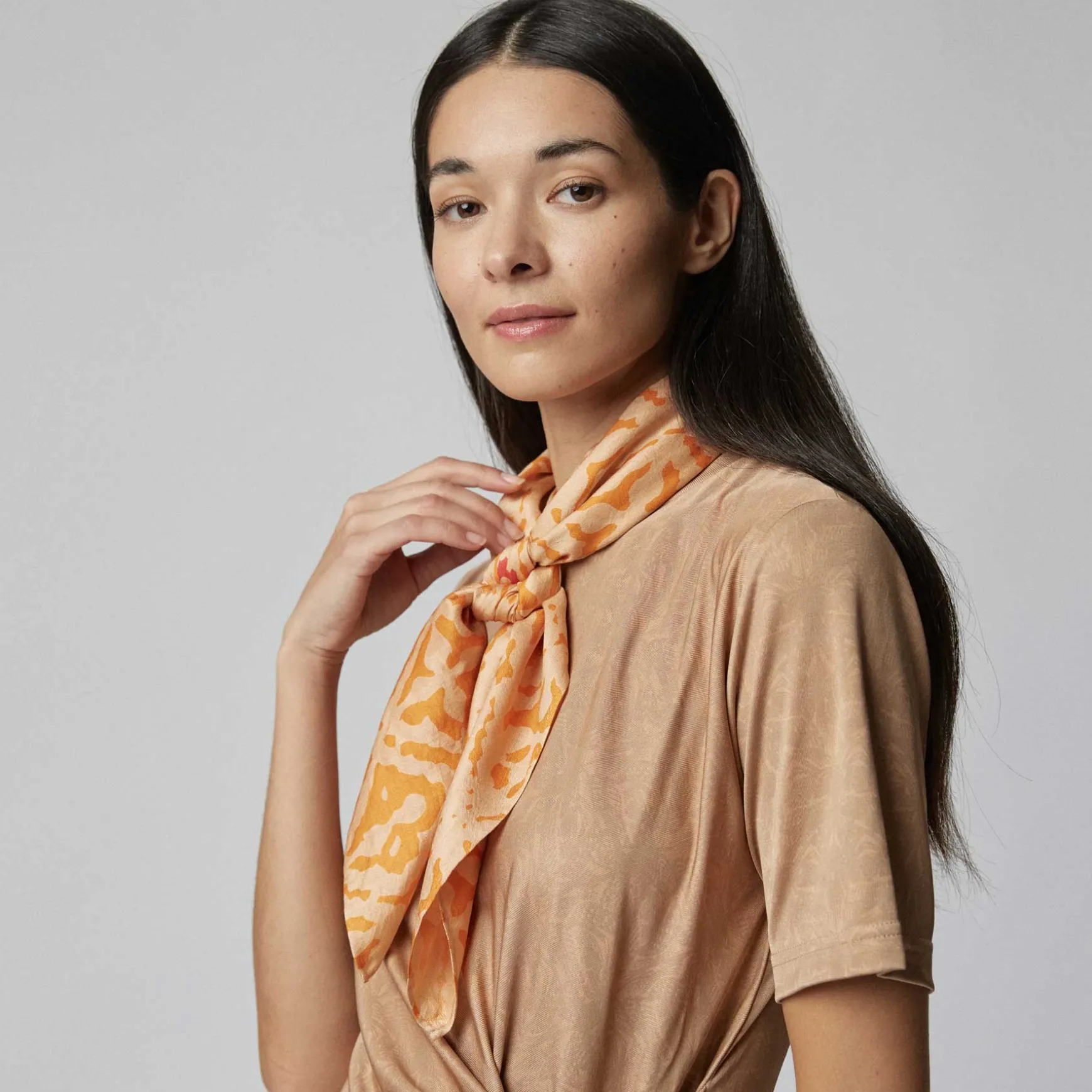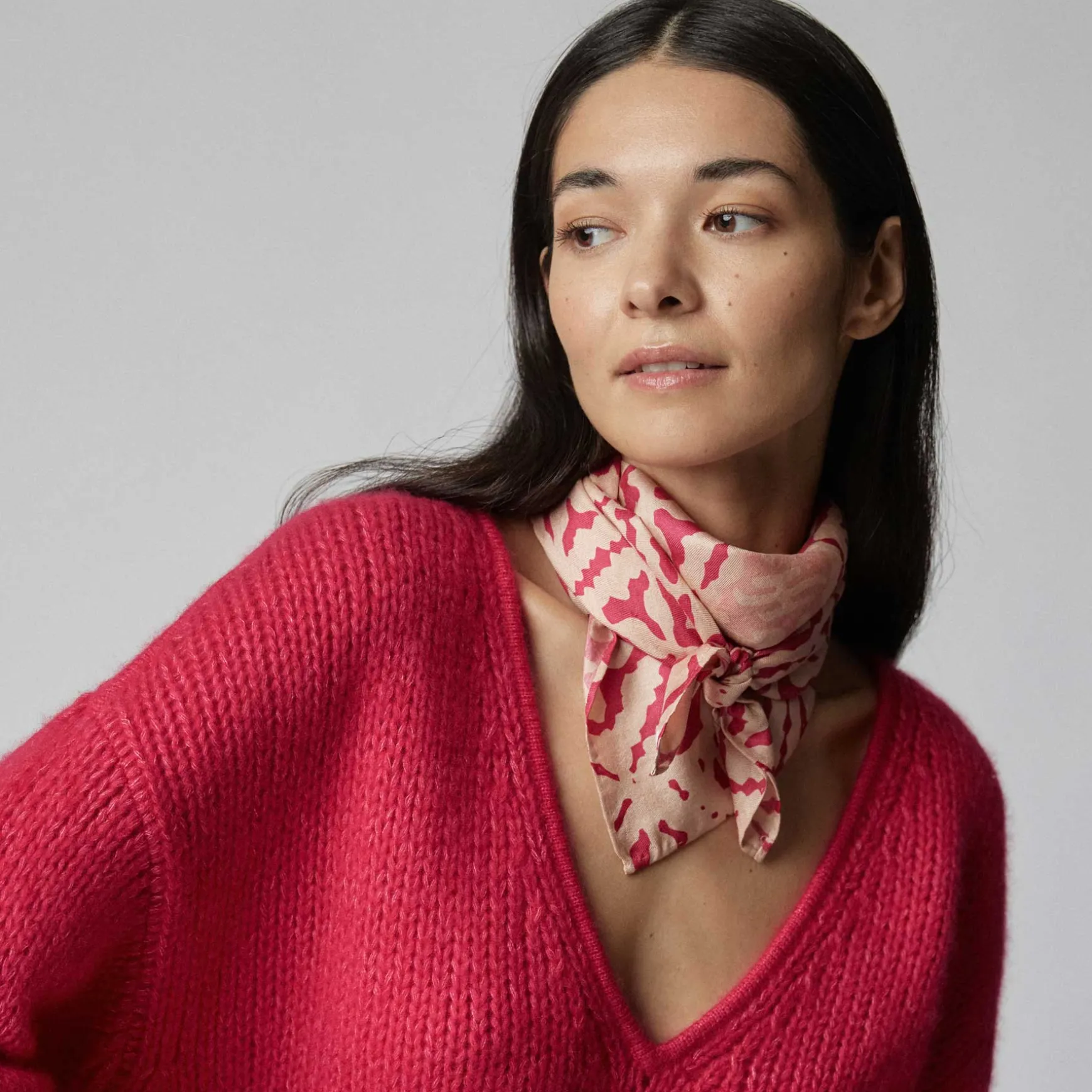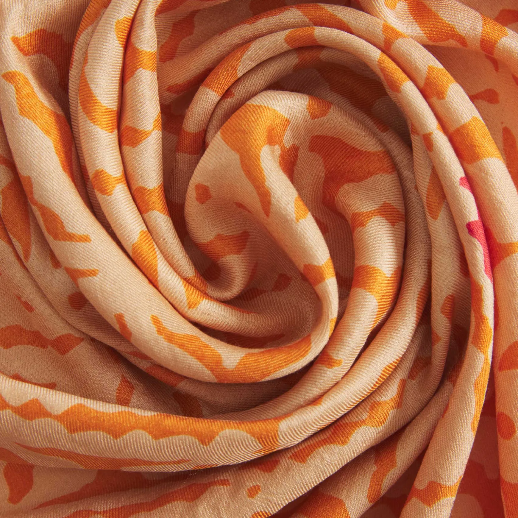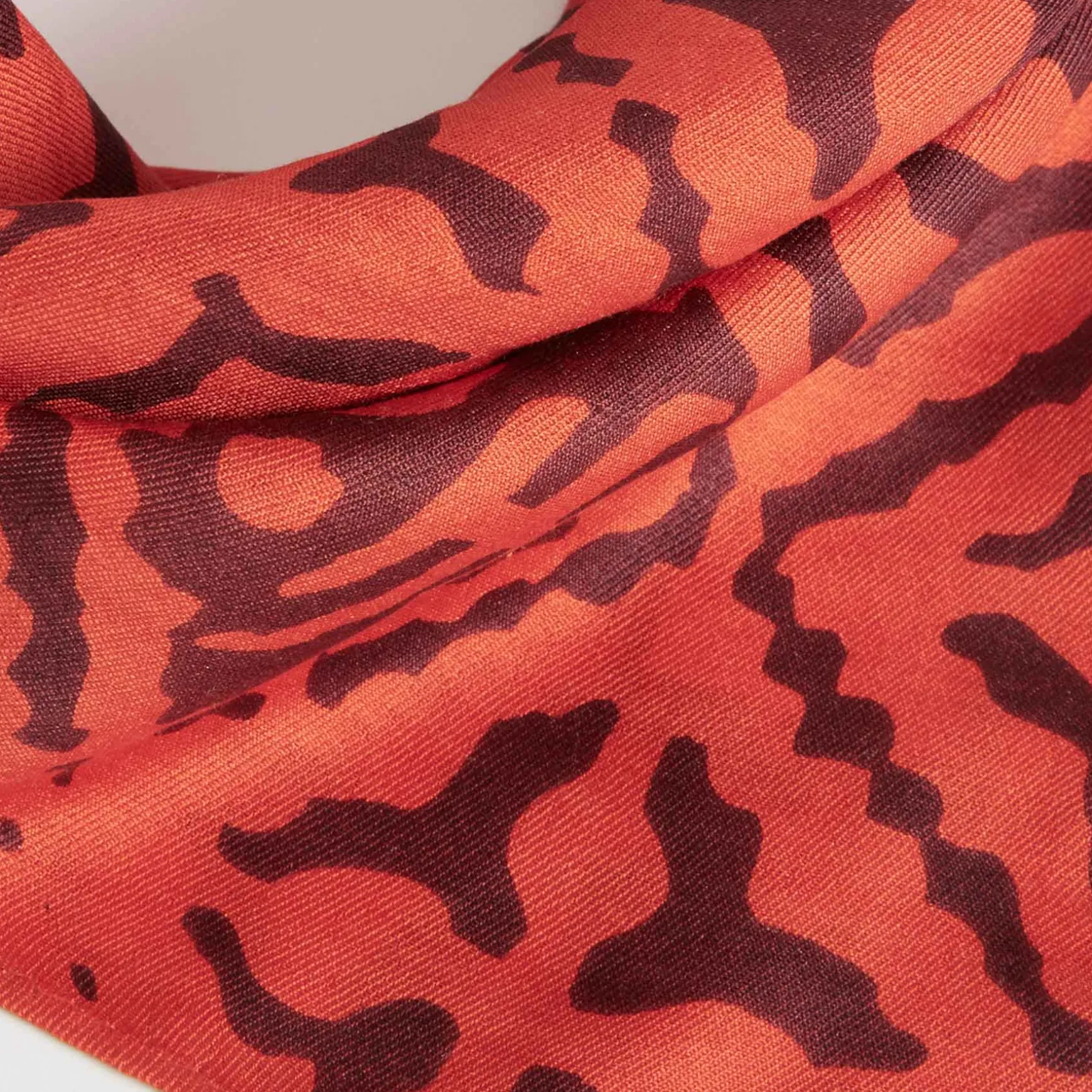 Der Silktwill Midicube wird in unserer Manufaktur in Nepal aus 100% Seide quadratisch handgewebt. Anschließend wird der Print mit Handsiebdruck auf dem Schal platziert.