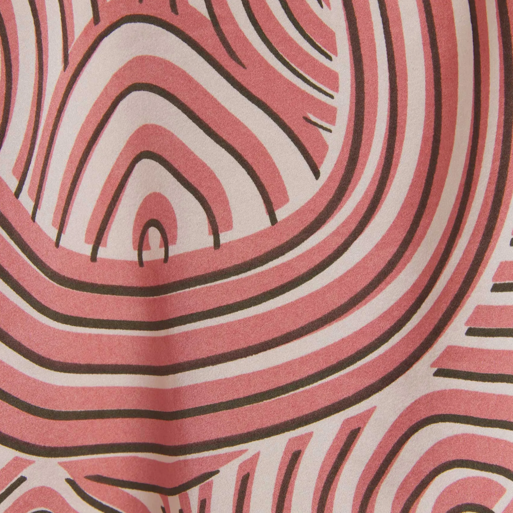 Das Material wird in der Manufaktur in Nepal per Hand aus Seidensatin gewebt. Anschließend wird der Print im Handsiebdruckverfahren auf der Seide platziert.