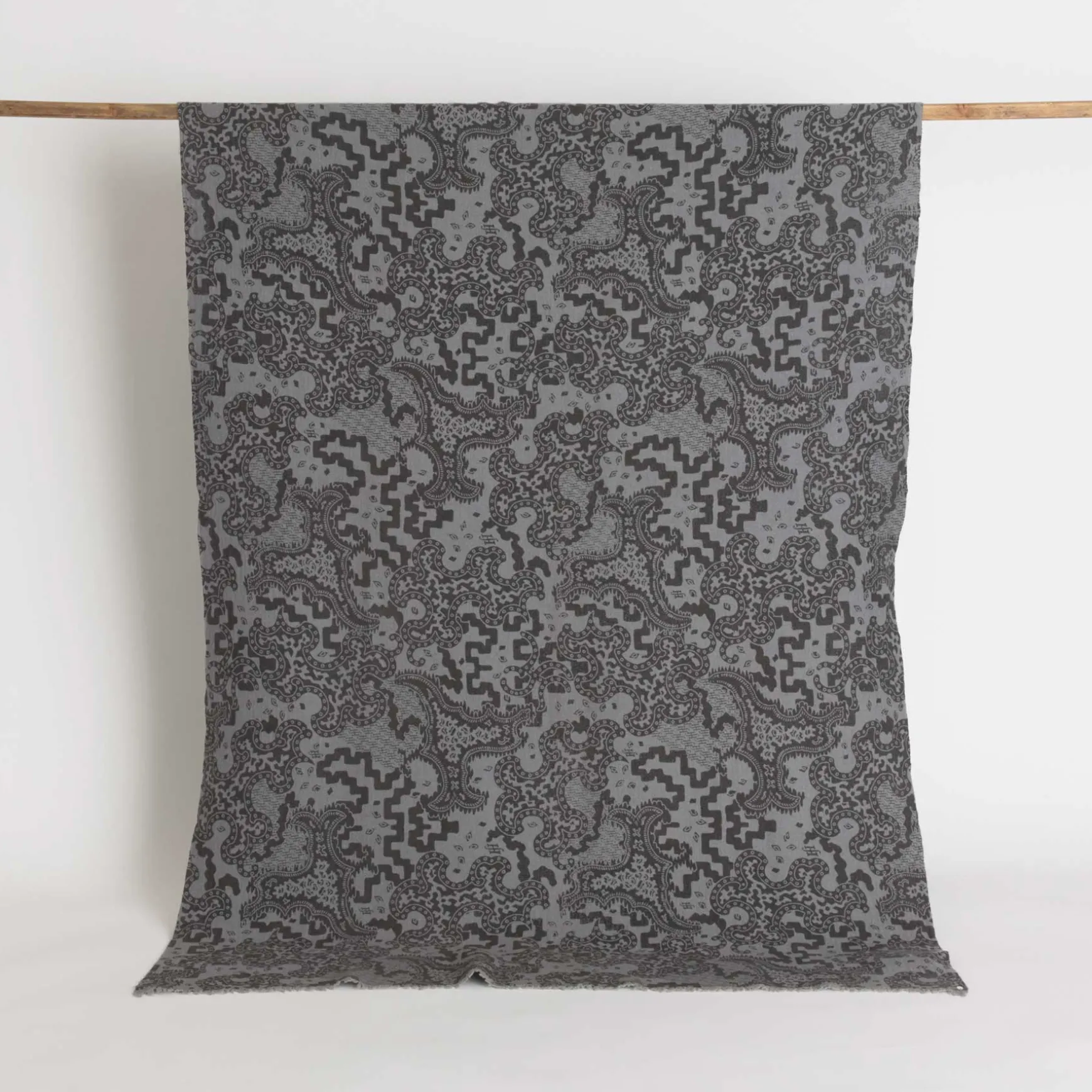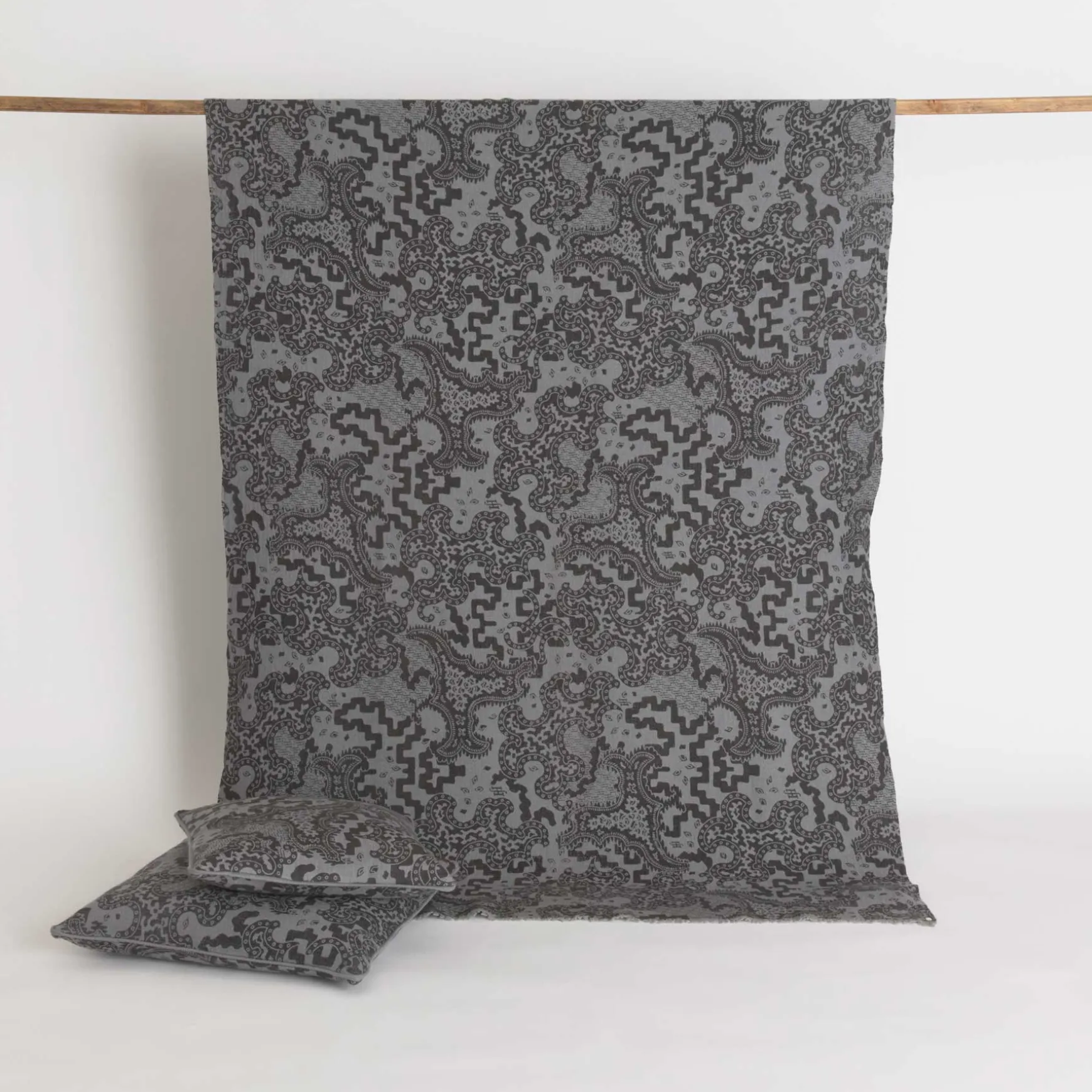 Die Decke wird in der Manufaktur in Nepal handgewebt und anschließend gefilzt. Ihre dichte Struktur mildert die Empfindlichkeit dieses mit Hand Sieb bedruckten, fragilen Materials.