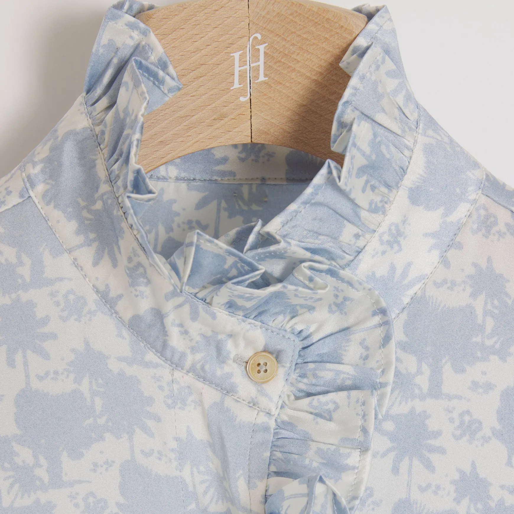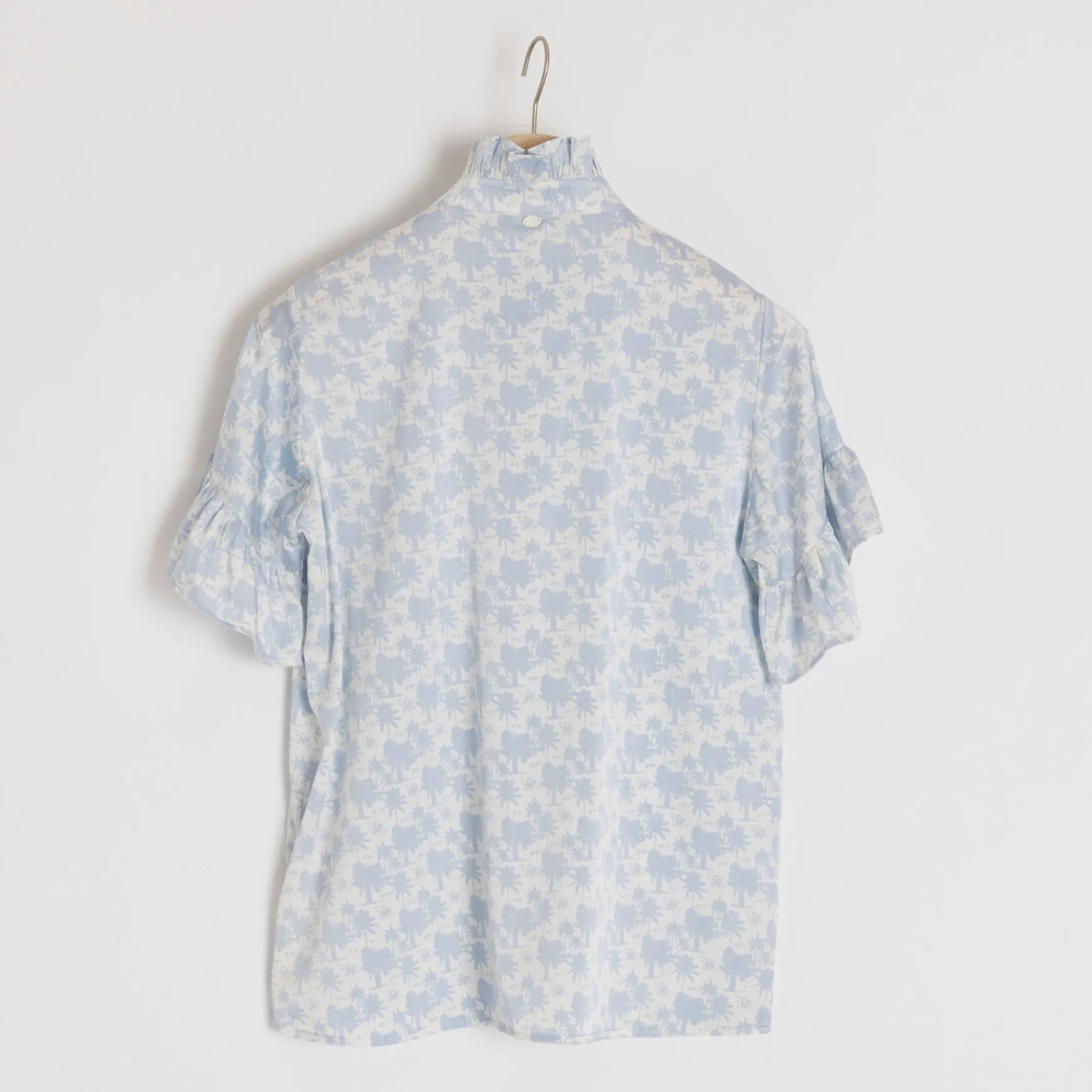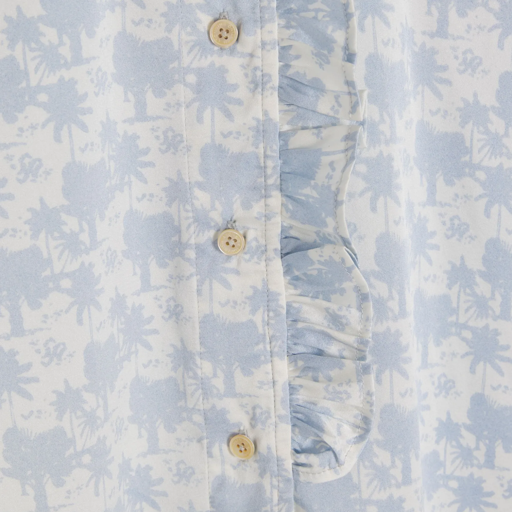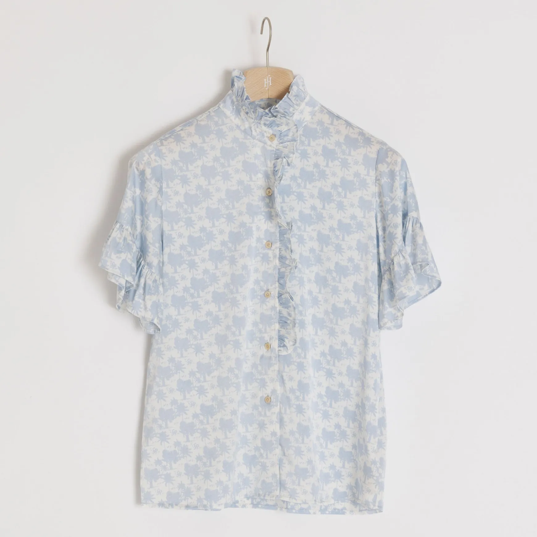 Kurzarm Bluse aus fließender Seide im All Over Print Palm Spring. Die Bluse überzeugt mit wunderschönen Rüschendetails und einer durchgehenden Knopfleiste.