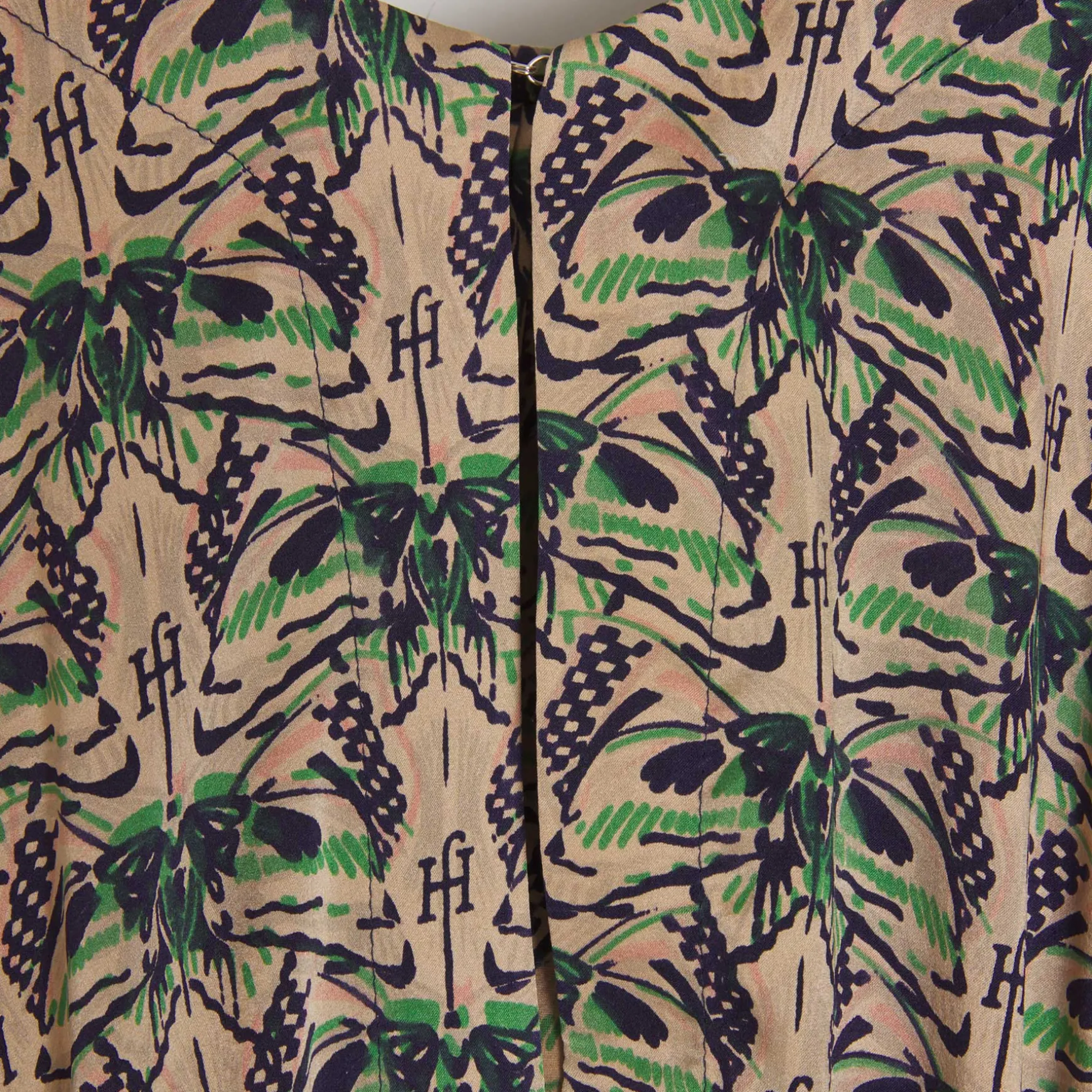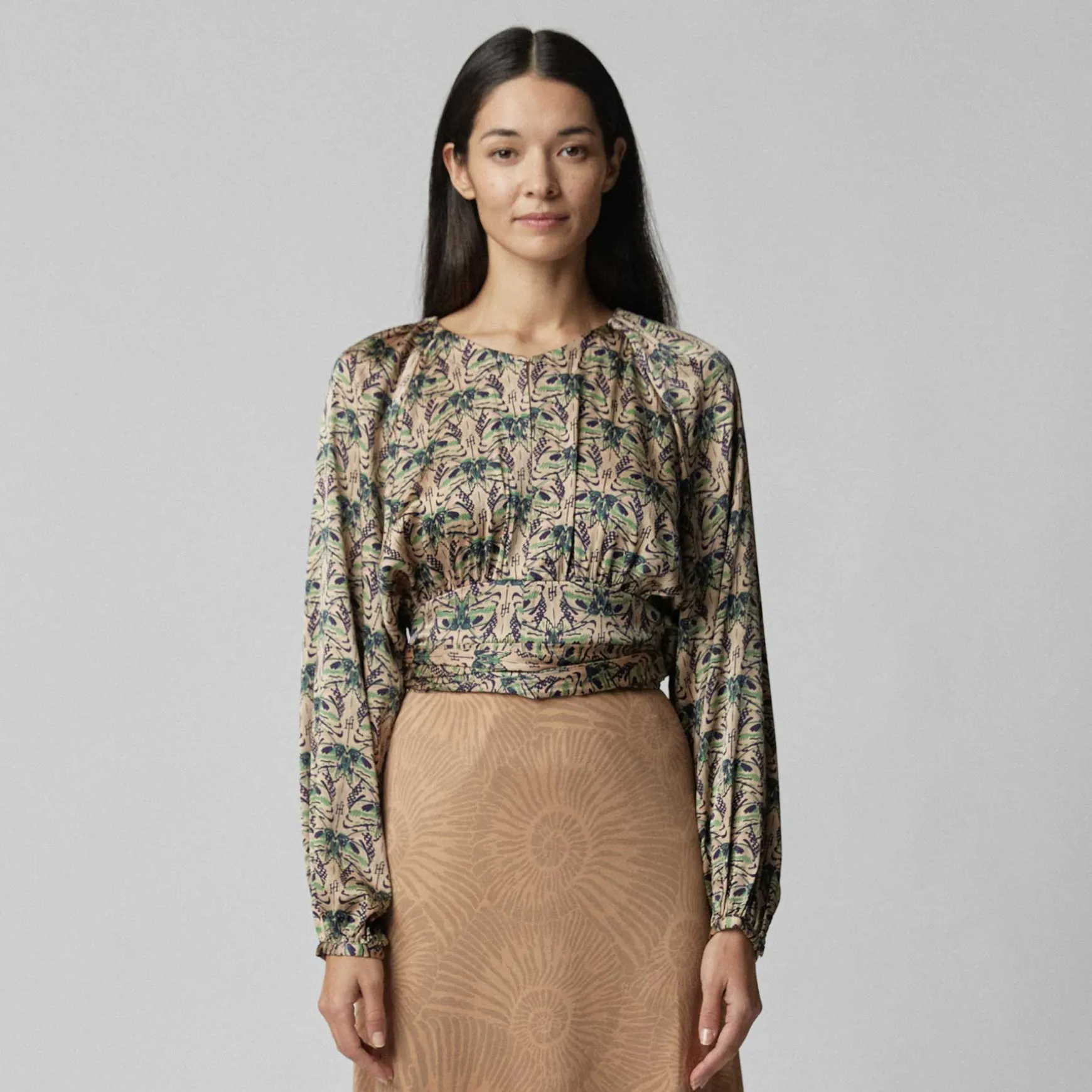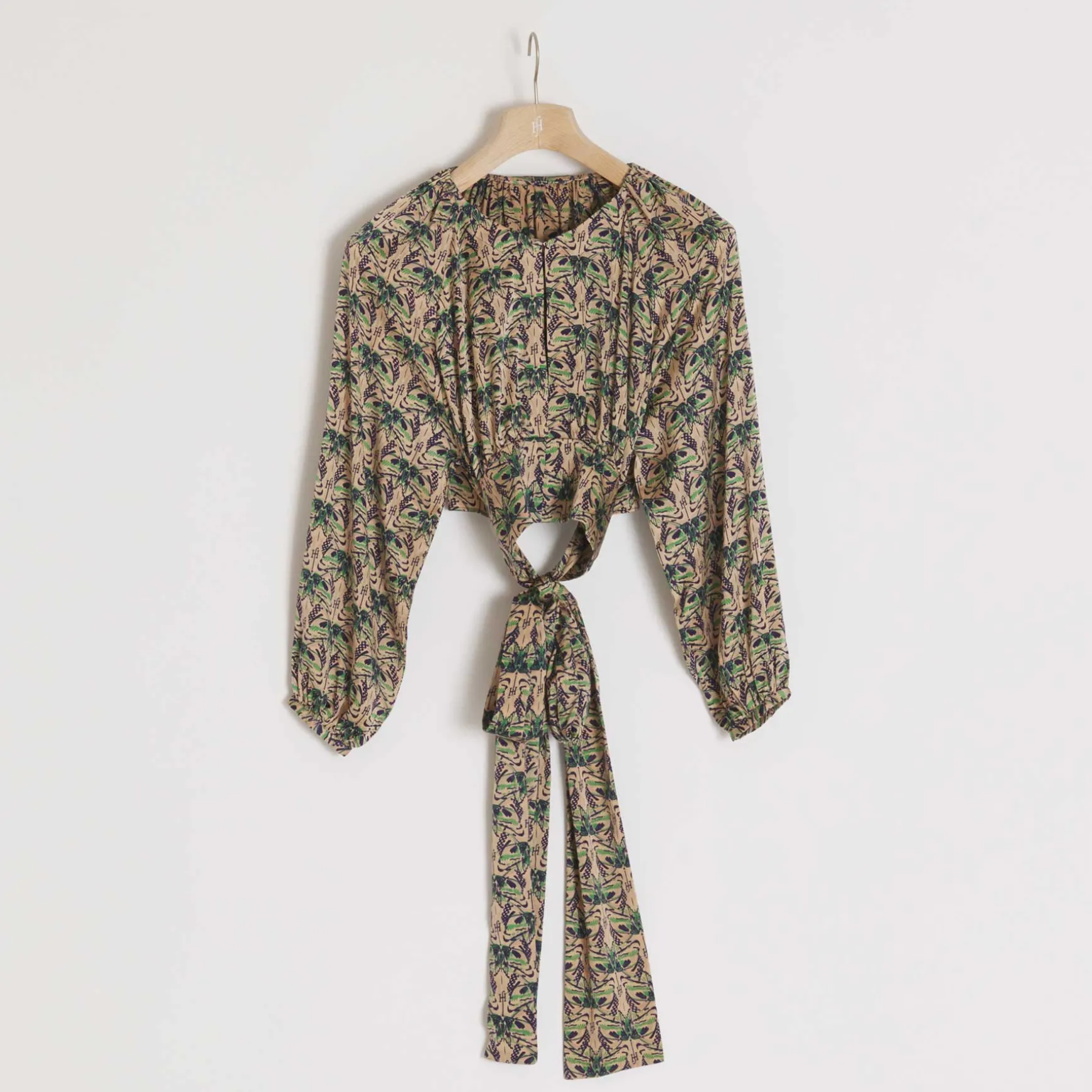 Kurz geschnittene Bluse aus fließender Seide im All Over Print Monarch Butterfly. Die Bluse überzeugt mit einer aufgesetzten Knopfleiste, Hemdkragen und einem Bindedetail. Das Shirt kann einzeln oder im Set mit der passenden Pants Baja Monarch Butterfly getragen werden.