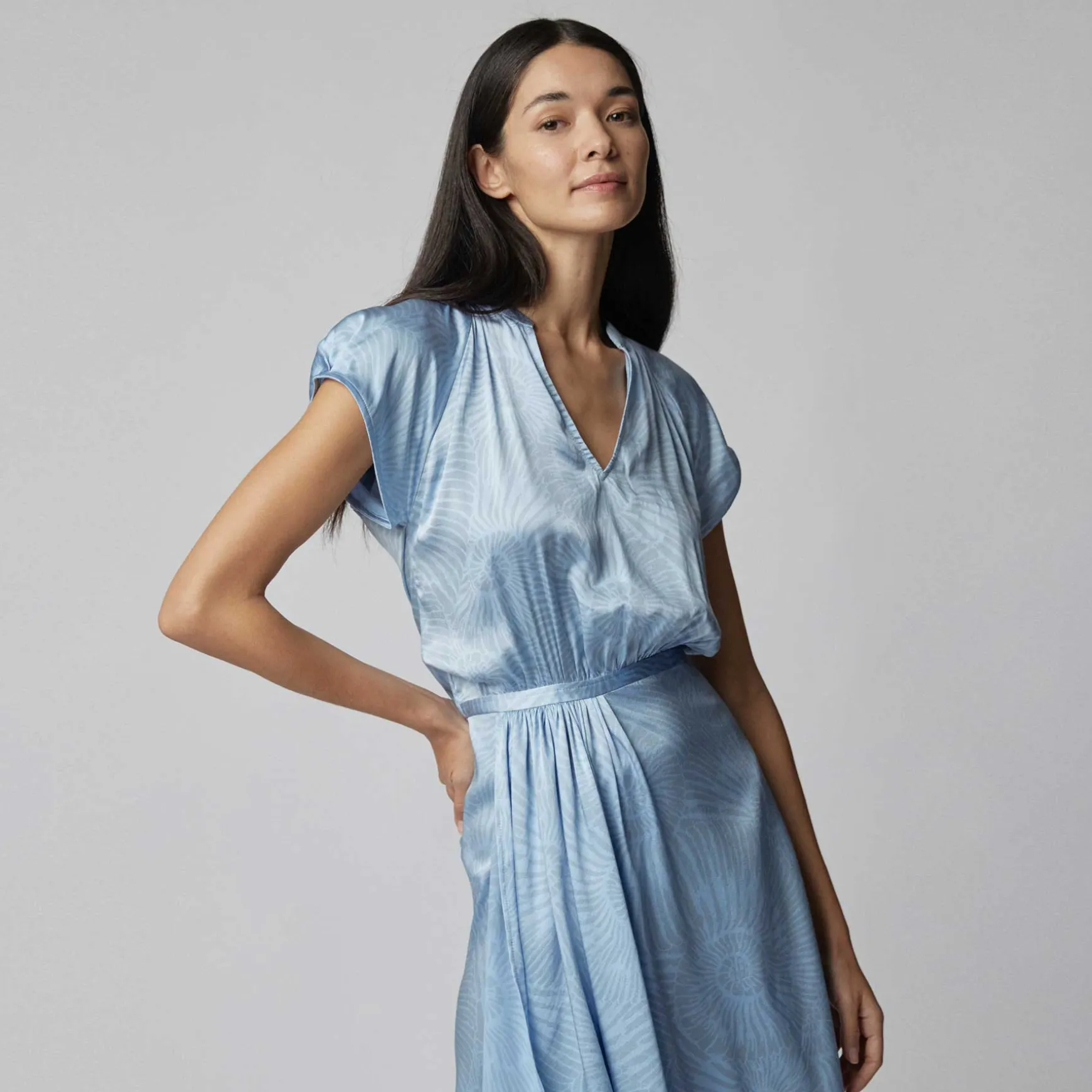 Das Material wird in der Manufaktur in Nepal per Hand aus Seidensatin gewebt. Anschließend wird der Print im Handsiebdruckverfahren auf der Seide platziert.