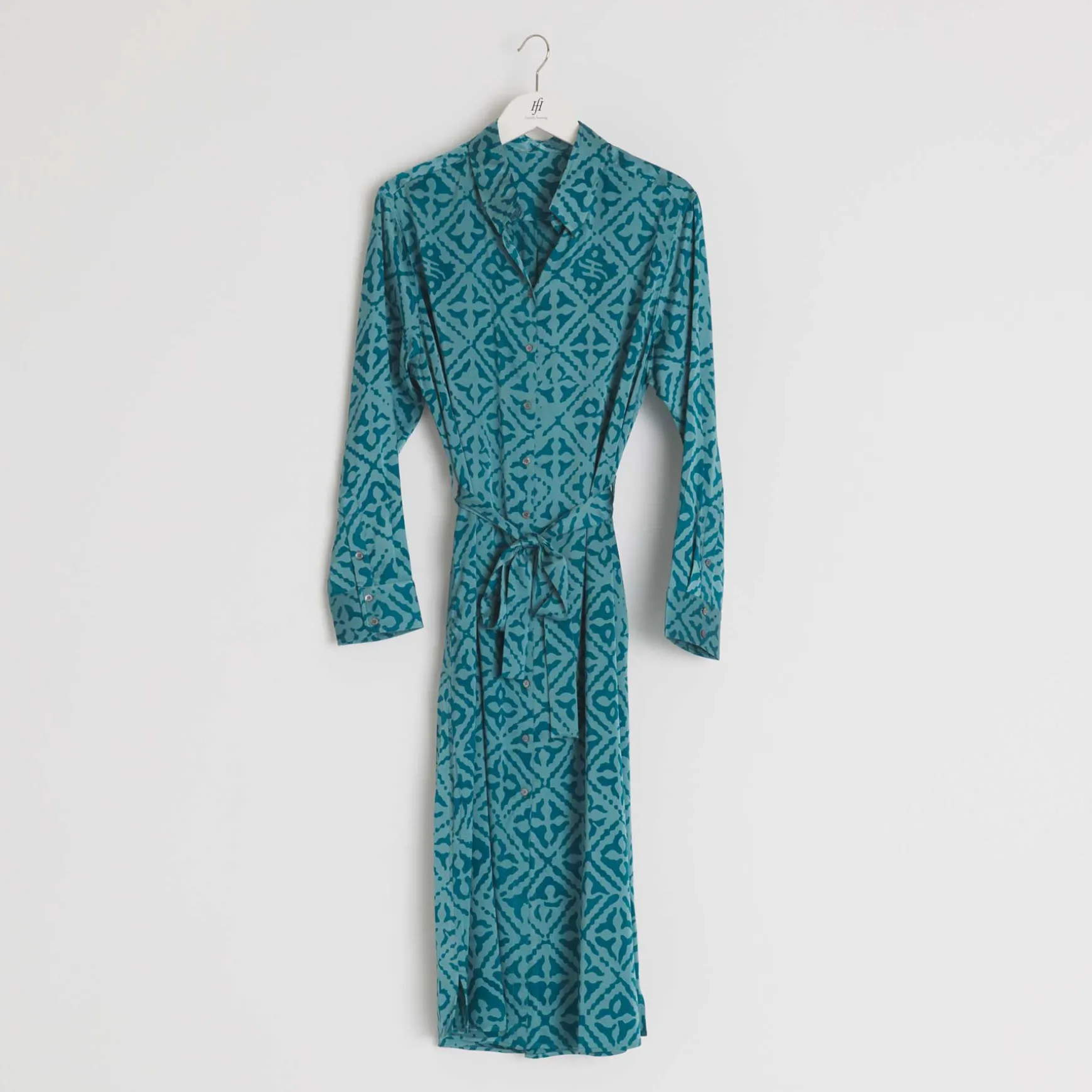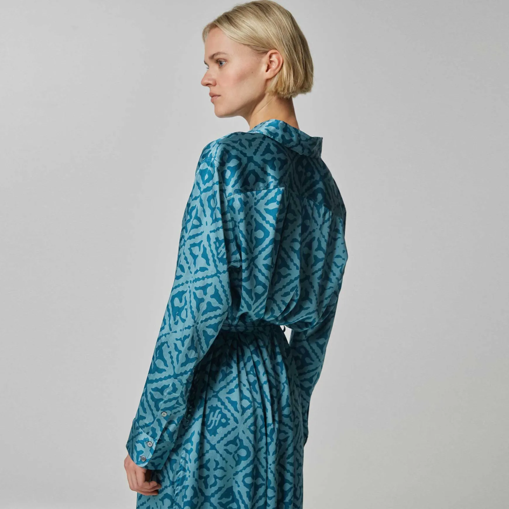 Kleid aus fließender Seide im Allover Signature Print Eyes of Marrakesh. Das Kleid überzeugt mit einer durchgehenden Knopfleiste, Hemdkragen und einem Bindegürtel in der Taille.