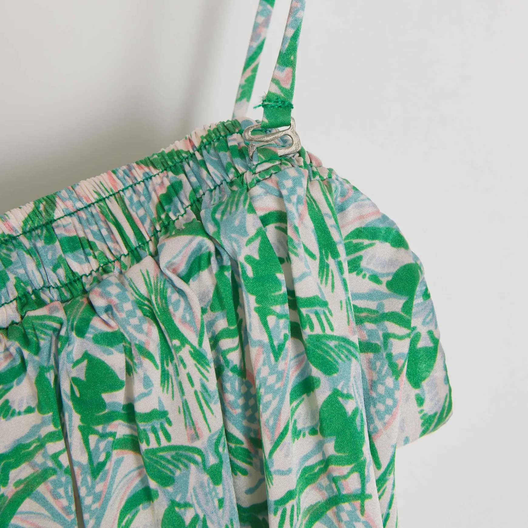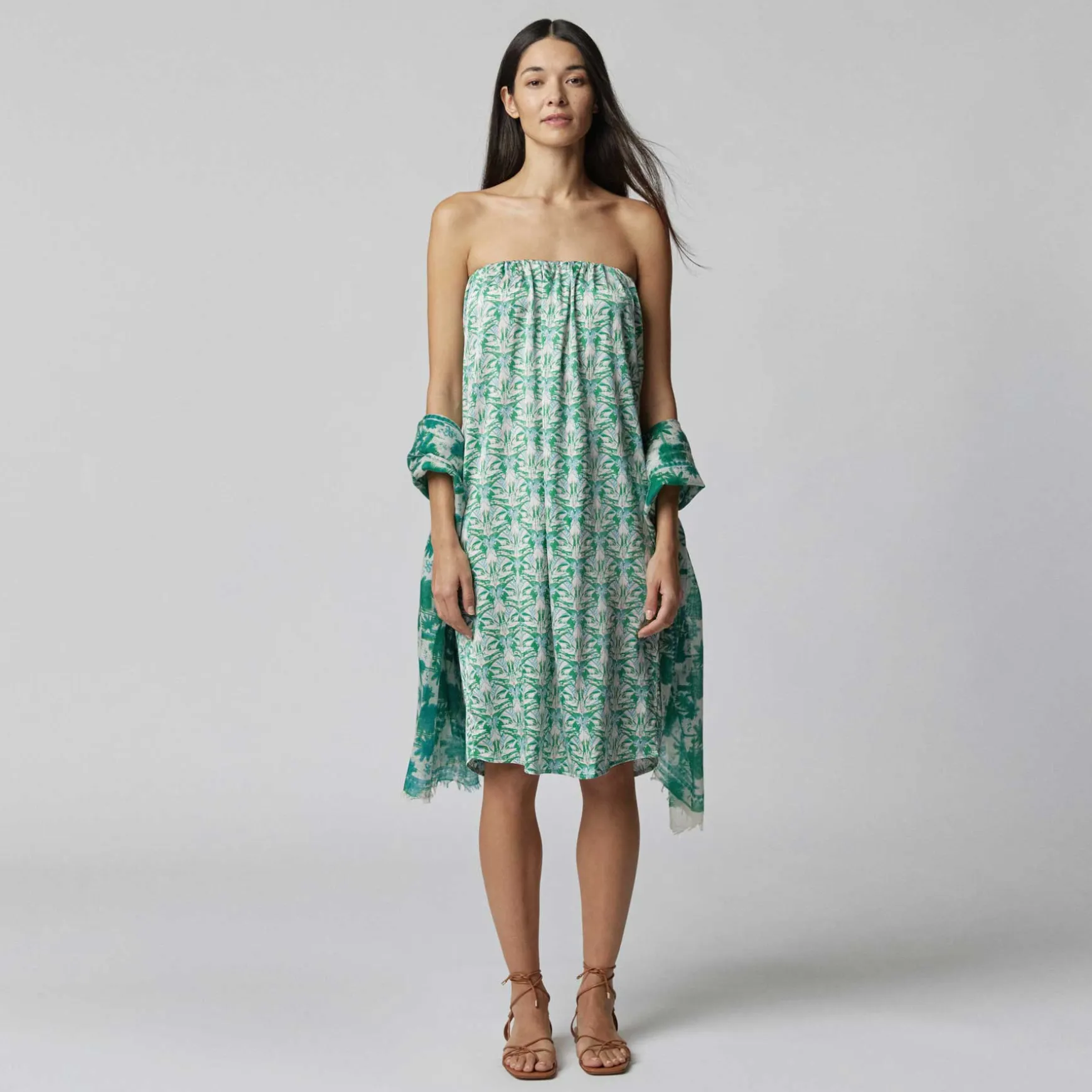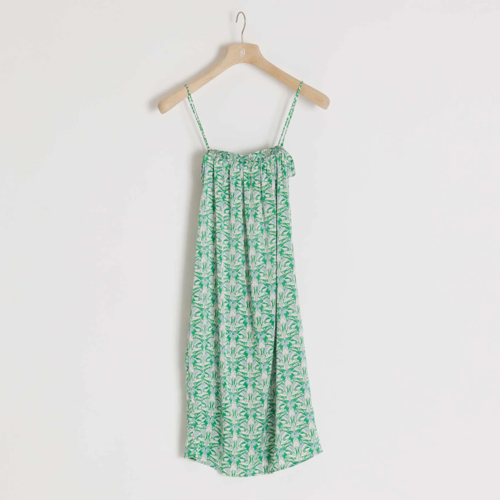 Gerade geschnittenes Kleid aus fließender Seide im All Over Print Monarch Butterfly. Die dünnen Spaghettiträger können abgenommen werden, so dass sich der Artikel in ein Bandeau Kleid verwandelt.