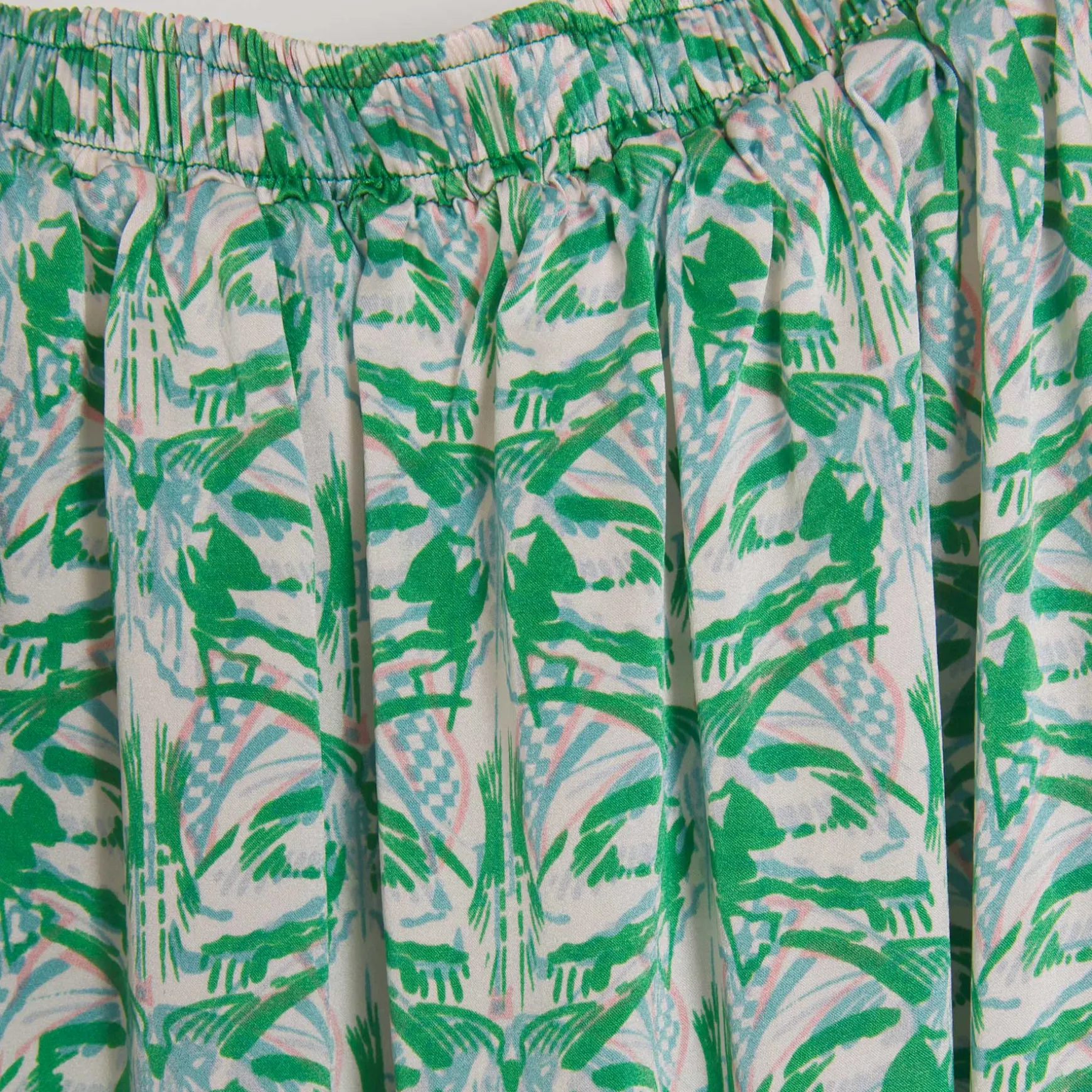 Das Material wird in der Manufaktur in Nepal per Hand aus Seidensatin gewebt. Anschließend wird der Print im Handsiebdruckverfahren auf der Seide platziert.