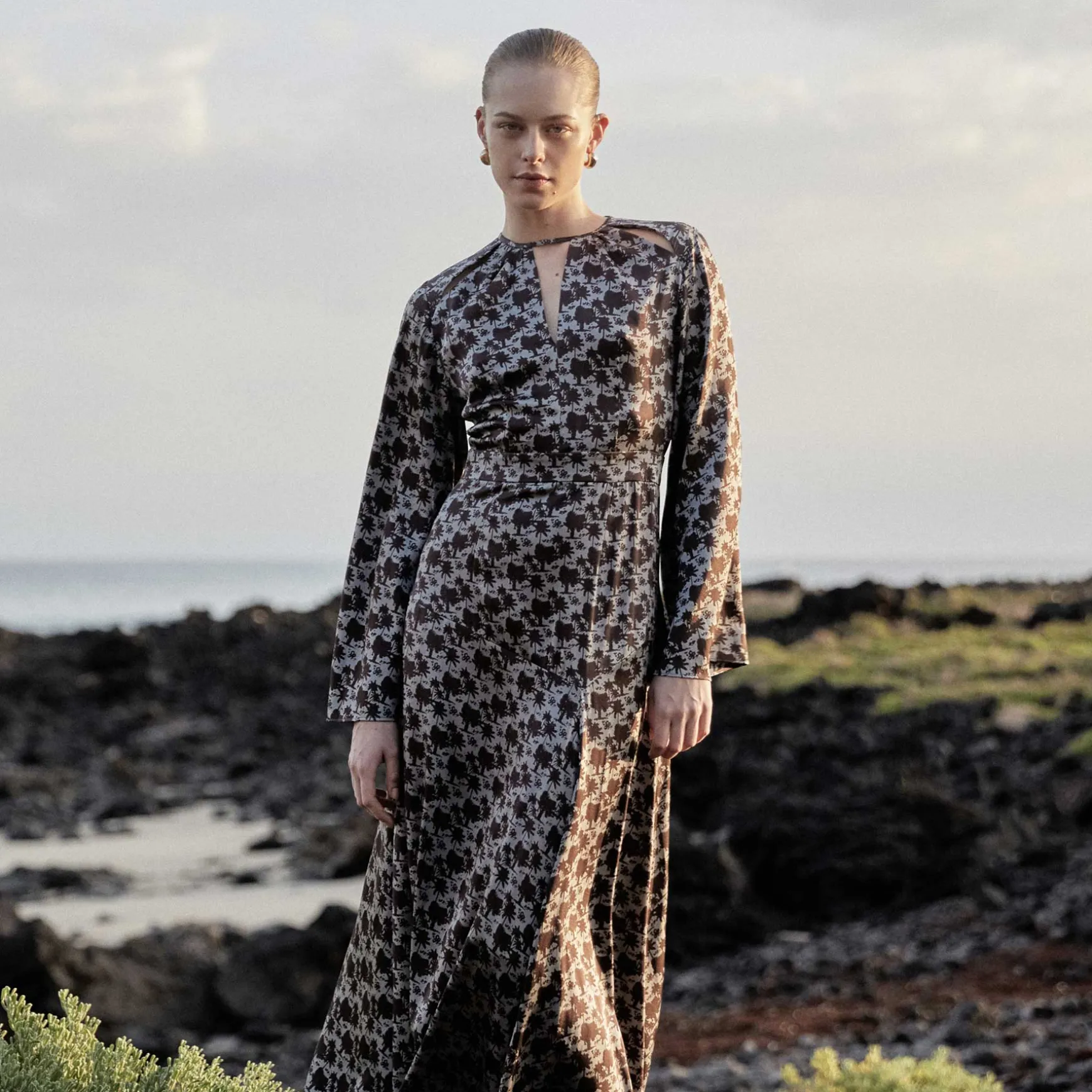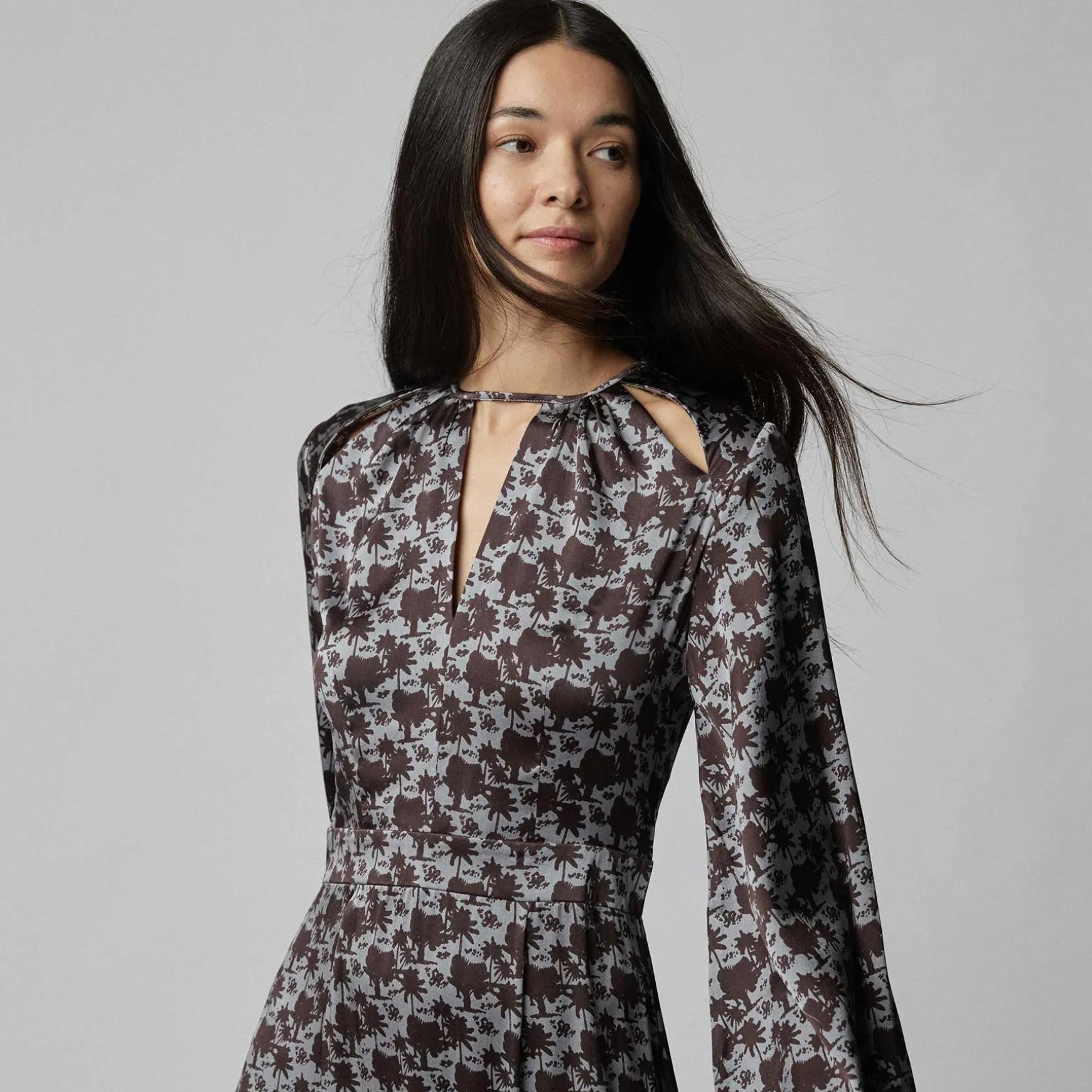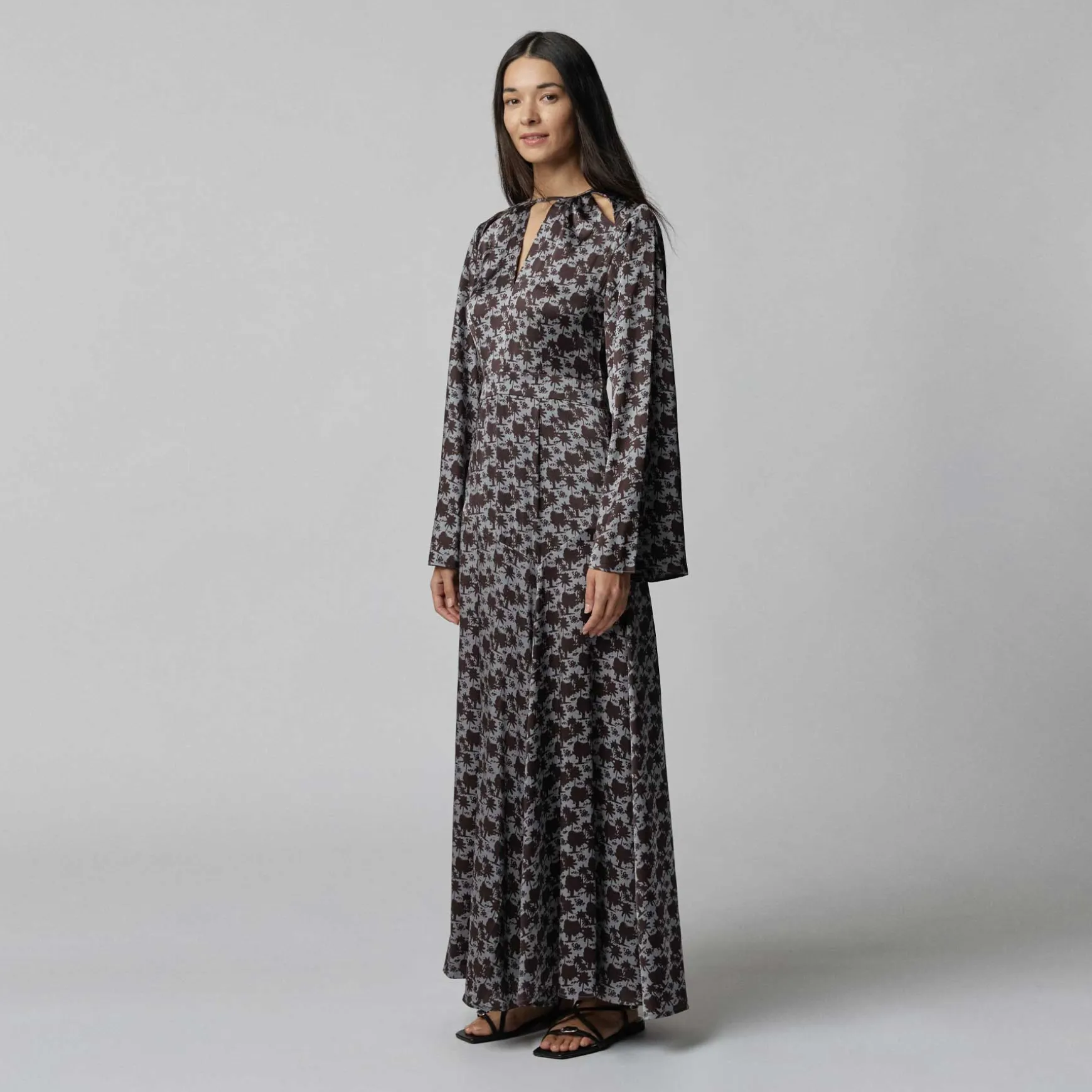 Maxikleid aus fließender Seite im All Over Print Palm Spring. Das Kleid überzeugt vor allem durch den schönen offenen Rücken, die Cut-Outs am Ausschnitt und den leichten Trompetenärmeln.