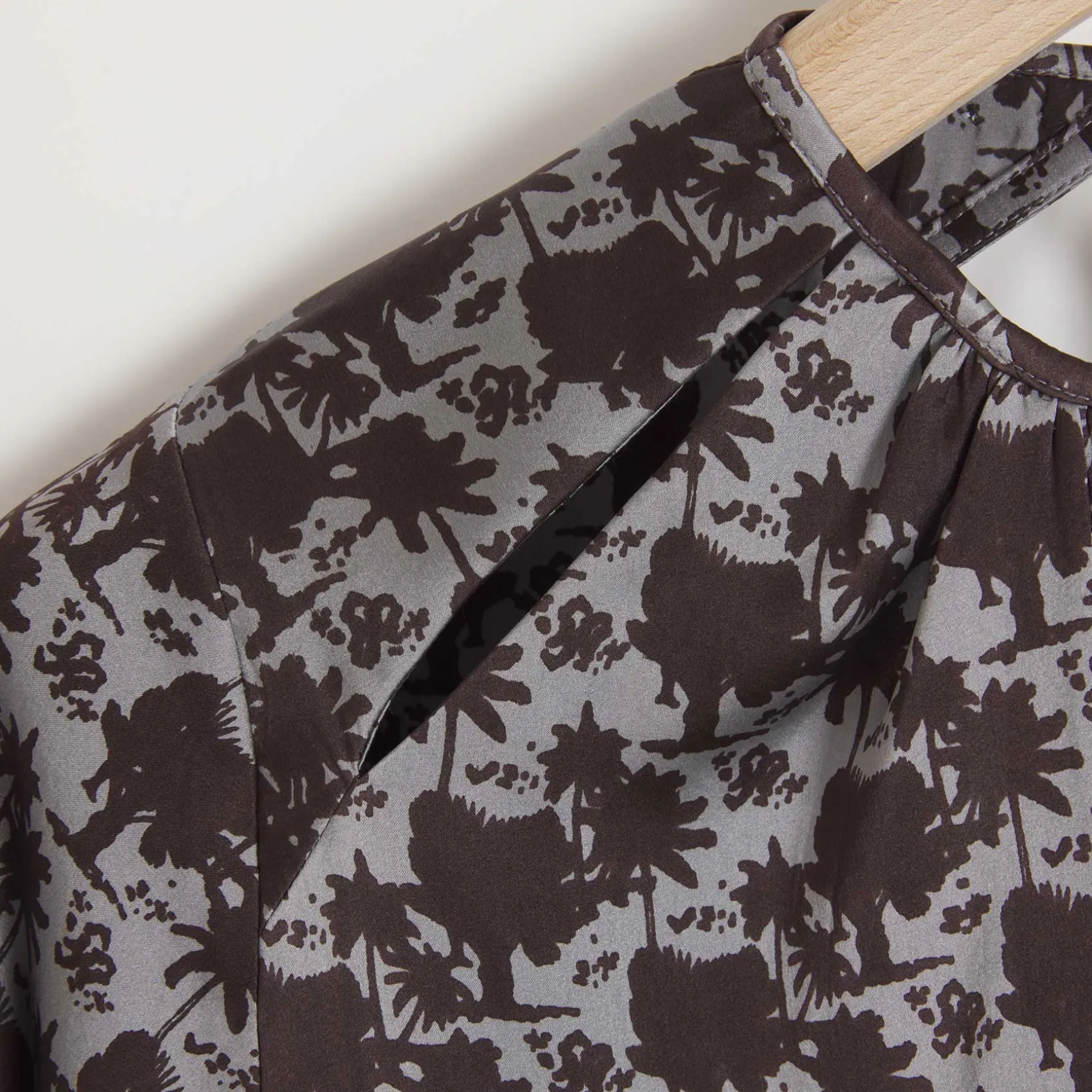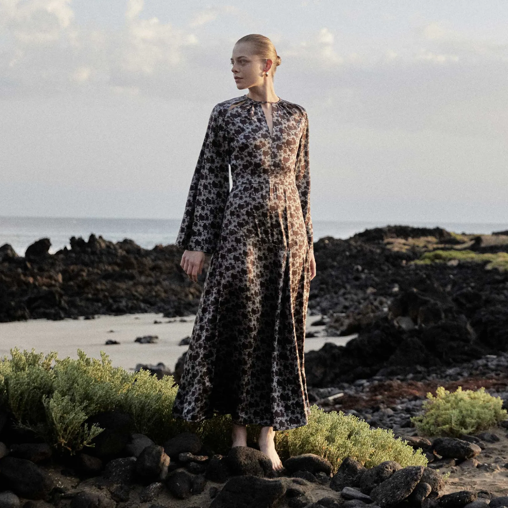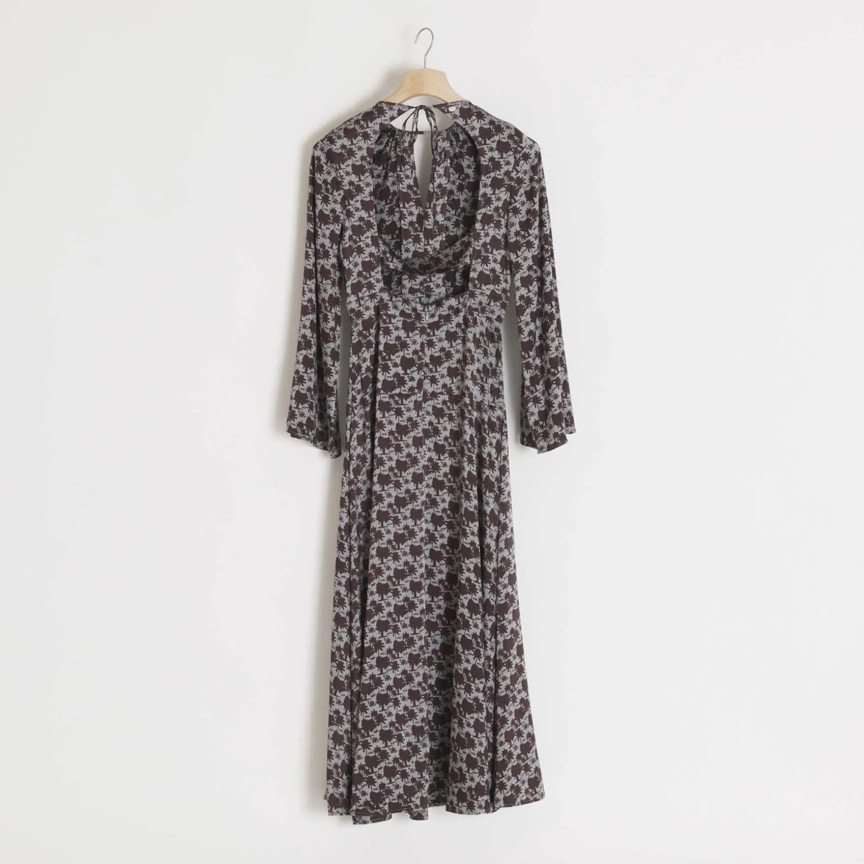 Maxikleid aus fließender Seite im All Over Print Palm Spring. Das Kleid überzeugt vor allem durch den schönen offenen Rücken, die Cut-Outs am Ausschnitt und den leichten Trompetenärmeln.