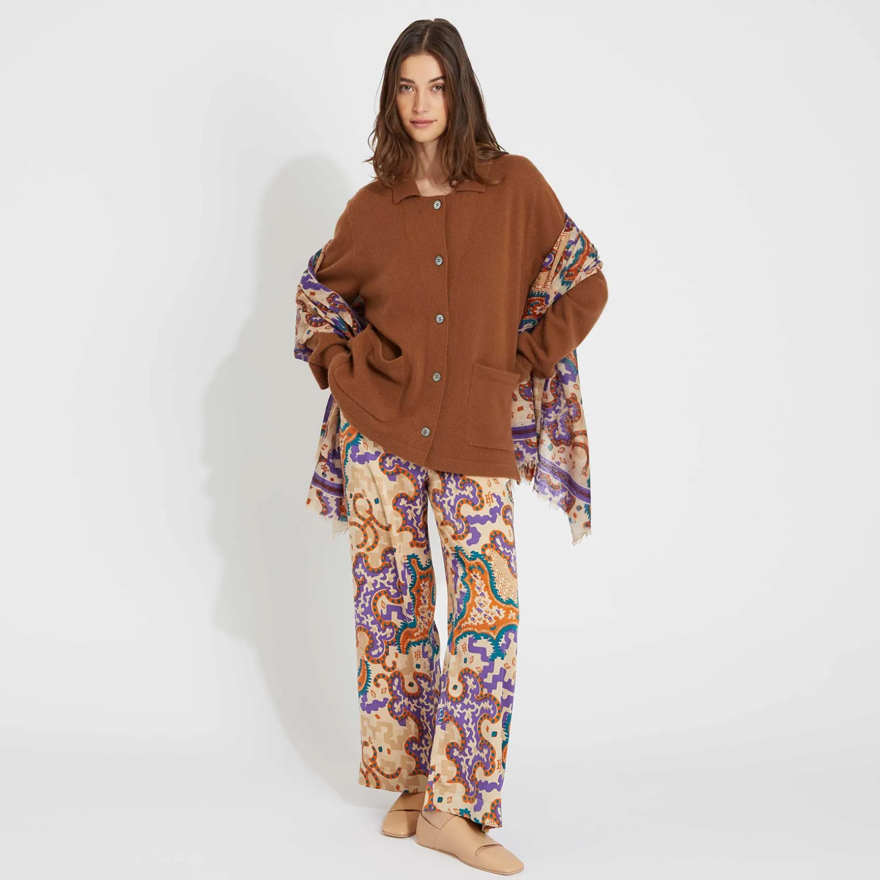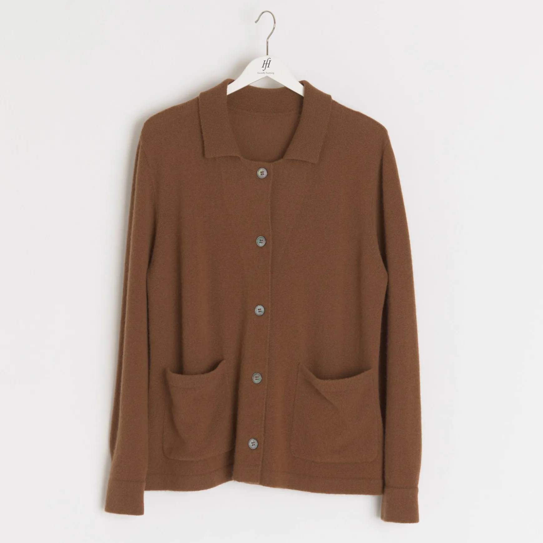 Feinste Handarbeit aus feinem Cashmere Garn macht diese wunderschöne Strickjacke zu einem Hingucker. Der Cardigan überzeugt mit einem außergewöhnlichen Kragen und aufgesetzten Taschen.