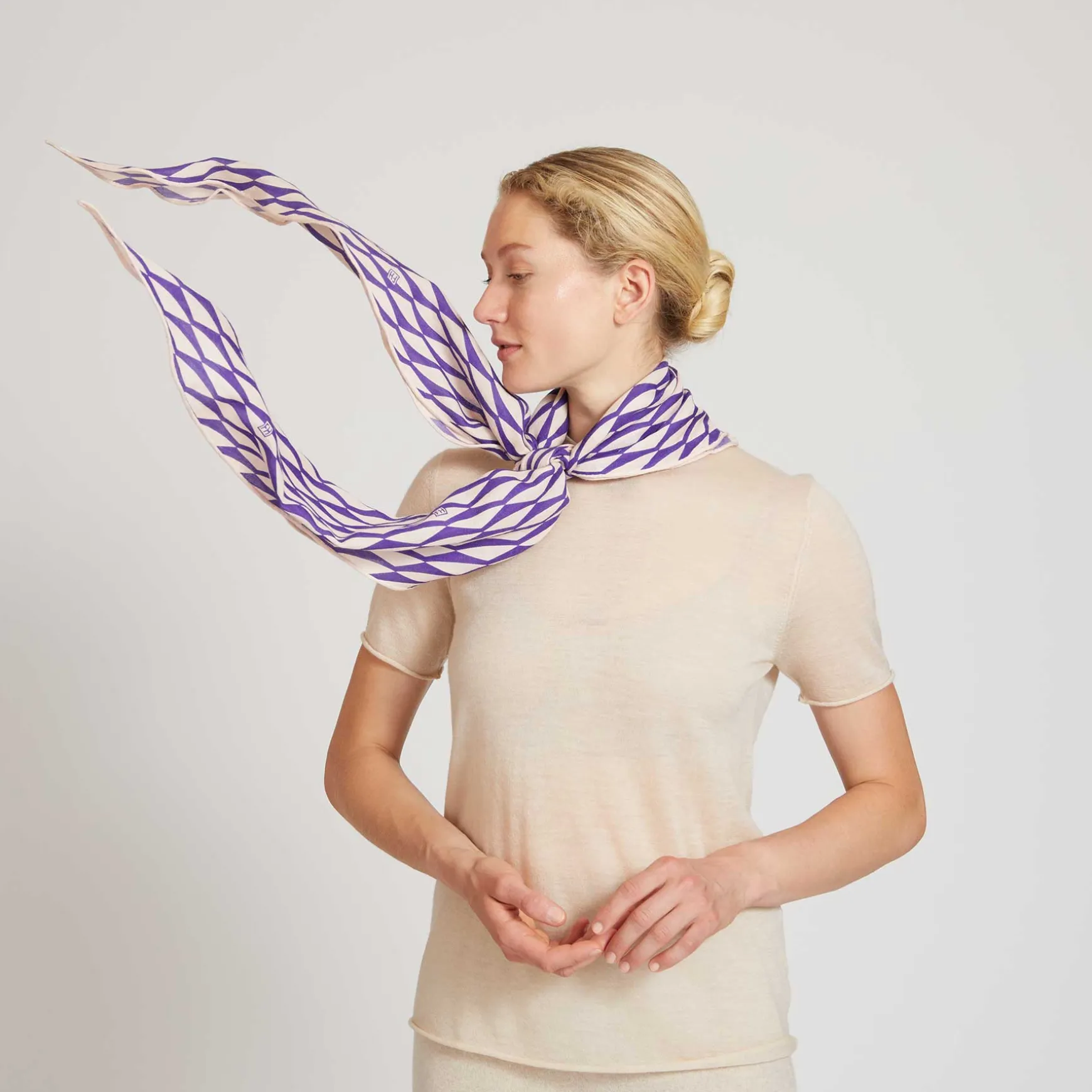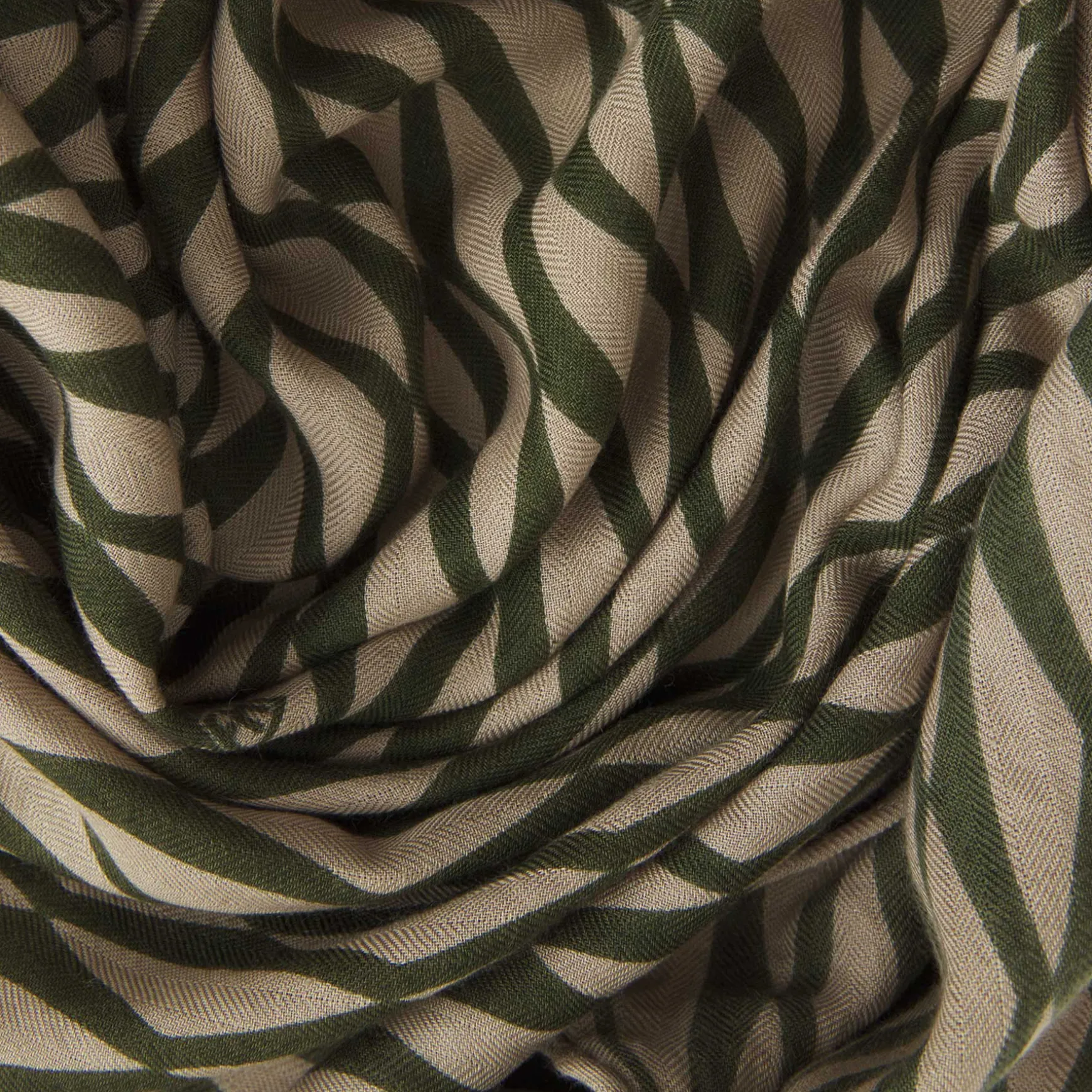 Seine Trapezform macht ihn sehr besonders und seine Mischung aus Seide und Kaschmir ist luftig und anschmiegsam. Er wird in der Manufaktur handgewebt und anschließend im Handsiebdruck bedruckt.