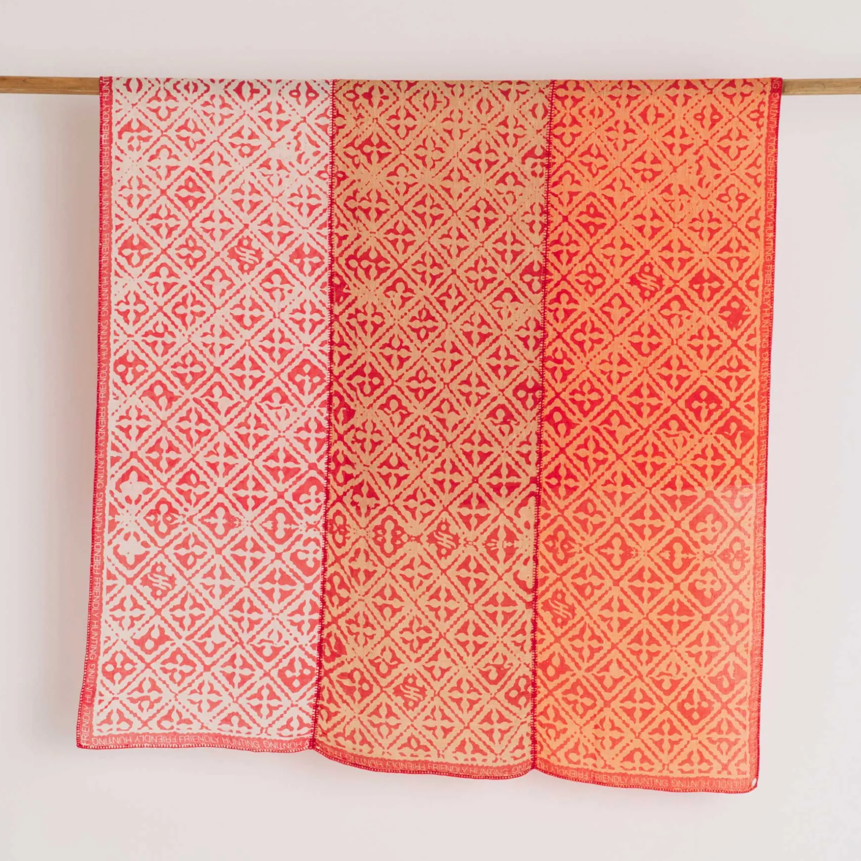 Der friendly hunting Linen Cashmere Patch wird per Hand in unserer Manufaktur in Nepal aus einem luxuriösen Leinen-Cashmere-Garn in drei einzelne Teile gewebt und anschließend gefilzt. Seine dichte Struktur mildert die Empfindlichkeit dieses fragilen Materials. Die Einzelstücke werden anschließend individuell gefärbt und Ihre Prints im Handsiebdruck platziert. Zuletzt werden sowohl die drei Teile zu einem Schal als auch die Außenränder zur Verzierung gehäkelt.