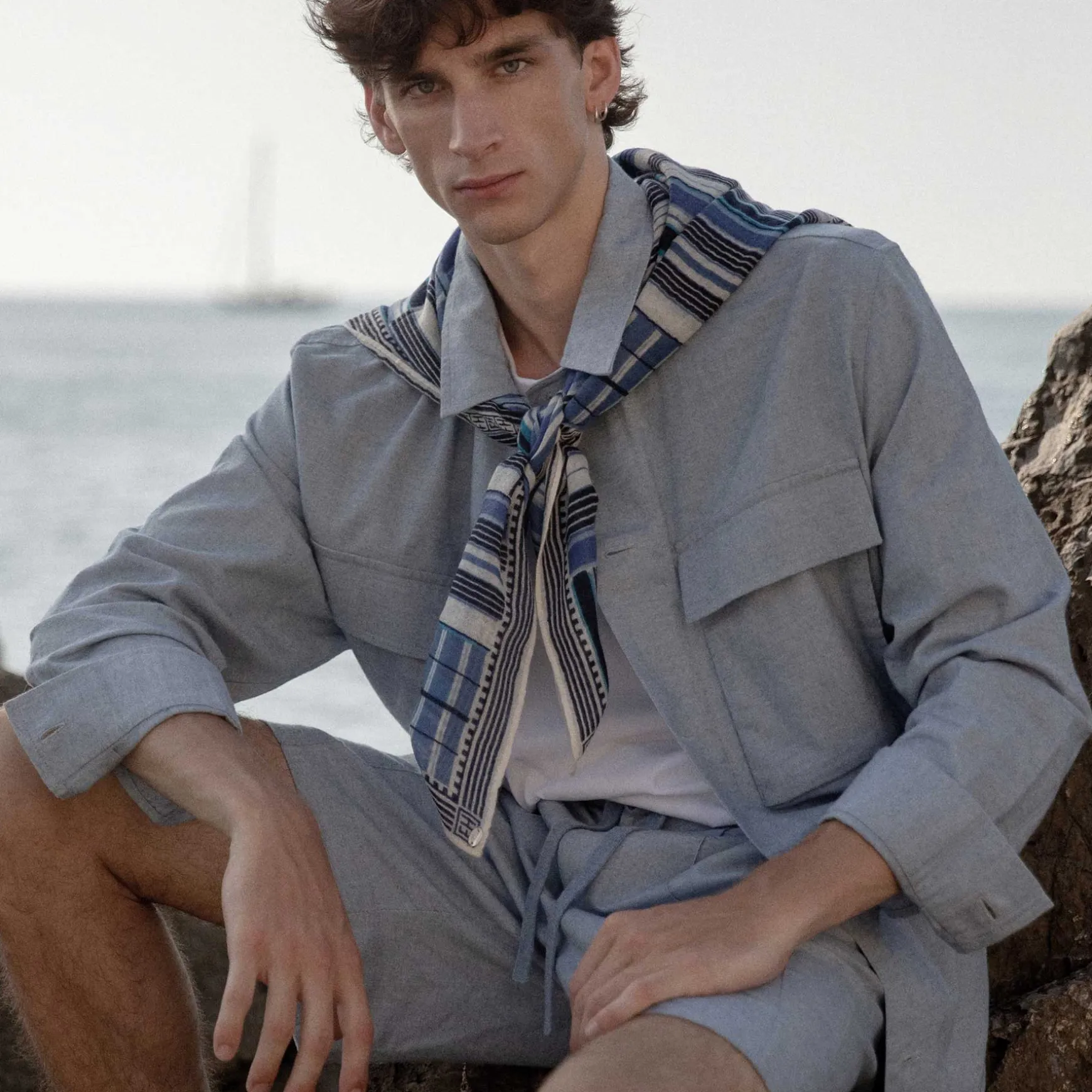 Leichte Jacke in hellem Blau mit Knopfleiste aufgesetzten Taschen.