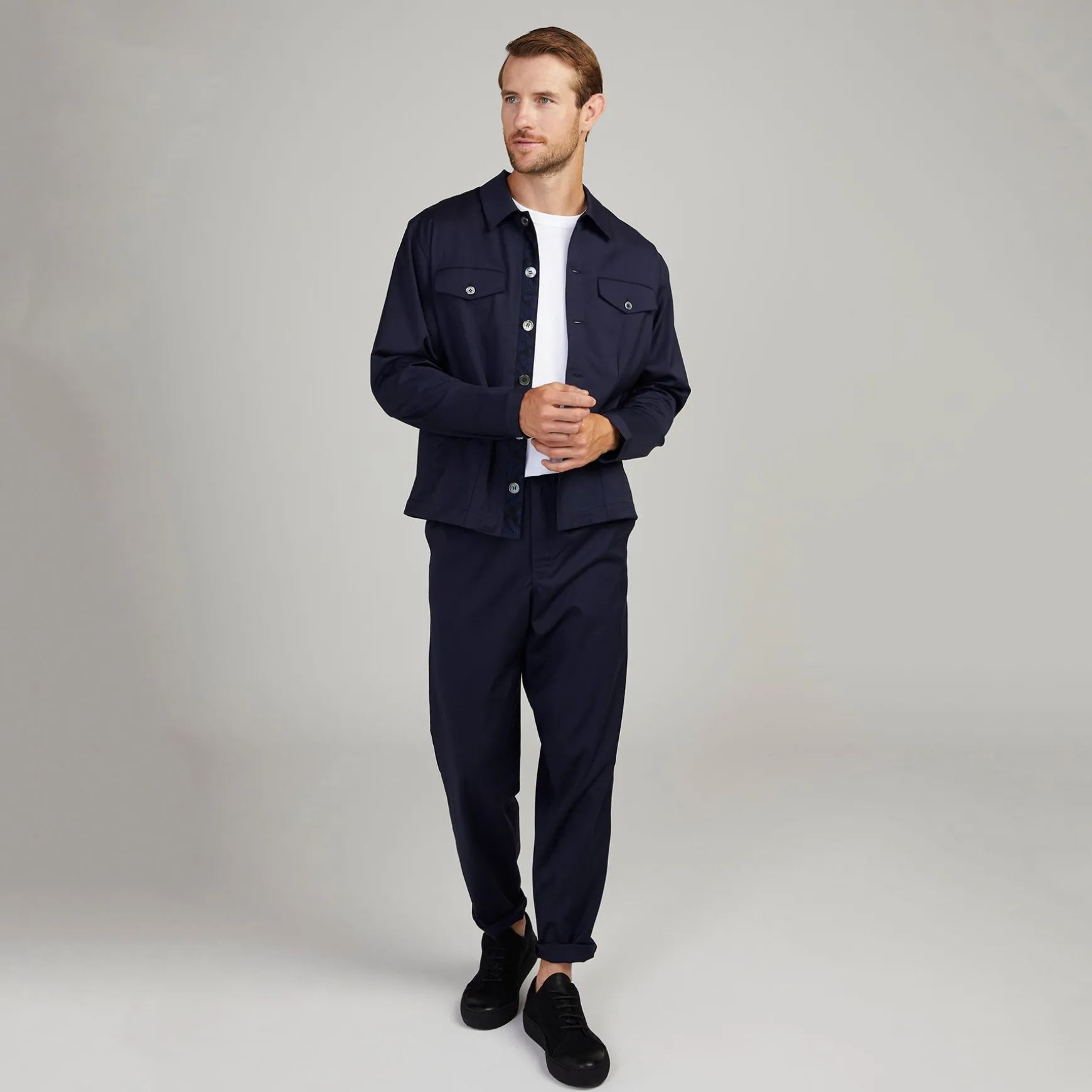 Sportliche Traveler Hose in dunklem Blau mit Gummibund und seitlichen Taschen.