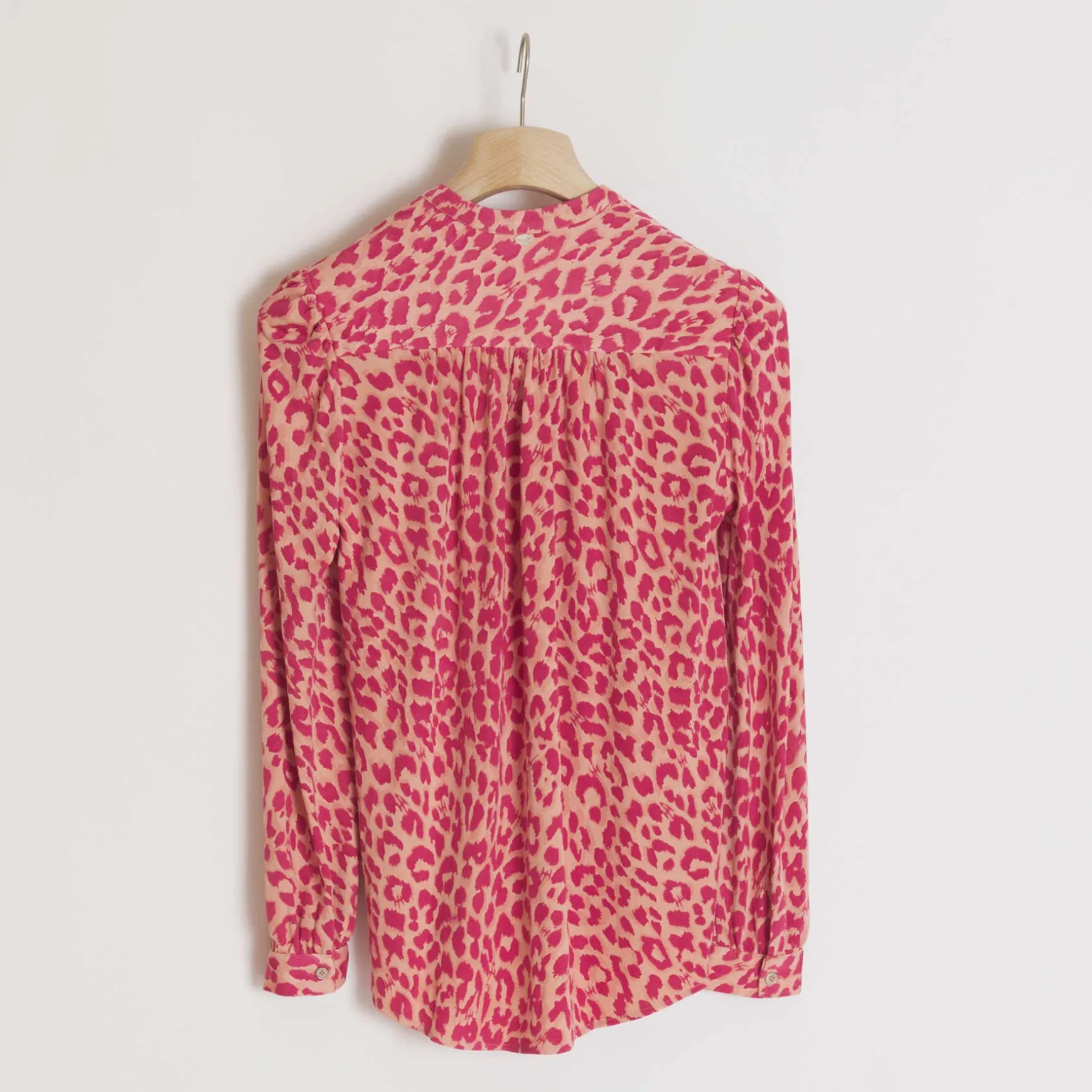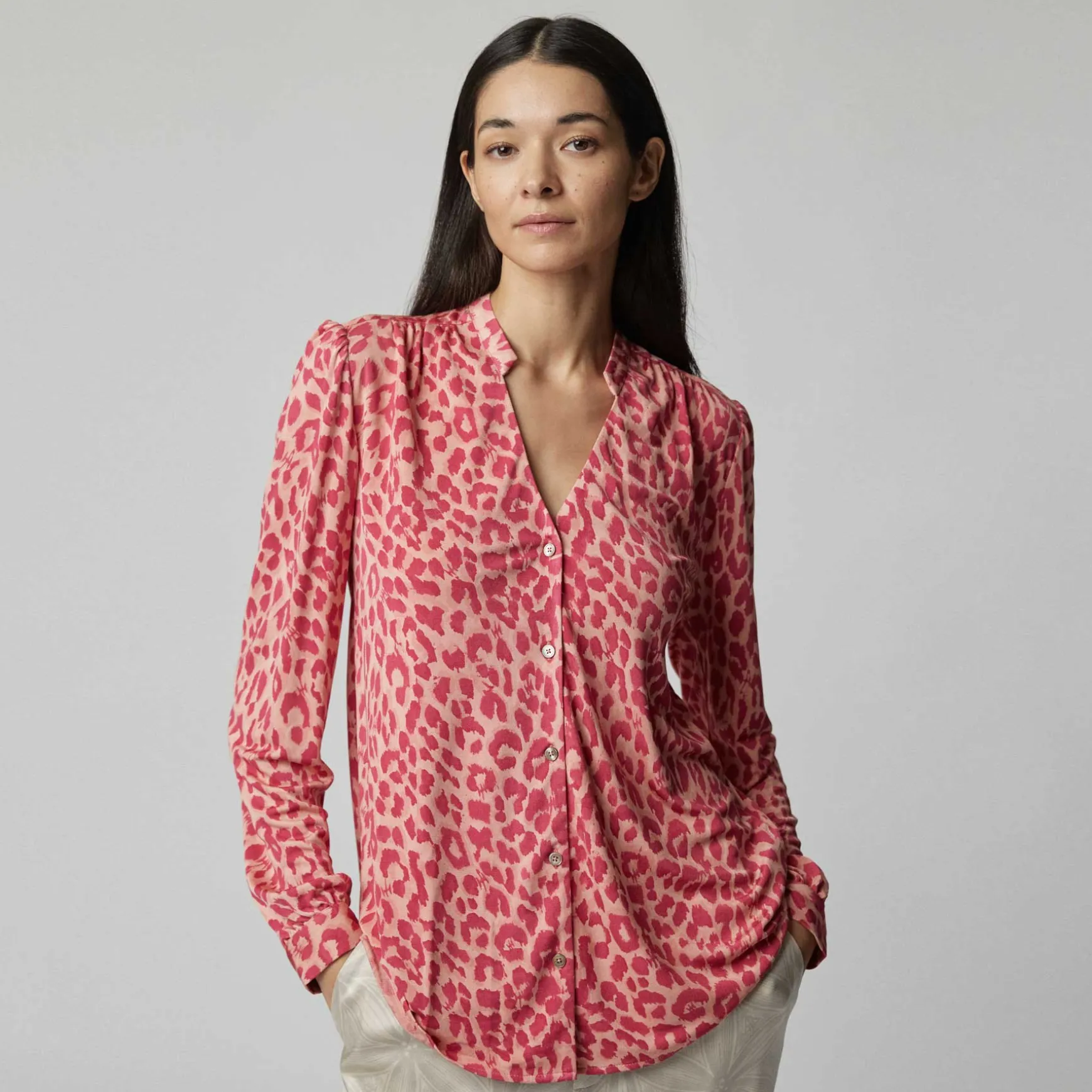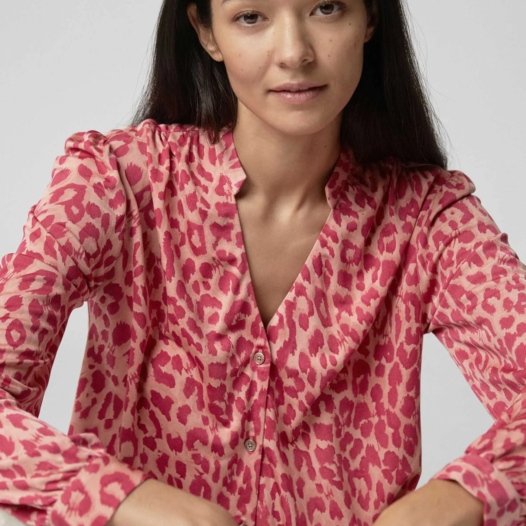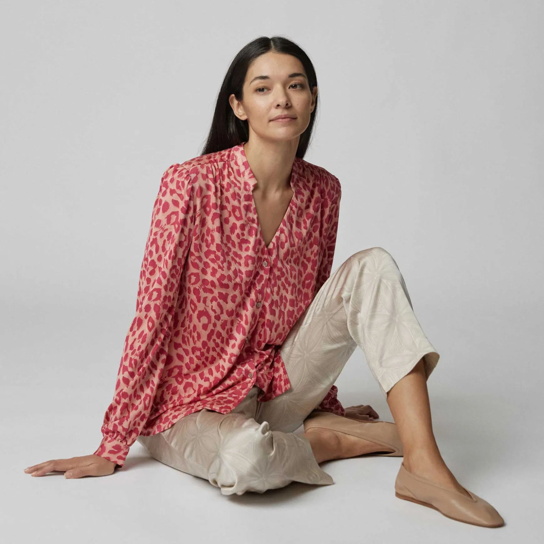 Das Material wird in der Manufaktur in Nepal aus 100% Seidenjersey gestrickt. Anschließend wird der Print im Handsiebdruckverfahren auf der Seide platziert.