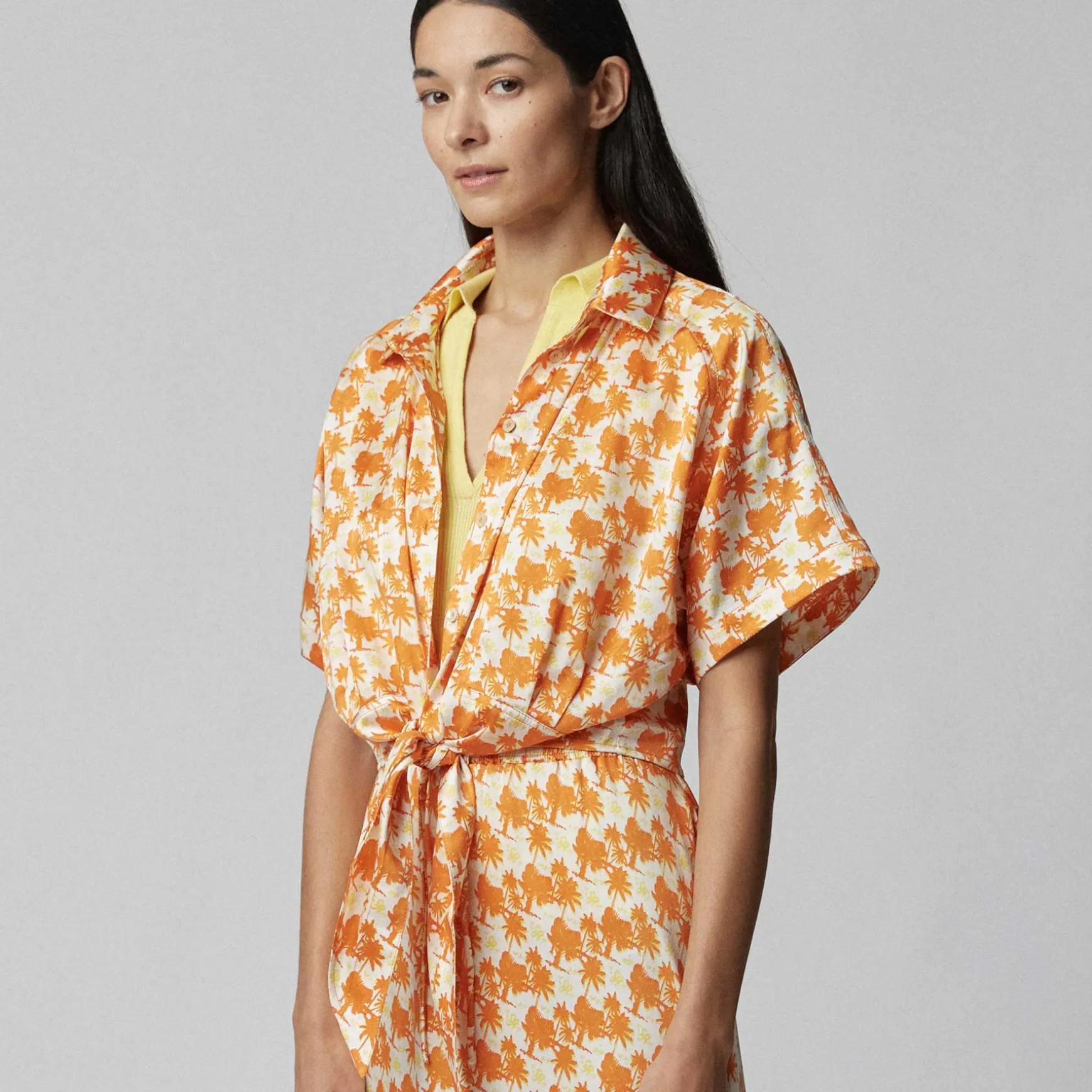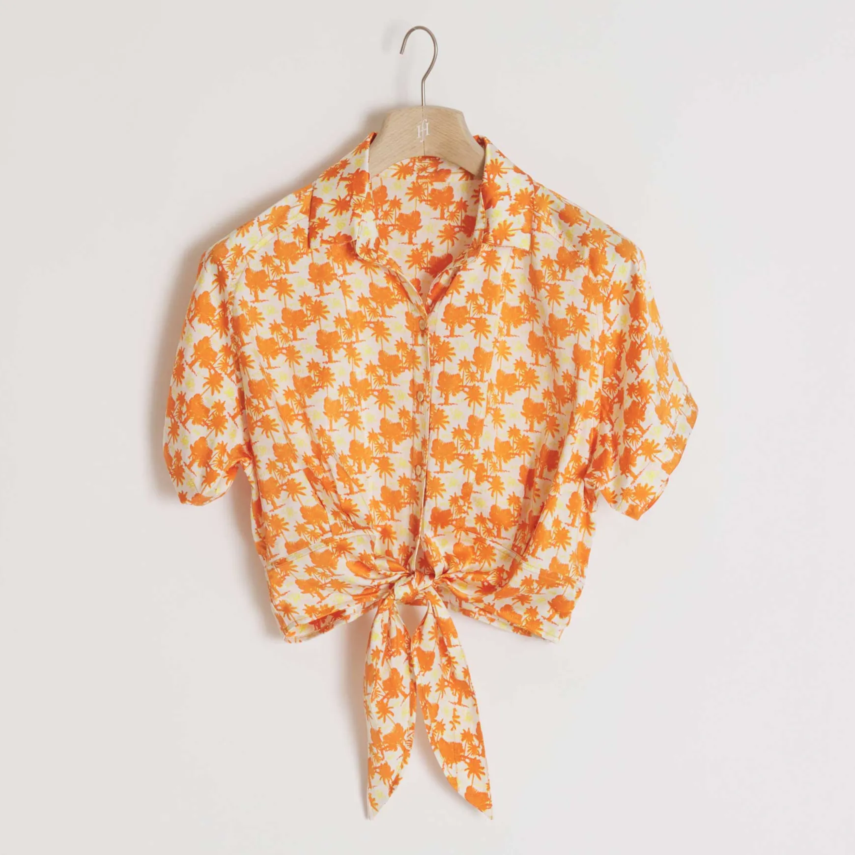Kurz geschnittene Bluse aus fließender Seide im All Over Print Palm Spring. Die Bluse überzeugt mit einer aufgesetzten Knopfleiste, Hemdkragen und einem Bindedetail. Das Shirt kann einzeln oder im Set mit dem passenden Skirt Estoy Palm Spring getragen werden.