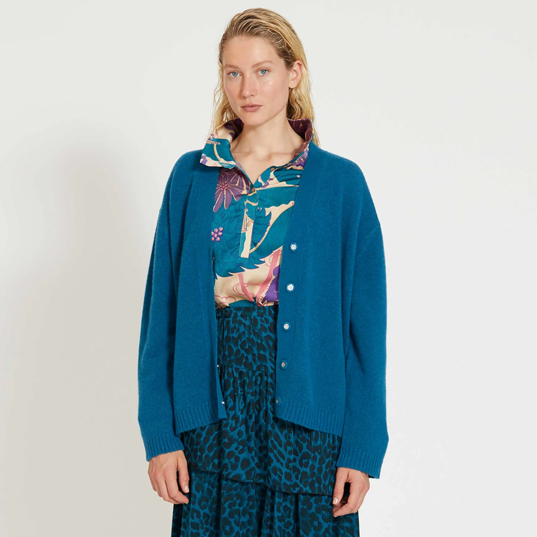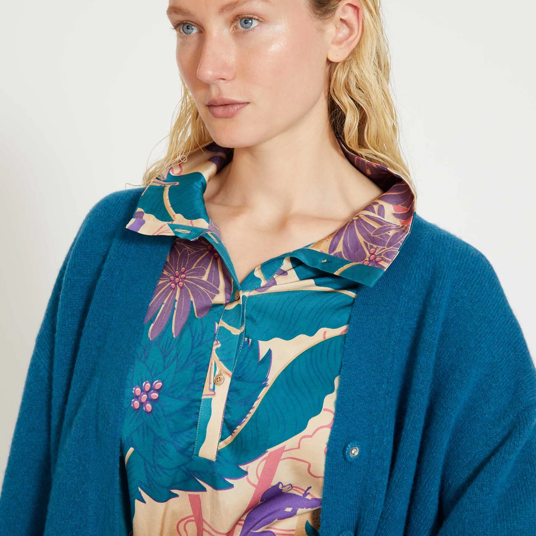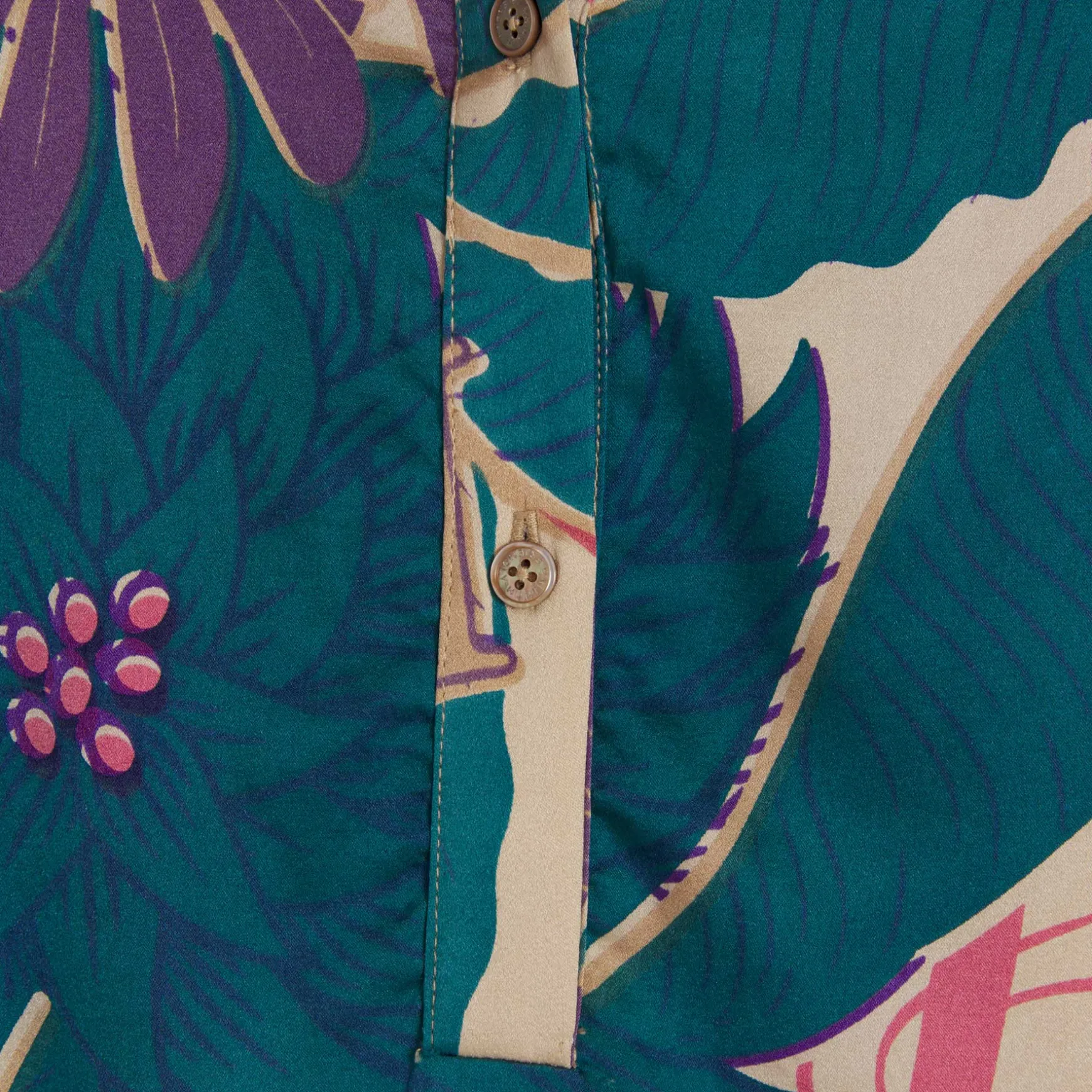 Relaxed geschnittene Bluse aus fließender Seide im Allover Print Monkey Dance. Die Bluse überzeugt mit vielen Details: Stehkragen, aufgesetzter Knopfleiste und Ärmelbündchen mit Knopfverschluss.