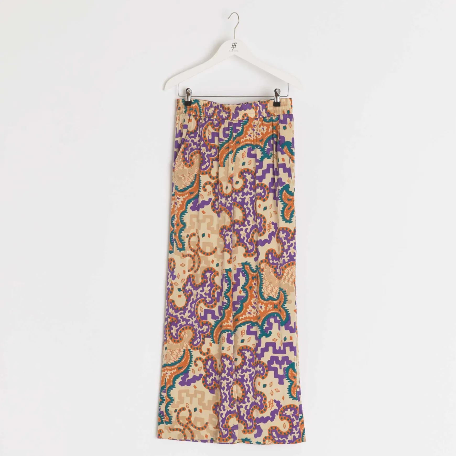 Das Material wird in der Manufaktur in Nepal per Hand aus Seidensatin gewebt. Anschließend wird der Print im Handsiebdruckverfahren auf der Seide platziert.