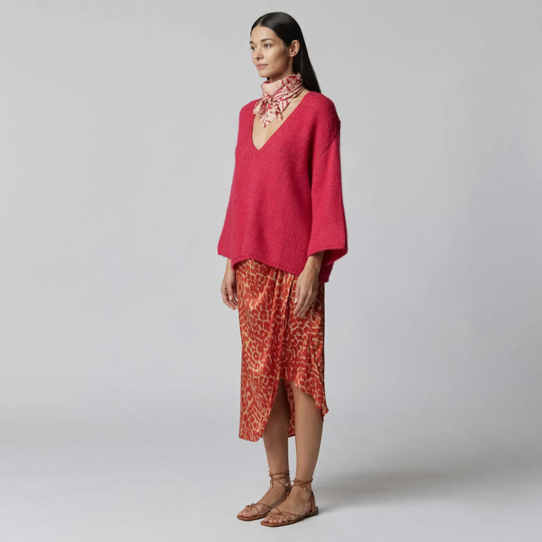 Das Material wird in der Manufaktur in Nepal per Hand aus Seidensatin gewebt. Anschließend wird der Print im Handsiebdruckverfahren auf der Seide platziert.