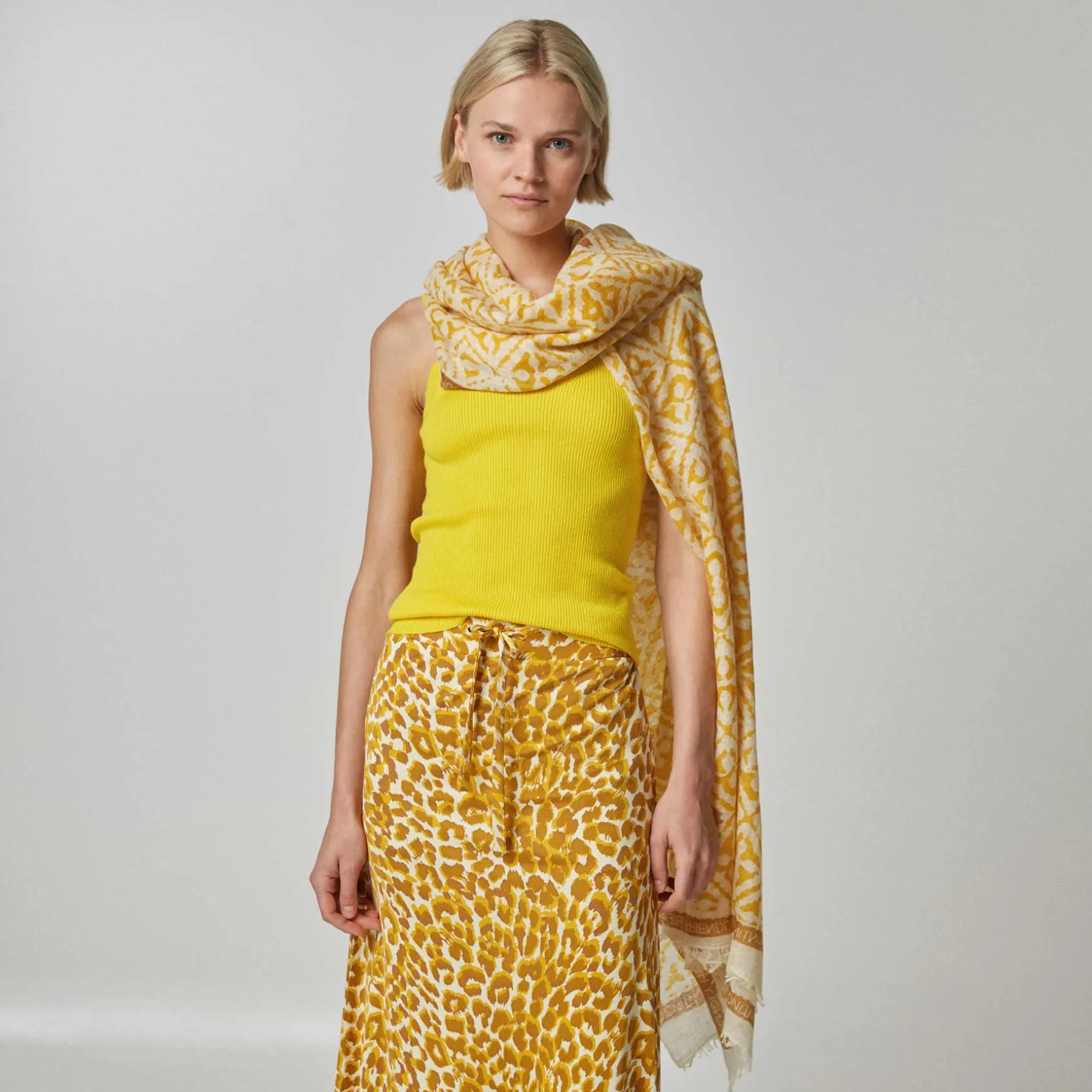 Das Material wird in der Manufaktur in Nepal aus 100% Seidenjersey gestrickt. Anschließend wird der Print im Handsiebdruckverfahren auf der Seide platziert.