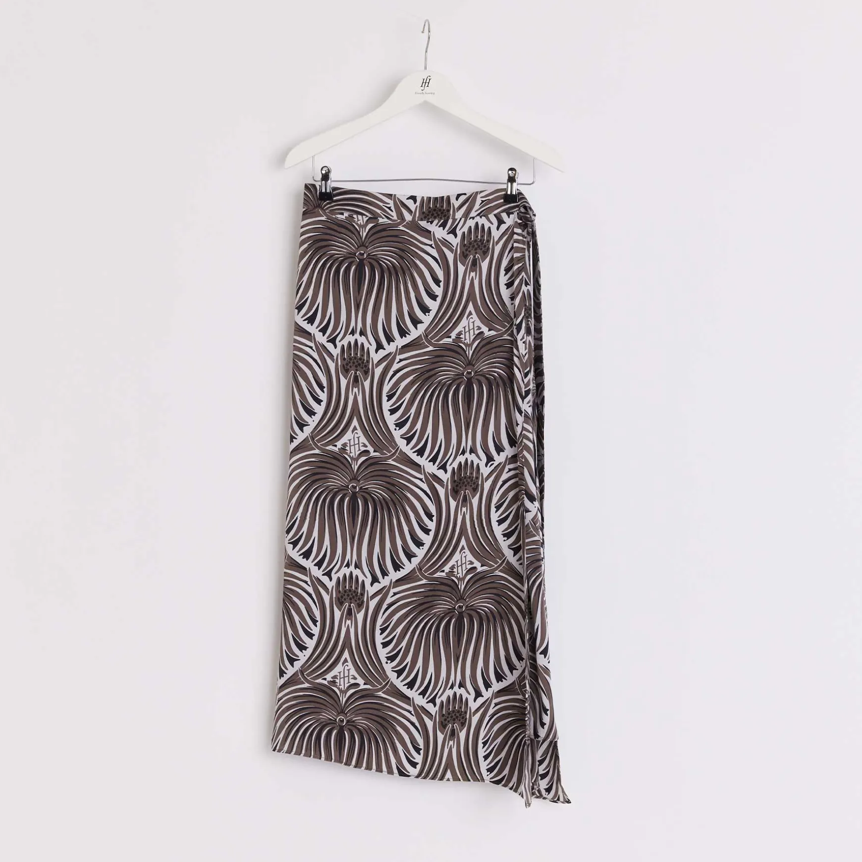 Das Material wird in der Manufaktur in Nepal per Hand aus Seidensatin gewebt. Anschließend wird der Print im Handsiebdruckverfahren auf der Seide platziert.